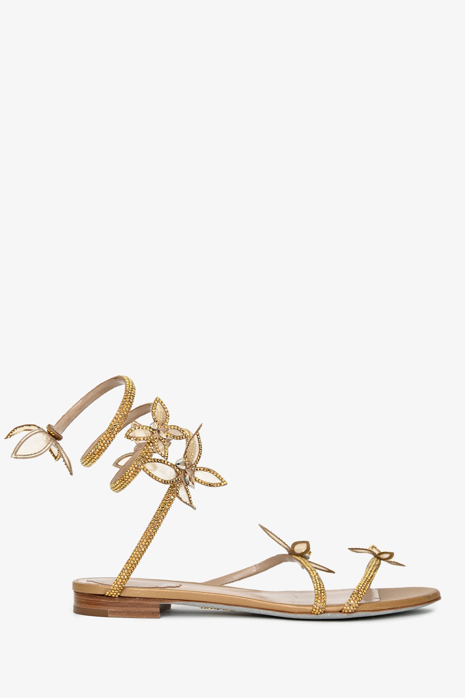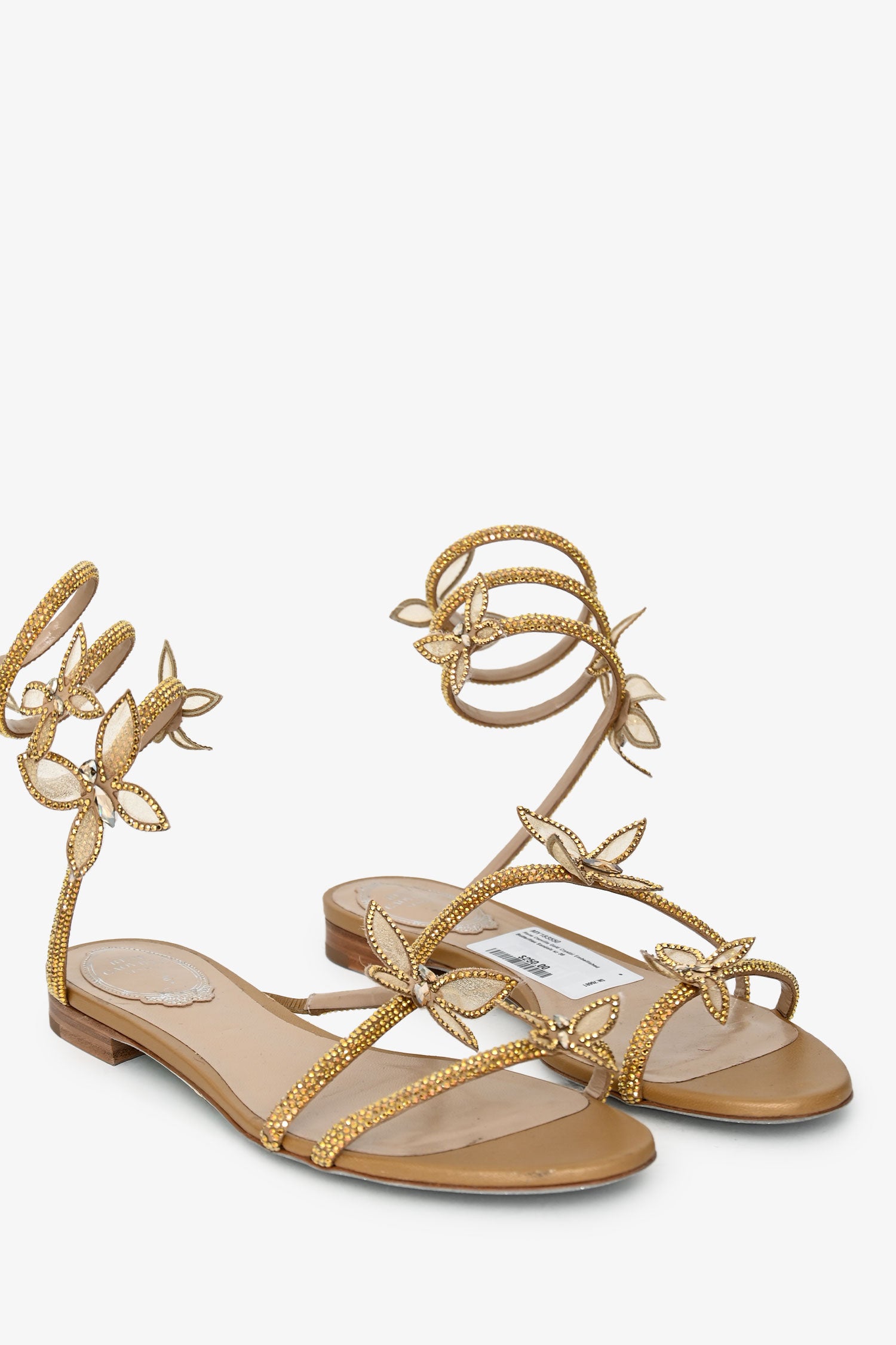 Refresh availabilityRene Caovilla Gold-Tone Crystal Embellished Butterflies Sandals. Slip-on. Round open toe. Ankle wrap-around closure. Tonal Stitching.
