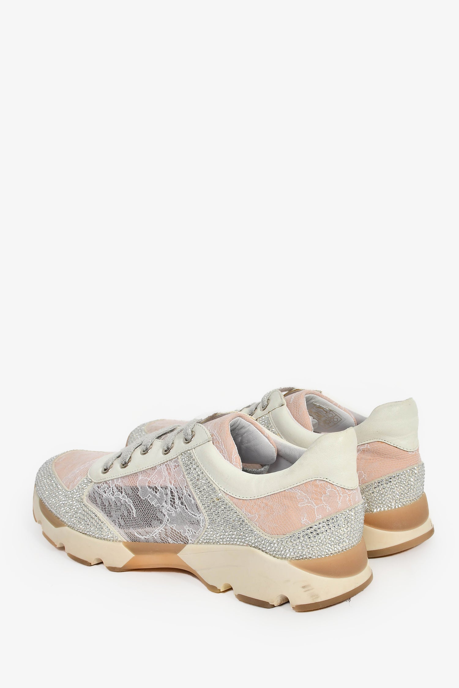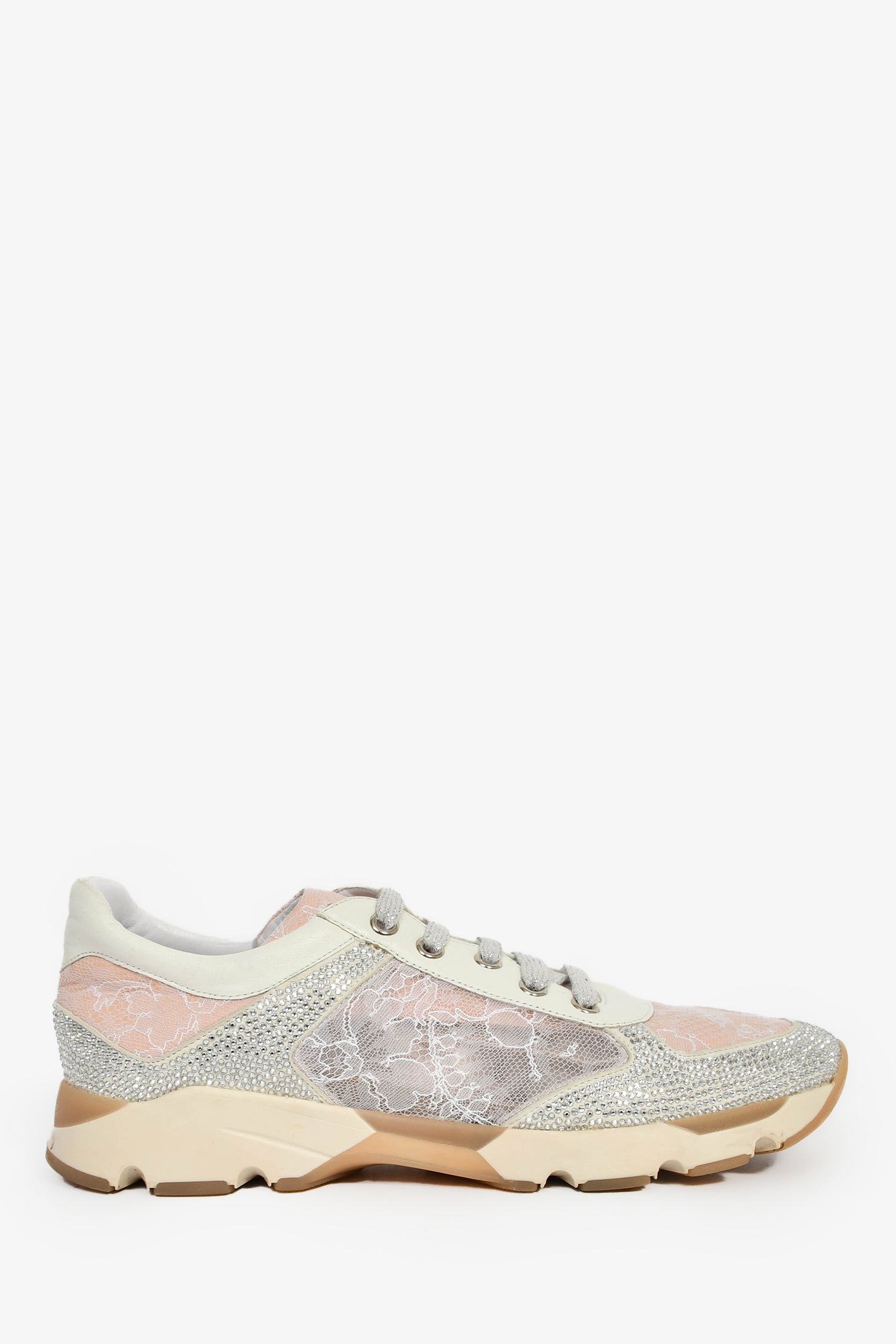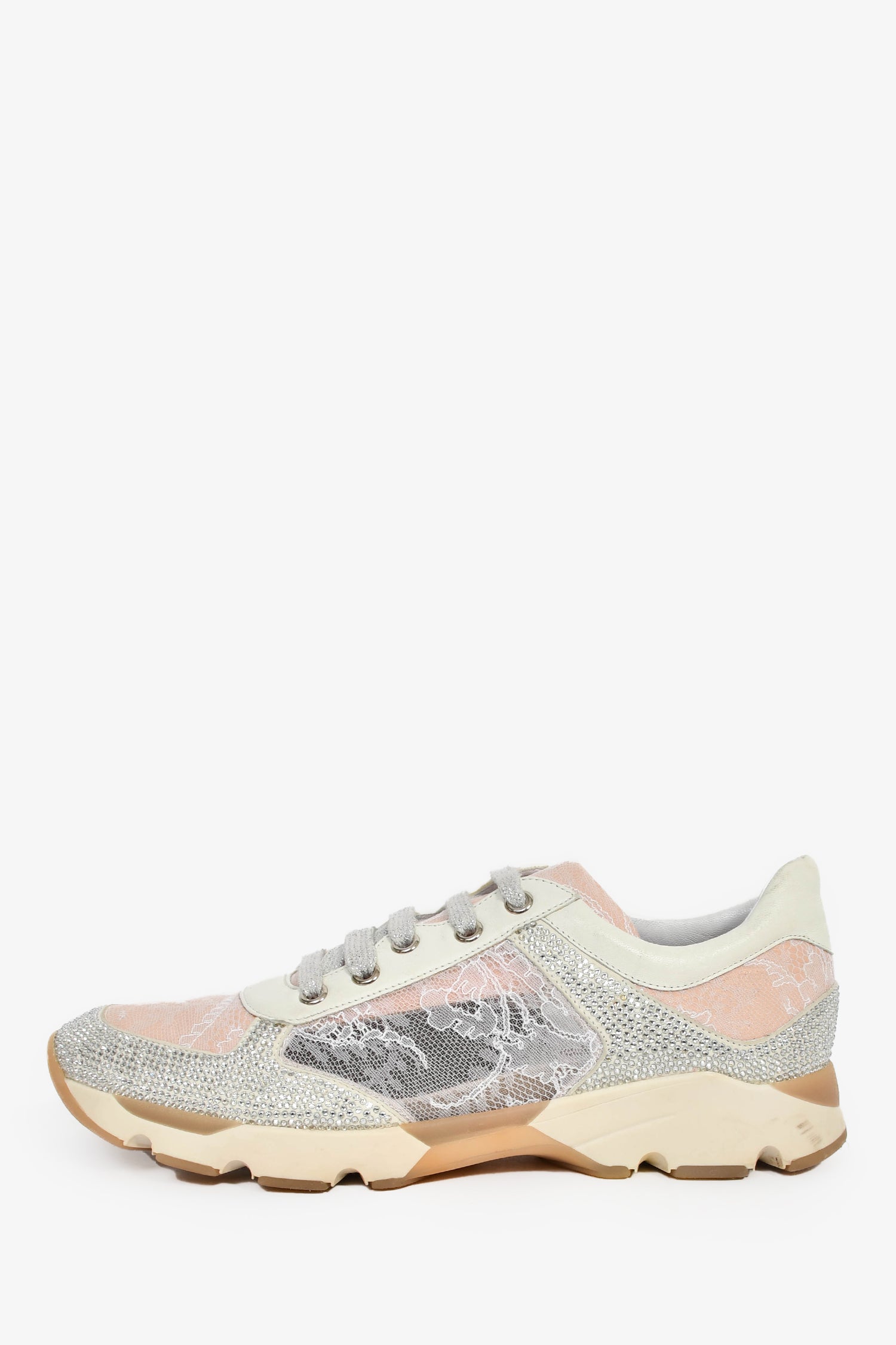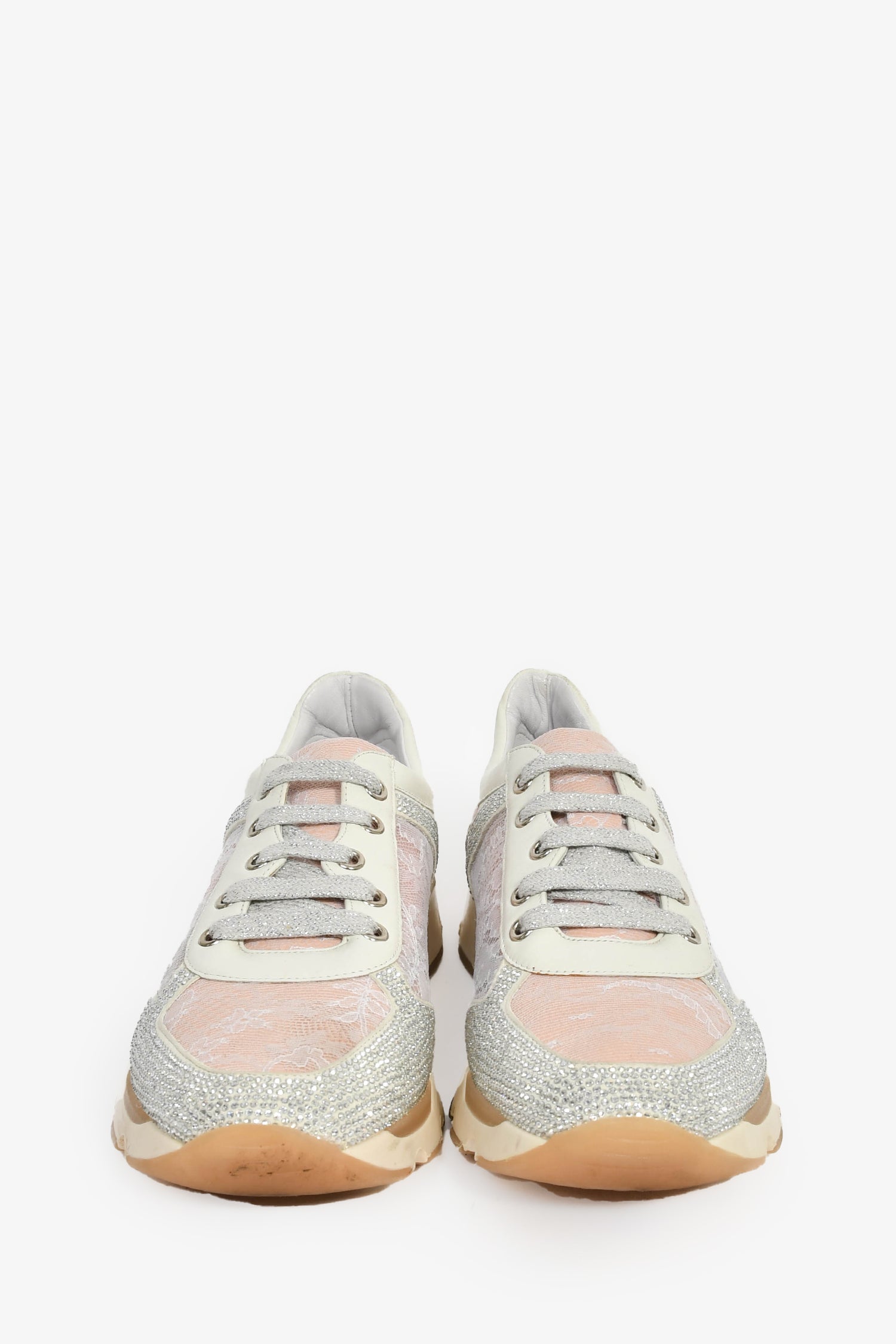 Refresh availabilityRene Caovilla Pink/Silver Lace Crystal Sneakers. Slip-on. Almond toe. Front lace-up closure. Silver-tone hardware. Tonal stitching.