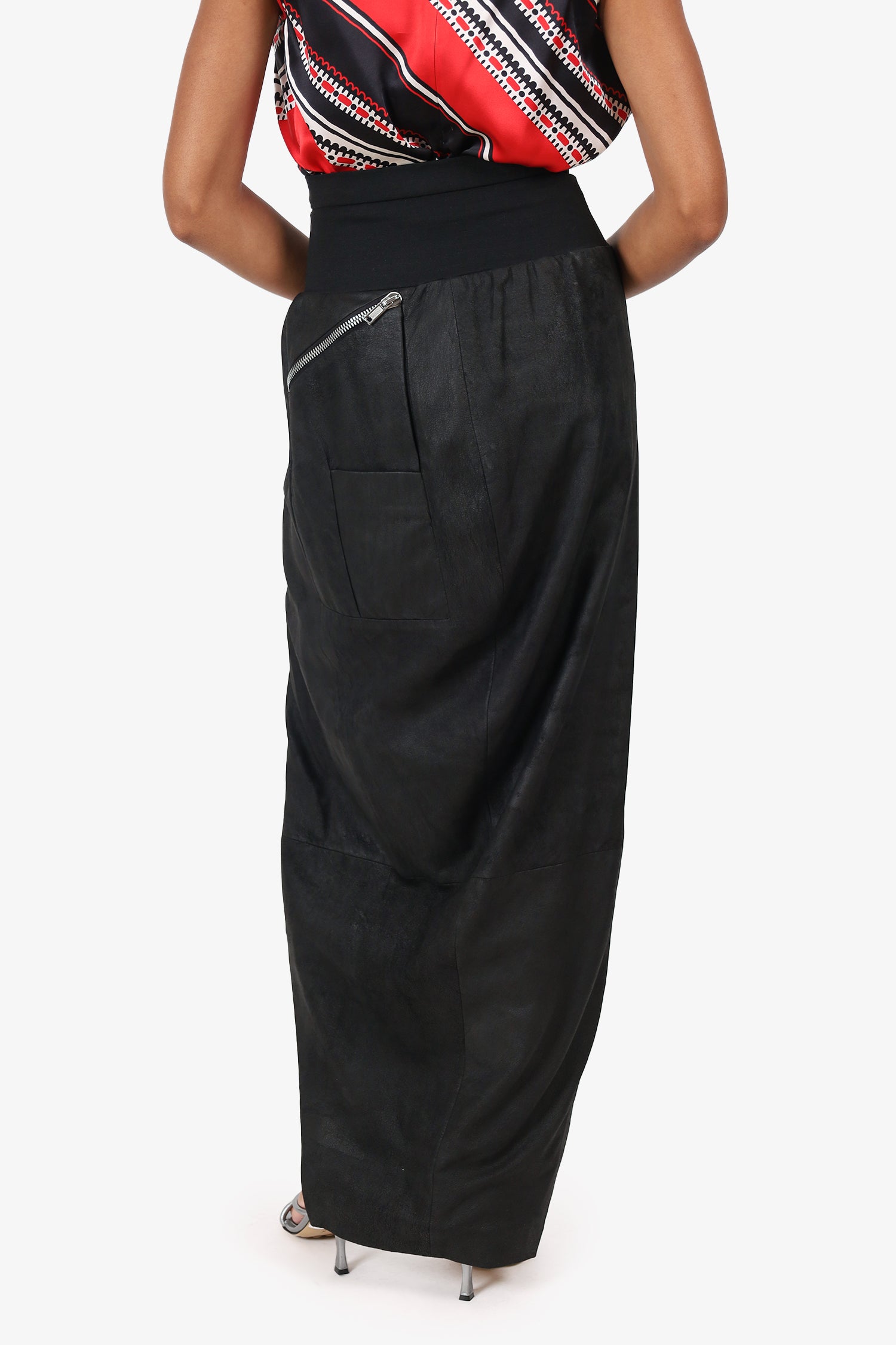 Refresh availabilityRick Owens Black Leather Side Slit Maxi Skirt. Slip-on. Elasticated waistband. Bottom right slit. 2 front exterior pockets; 1 zip and 1 slip. Lined interior. Silver-tone hardware. Tonal stitching.