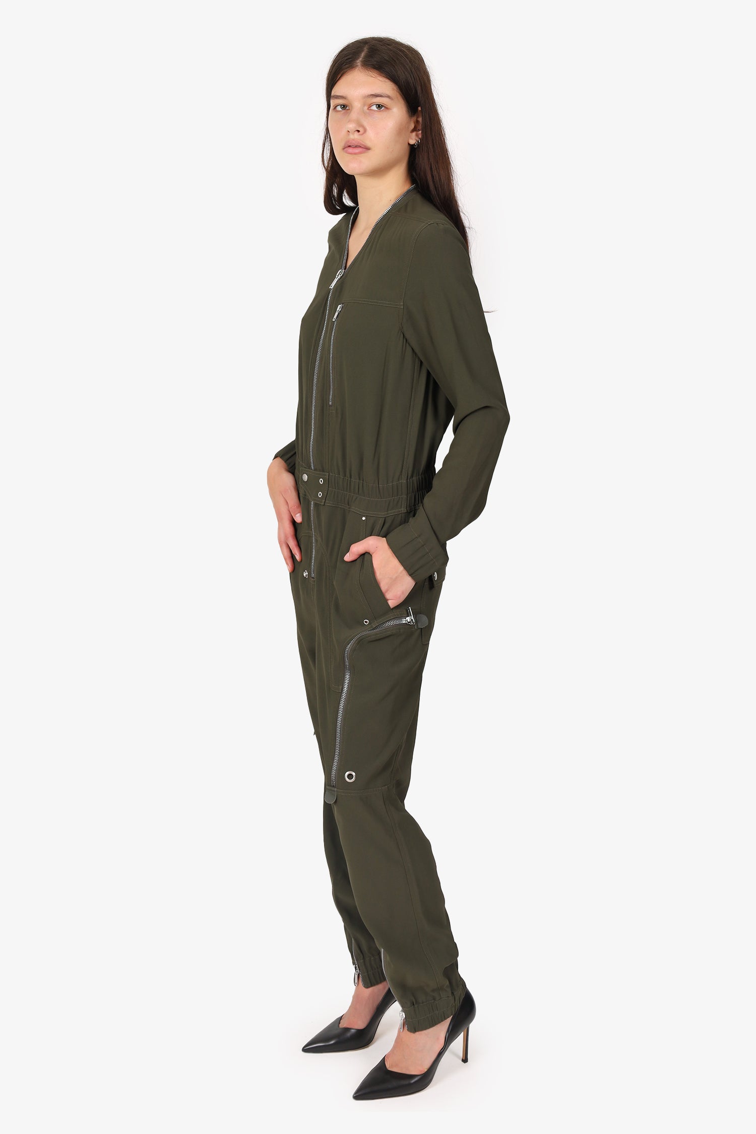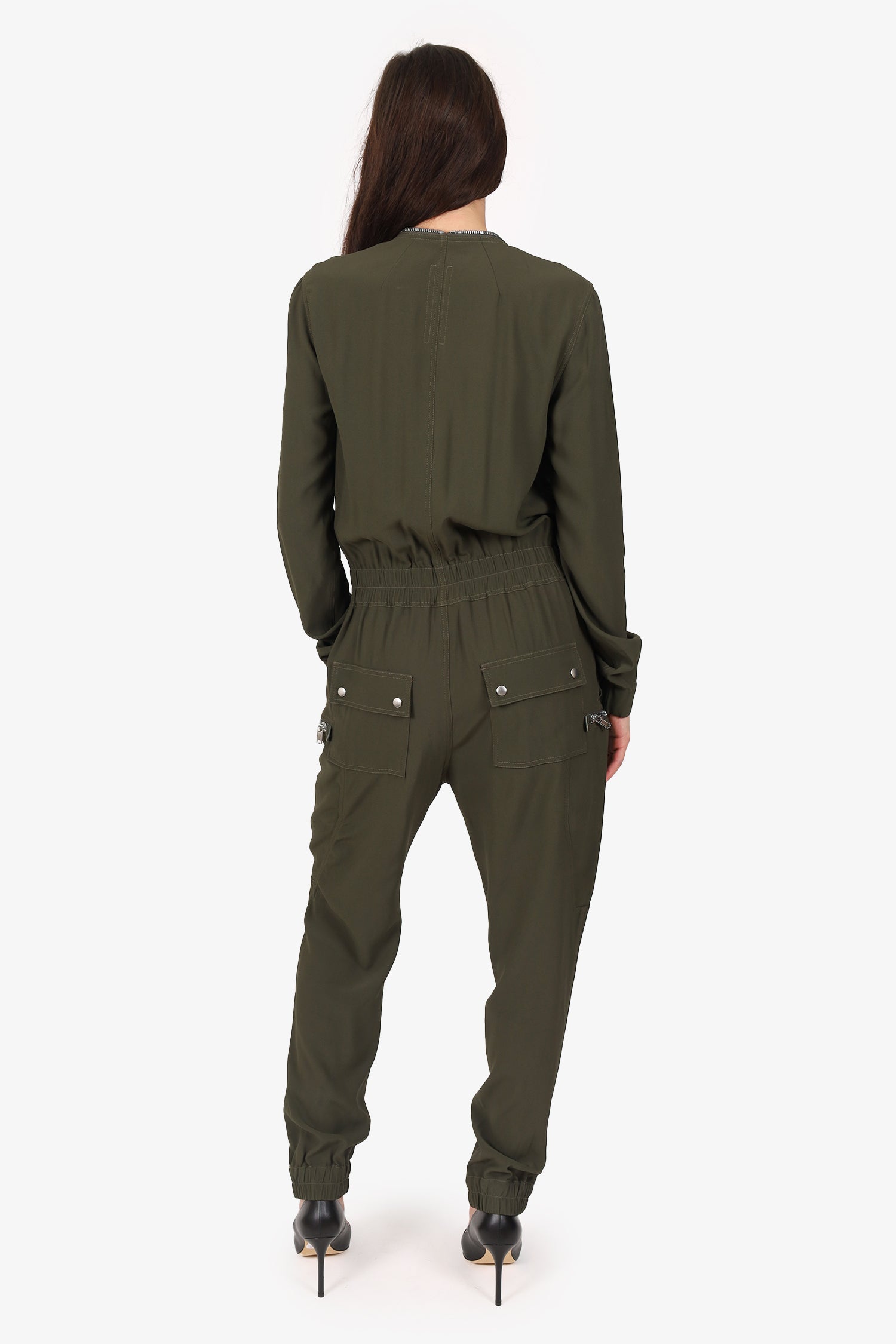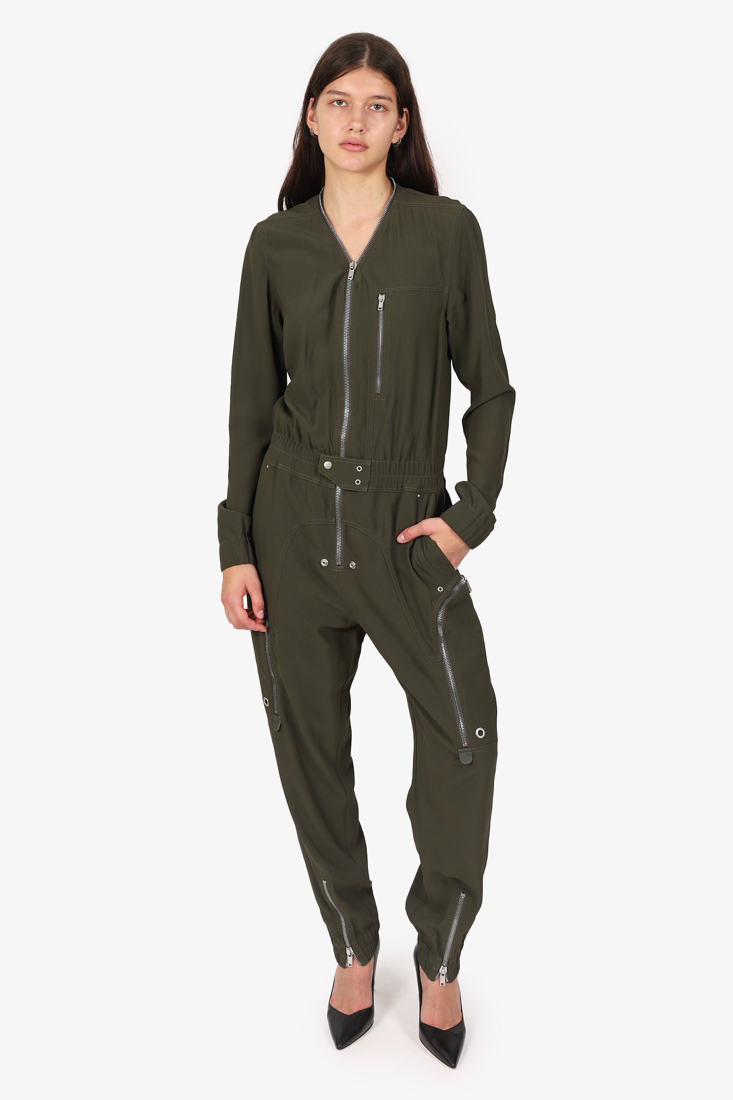 Refresh availabilityRick Owens Green Bauhaus Larry Tapered Poplin Jumpsuit. Slip on. V-neckline. Front zip closure. Elasticated waistband with front snap-button closure. Elasticated sleeve cuffs. 7 exterior pockets; front chest zip, 2 side slip, 2 side zip, and 2 rear flap with snap-button closure. Elasticated ankle cuffs with zip closure. Silver-tone hardware. Tonal stitching.