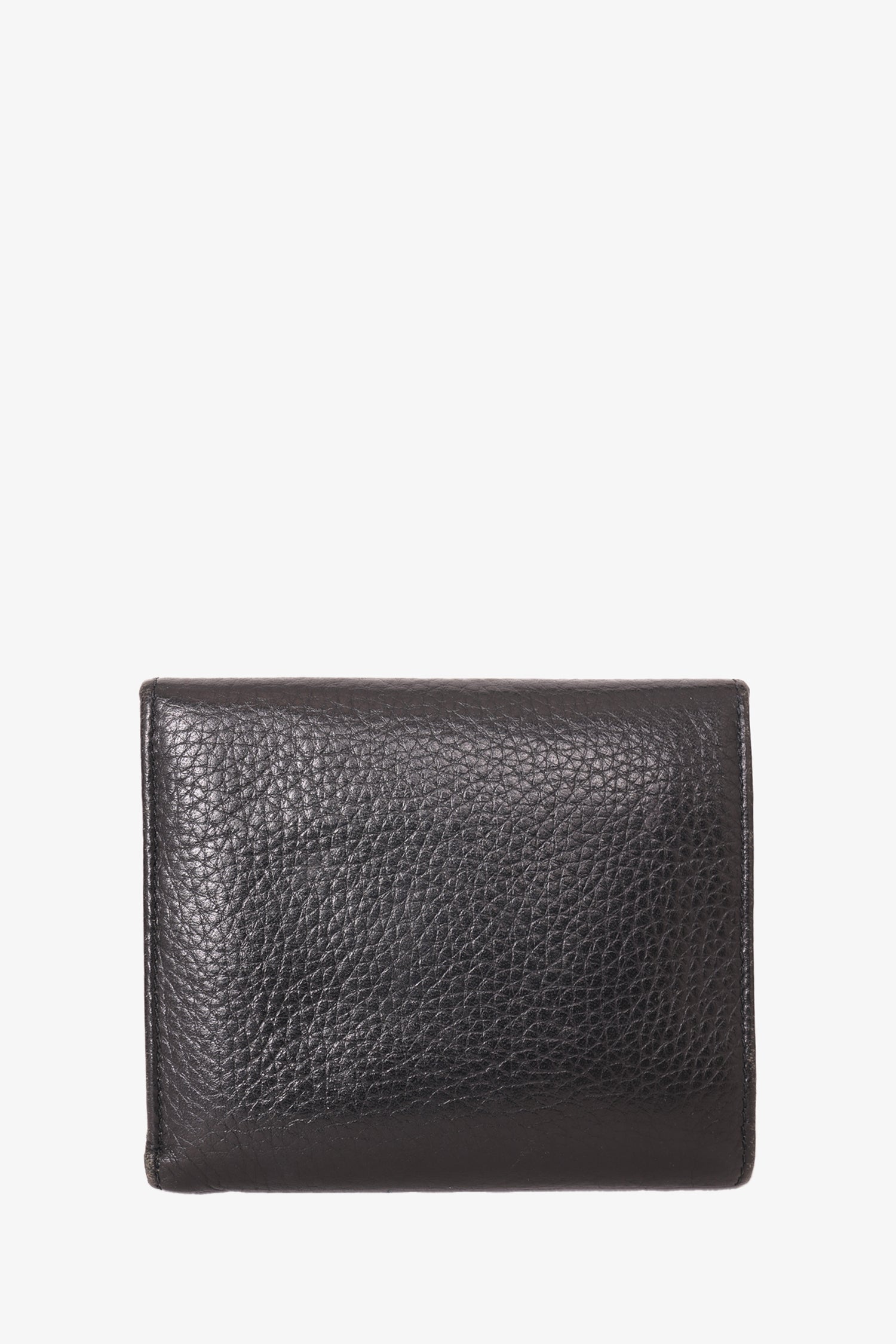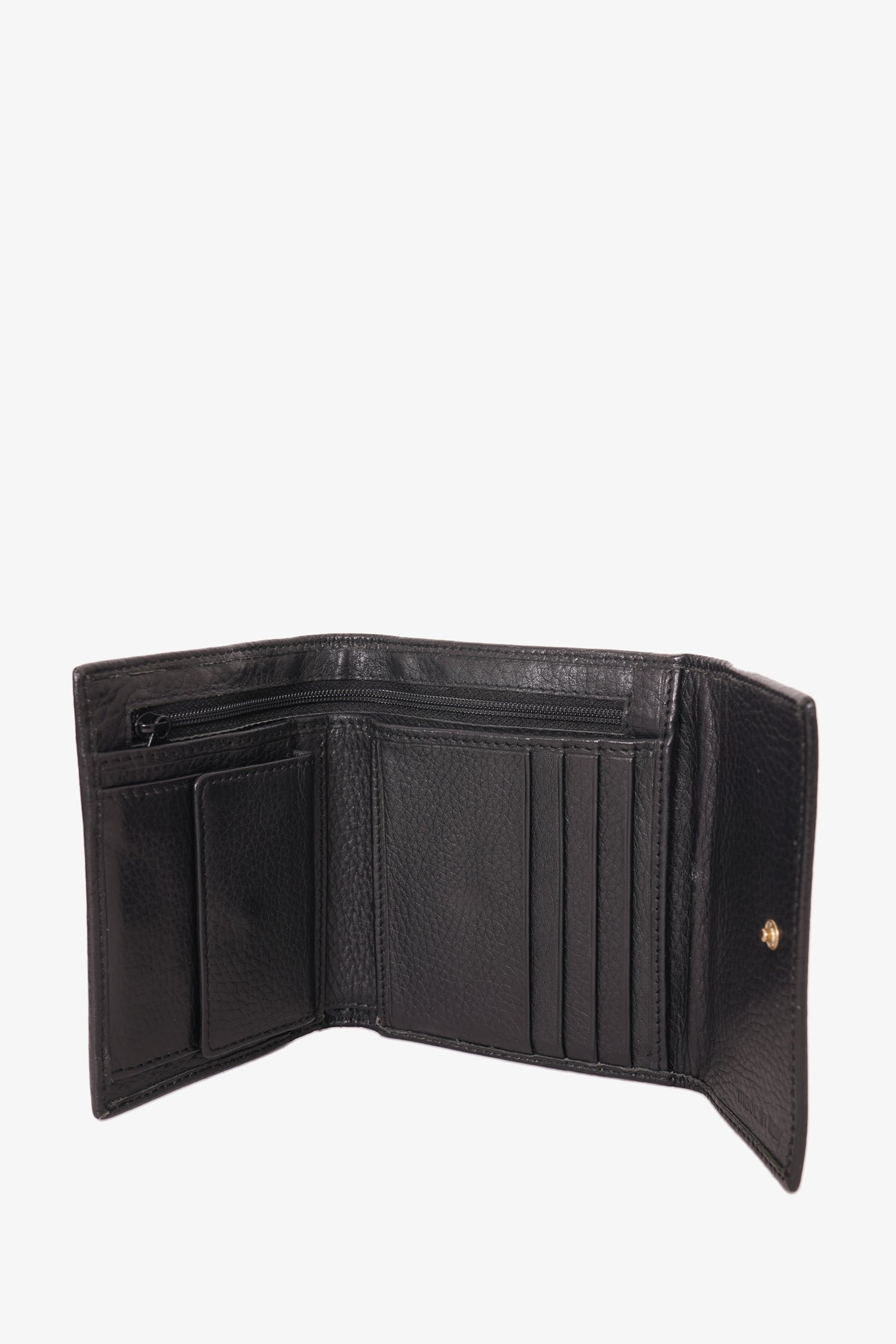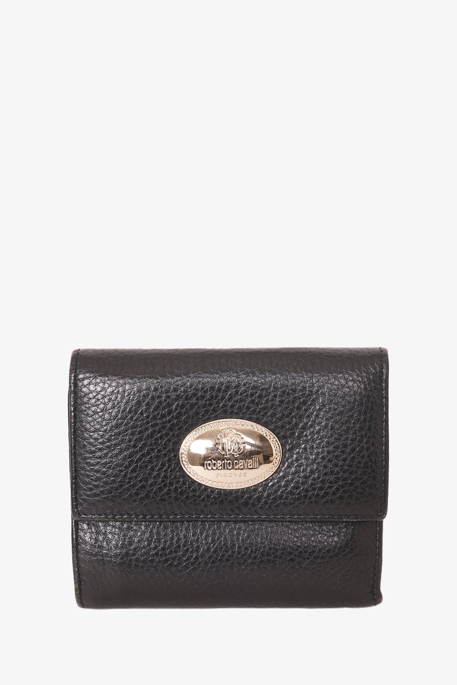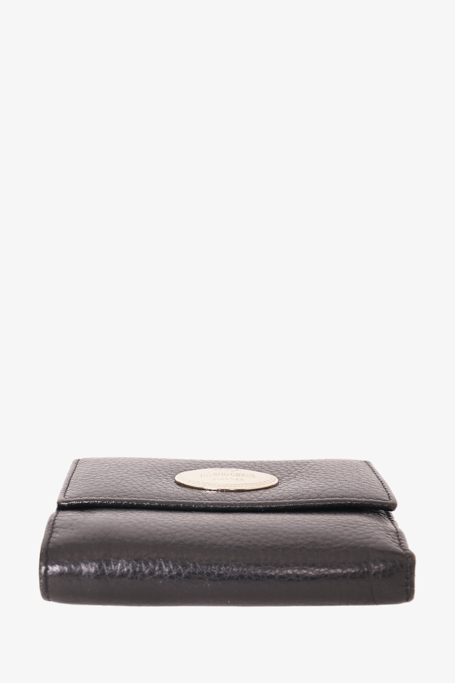 Roberto Cavalli Black Leather Bifold Wallet. Fold-over flap with snap closure. 7 card slots. Coin compartment with snap closure. 2 bill compartments; 1 with zip closure and 1 slip compartment. Silver-toned hardware. Tonal stitching.