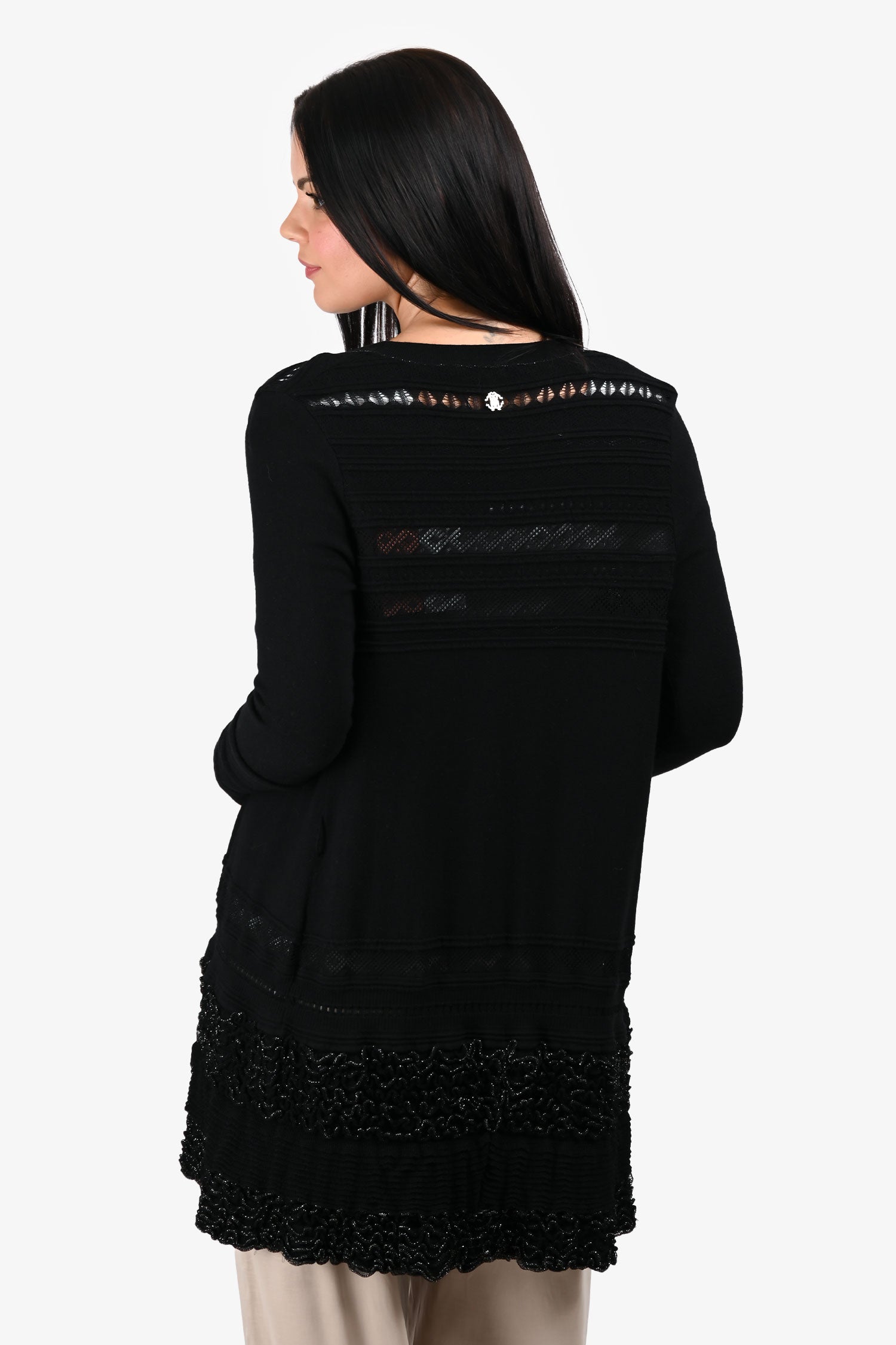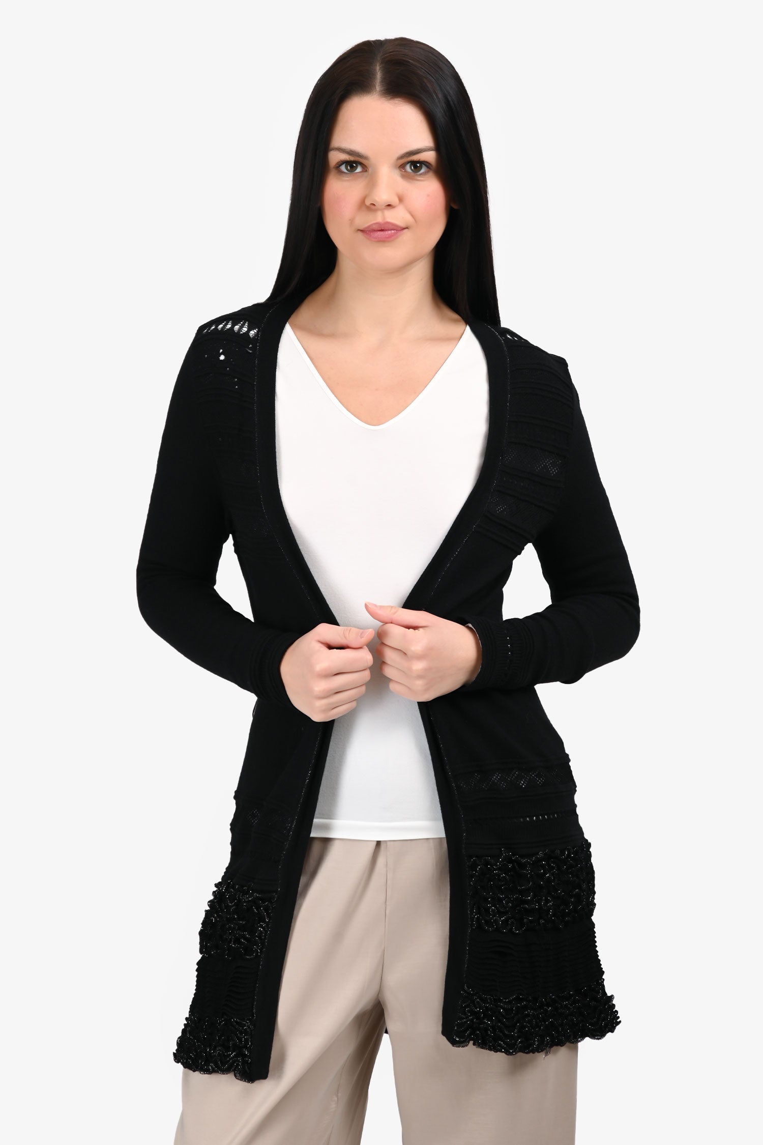 Refresh availabilityRoberto Cavalli Black Wool Ruffle Detailed Long Cardigan. Open front design. Ribbed cuffs and hem. Tonal stitching.