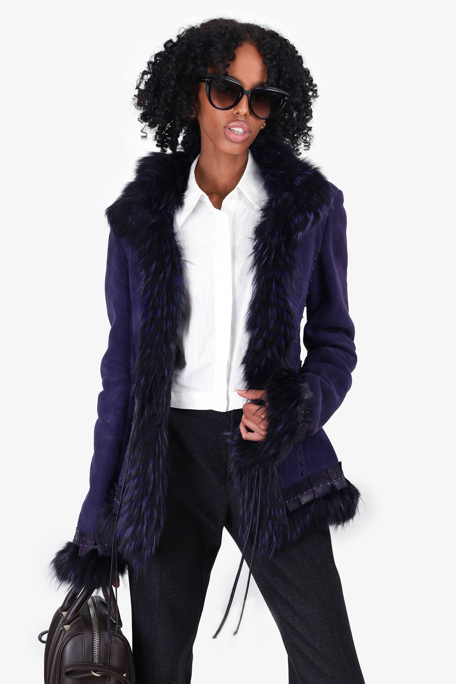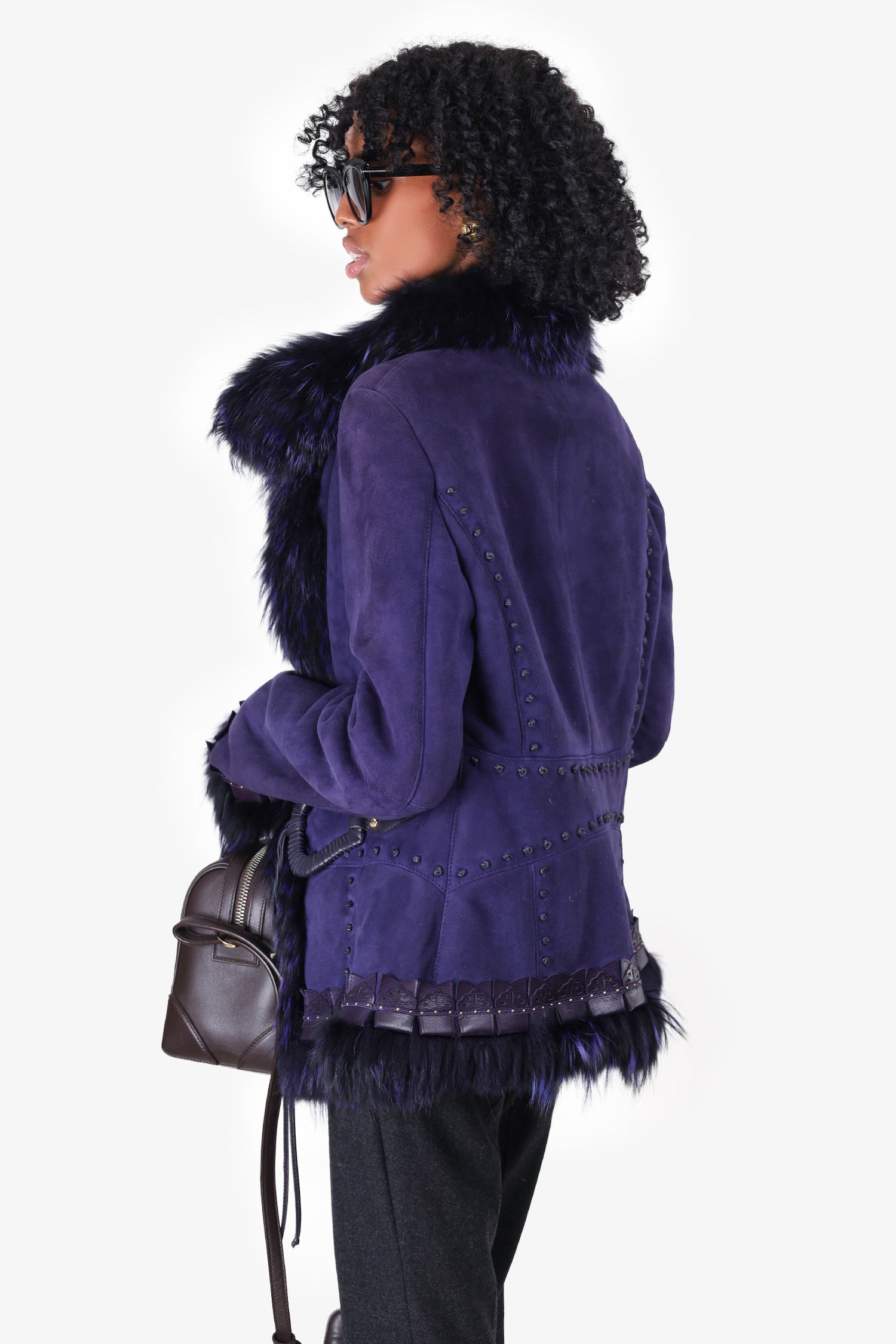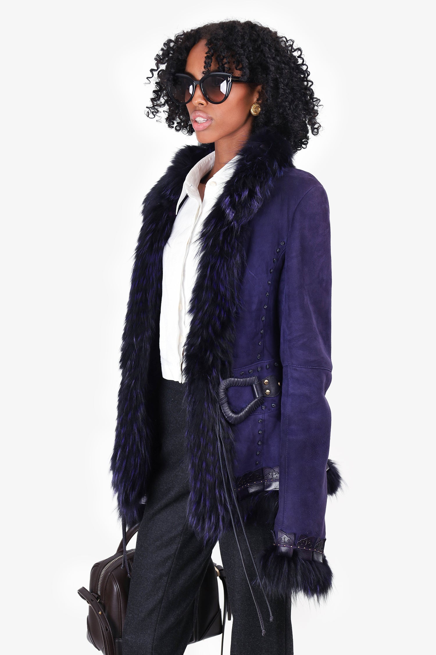 Refresh availabilityRoberto Cavalli Purple Suede Fox Fur Jacket. Gold-tone hardware. Front belt-tie detailing/closure. Lined. Tonal stitching.