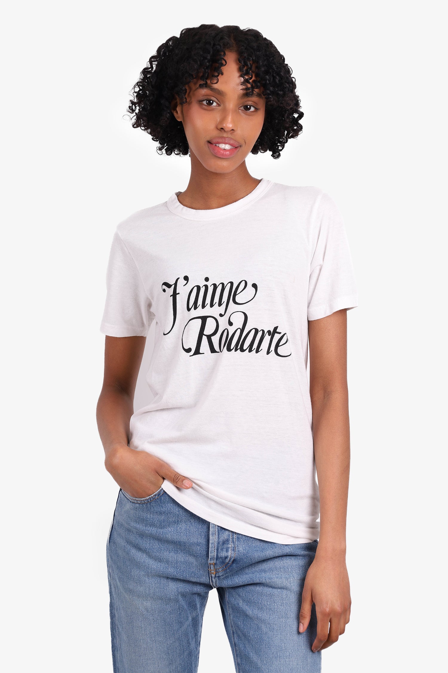 Refresh availabilityRodarte White/Black 'J'aime Rodarte' T-Shirt. Round neckline. Front: "J'aime Rodarte", Back: "Je deteste Rodarte". Tonal stitching.