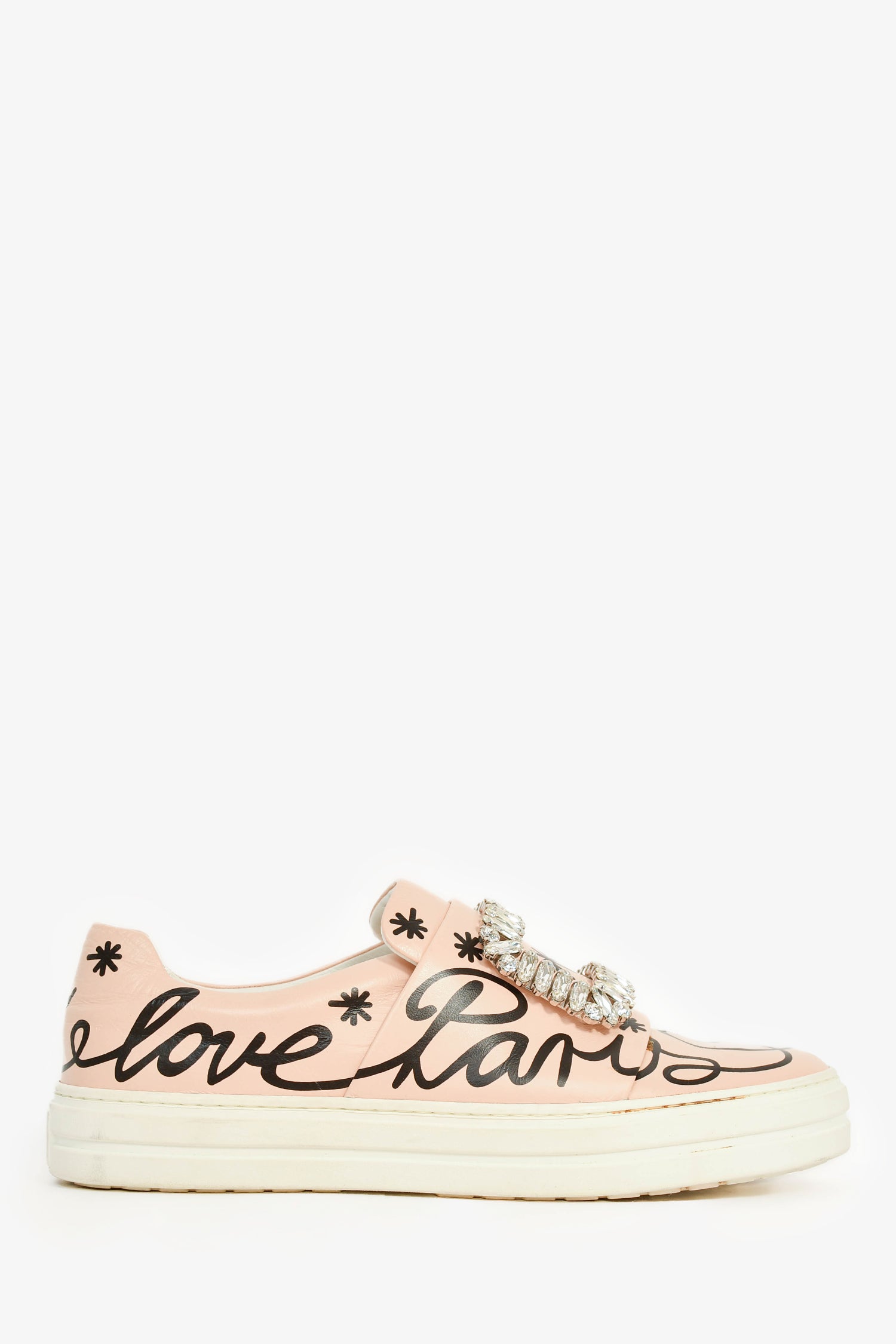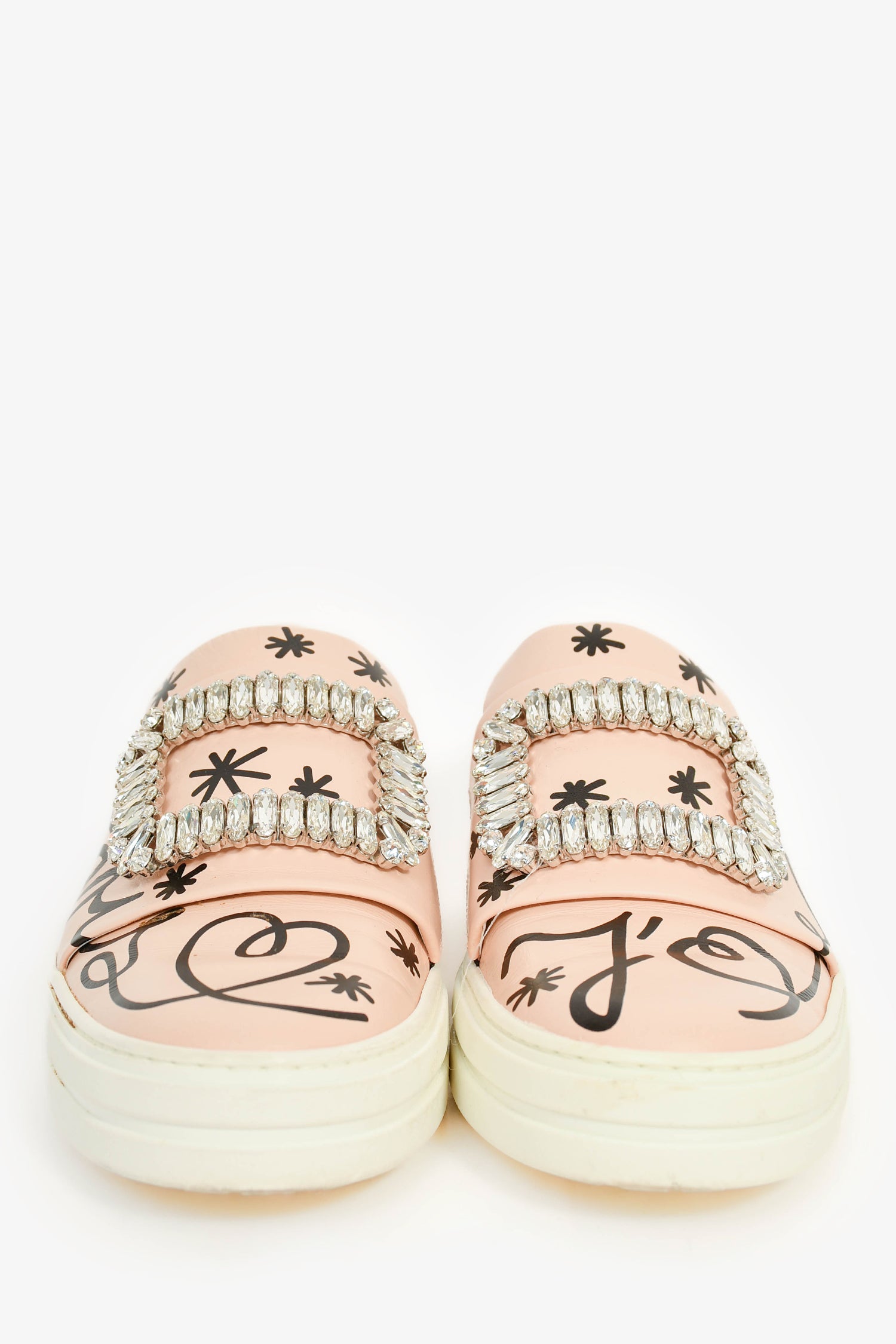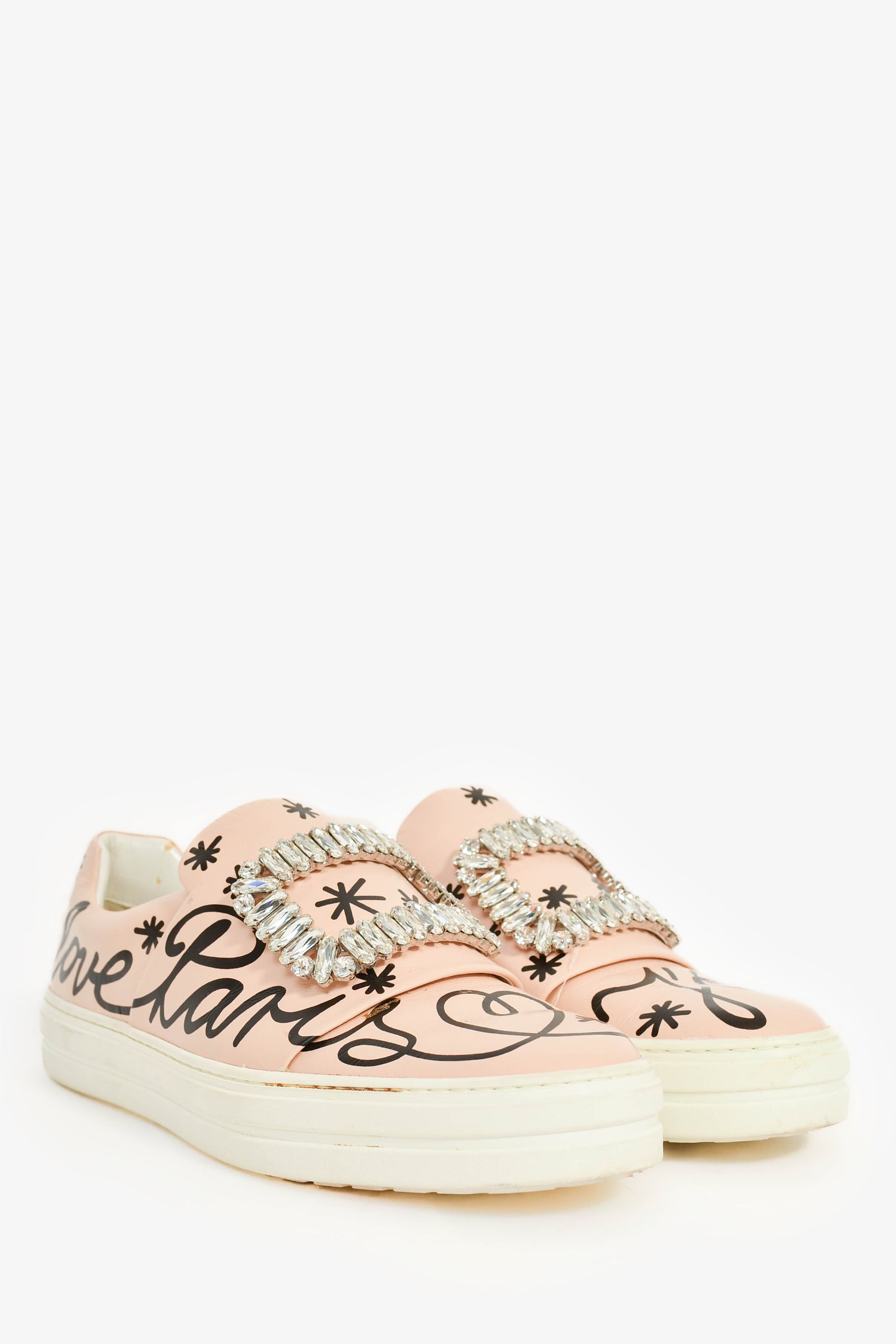 Roger Vivier Pink Leather Crystal Buckle Black Printed Sneakers Size 37