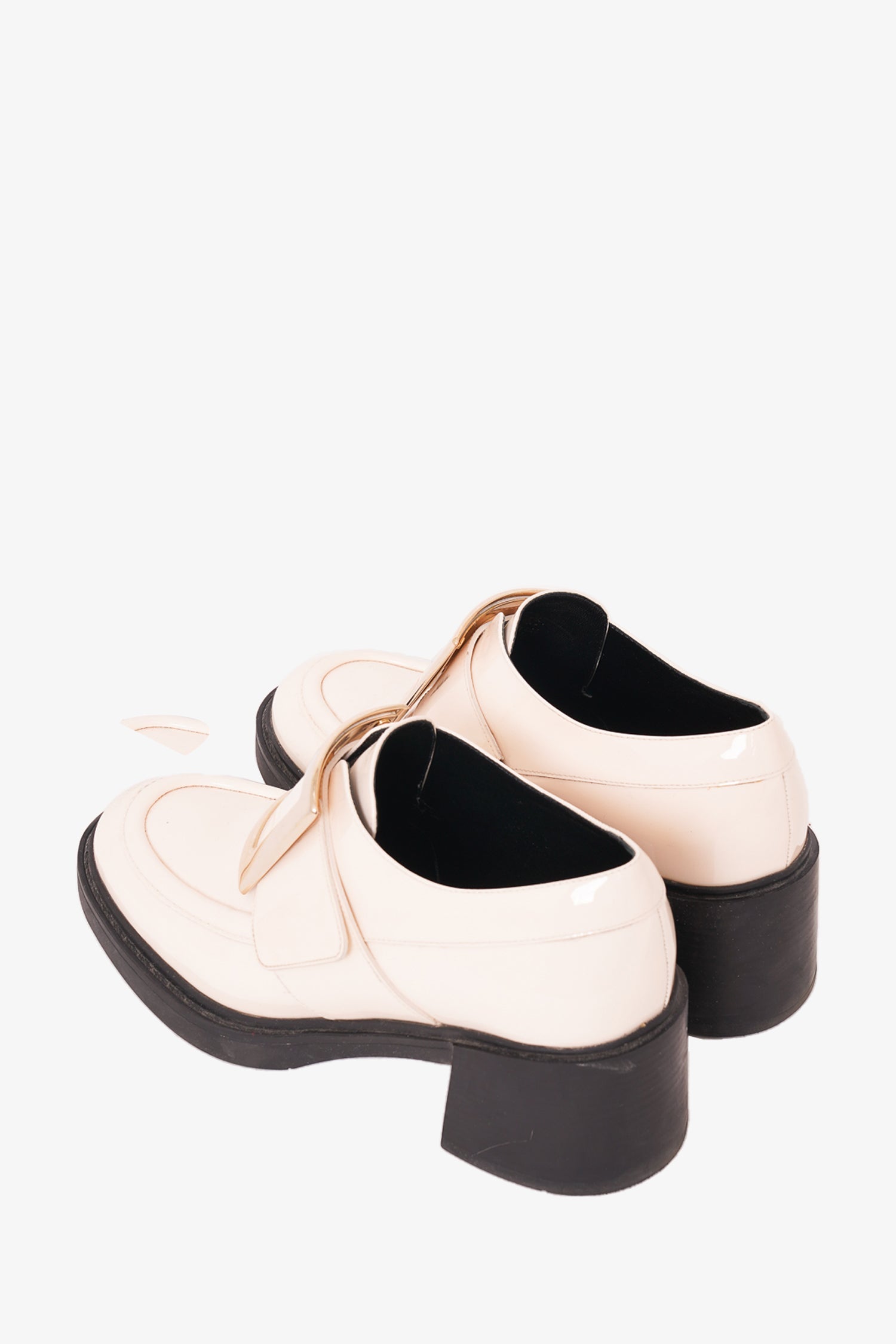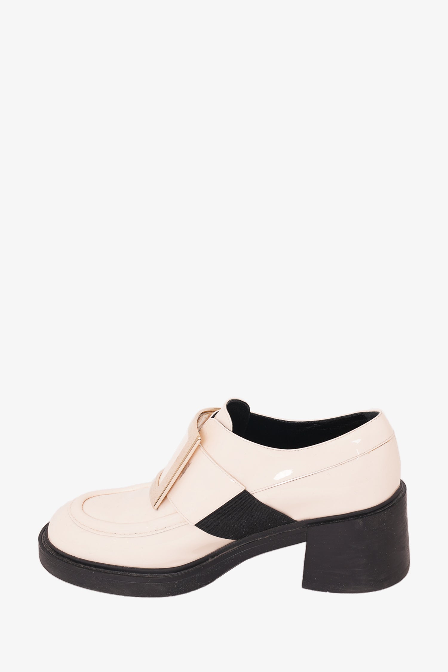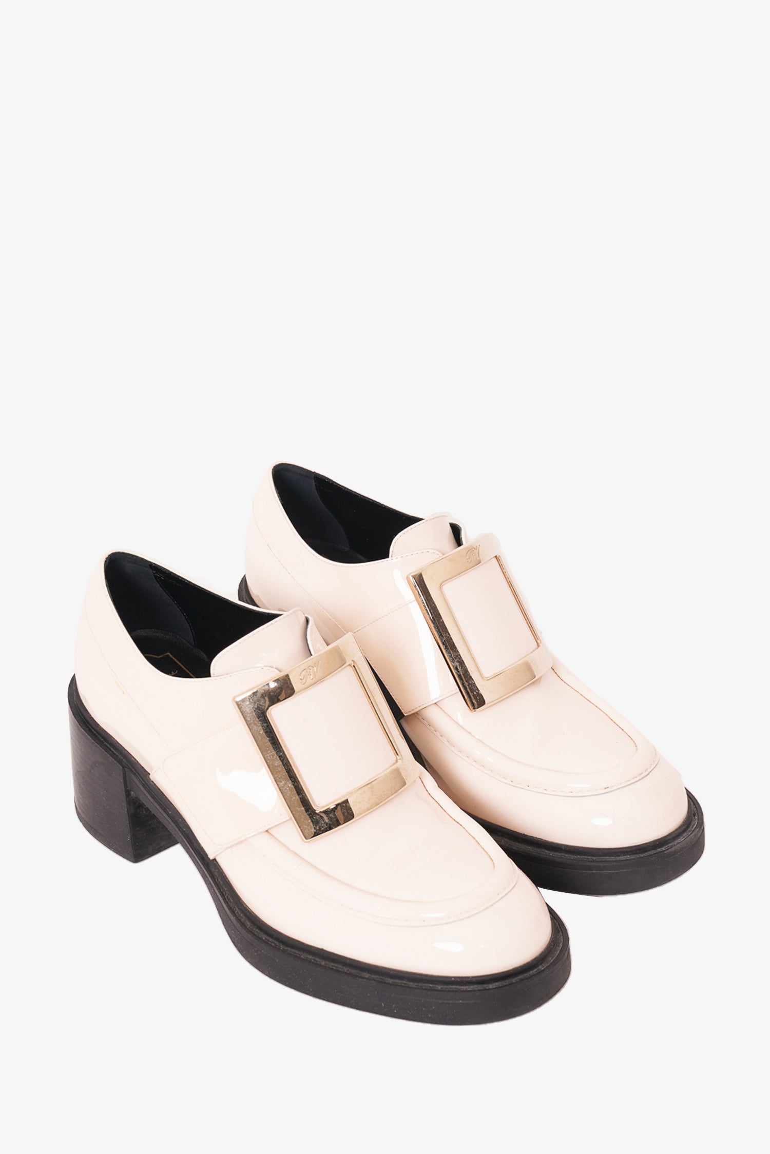 Refresh availabilityRoger Vivier Beige Patent Viv' Rangers Loafer. Round toe. Block heel. Gold-toned buckle detail. Tonal stitching.