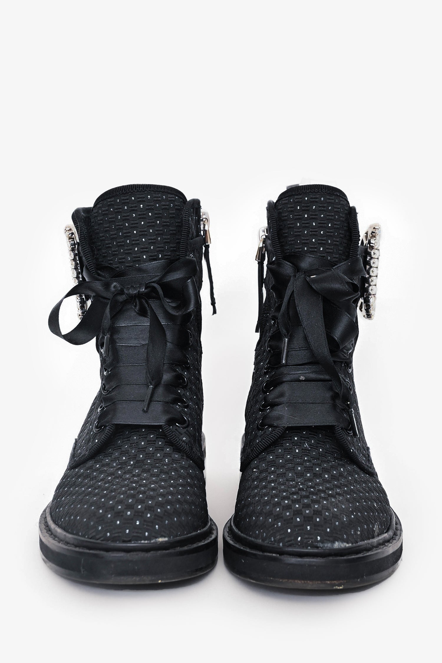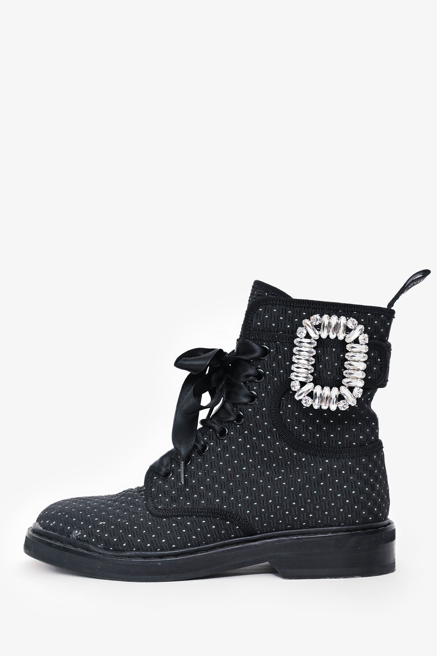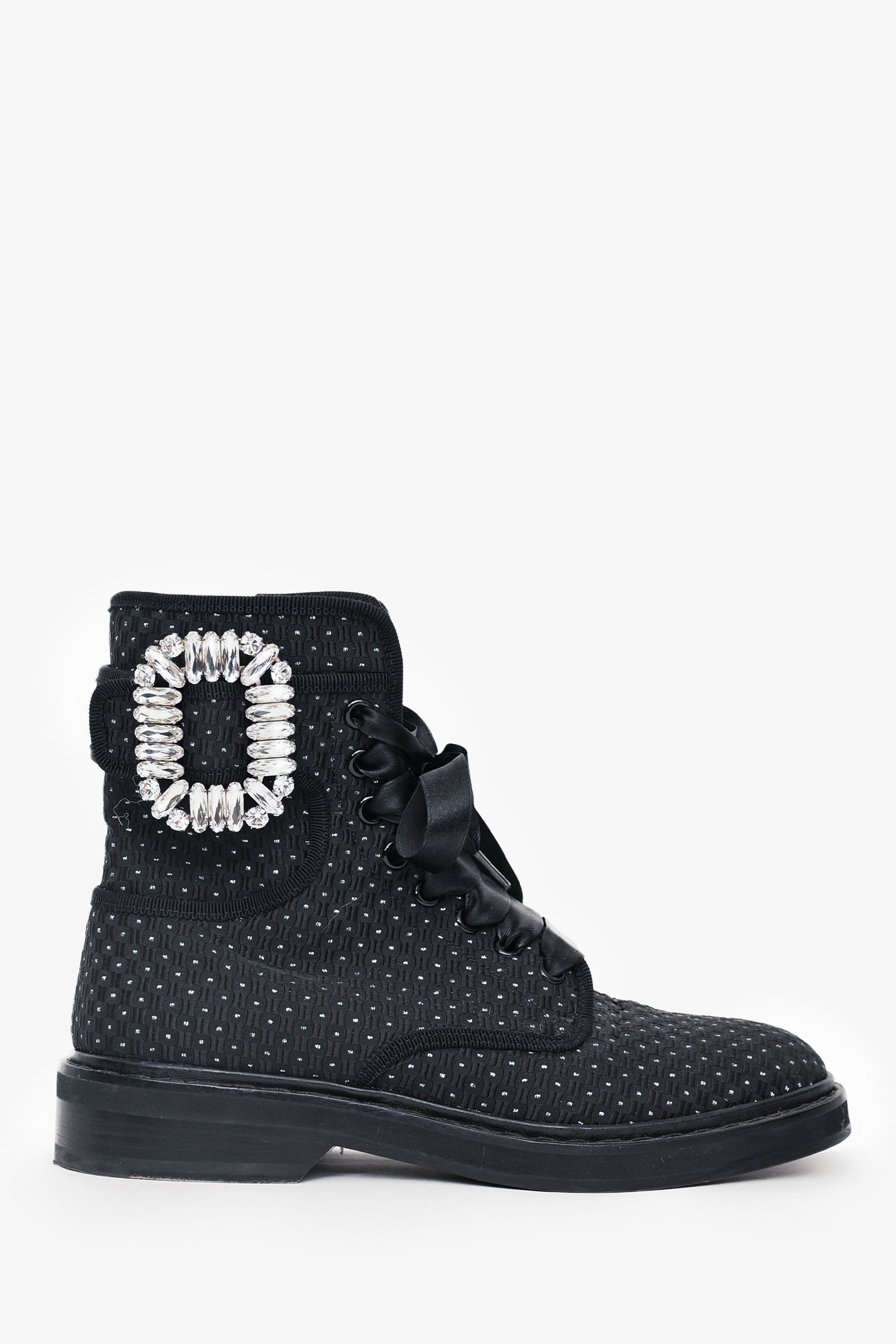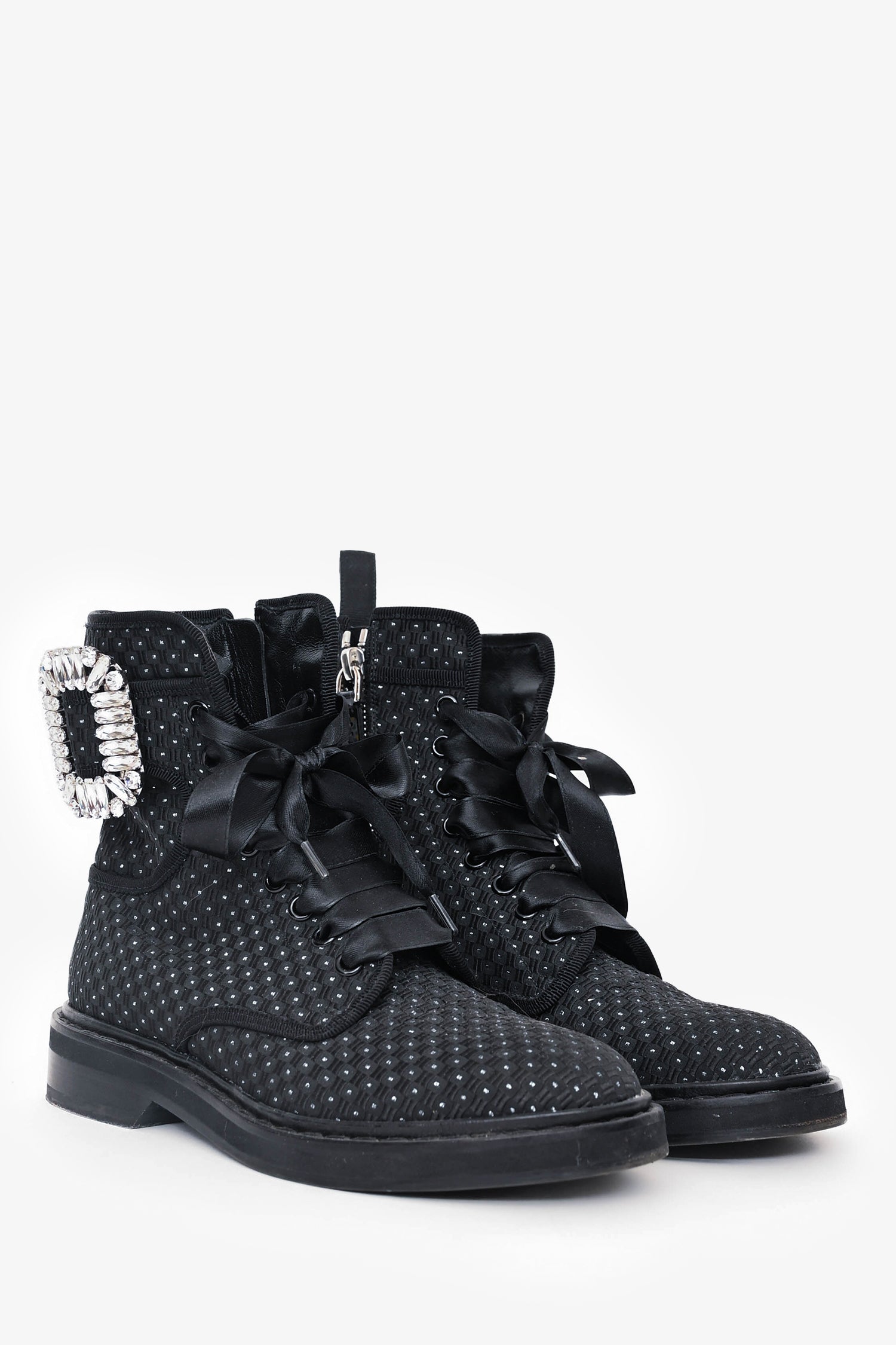 Roger Vivier Black Canvas Crystal Buckle Lace-Up Ankle Boots Size 35
