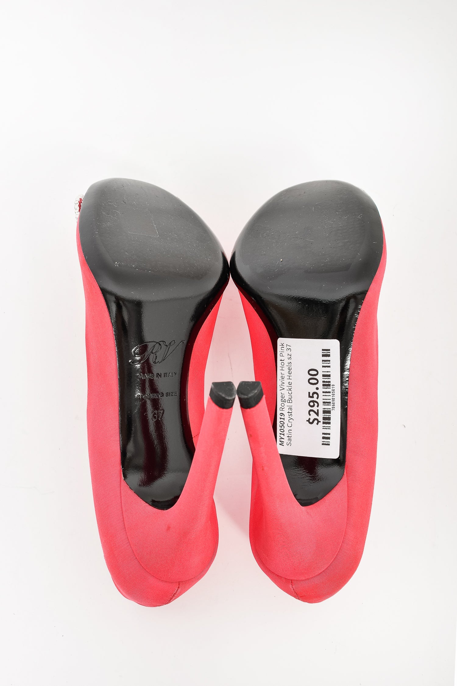 Refresh availabilityRoger Vivier Hot Pink Satin Crystal Buckle Heels. Slip-on. Round toe. Skinny heel. Tonal stitching.