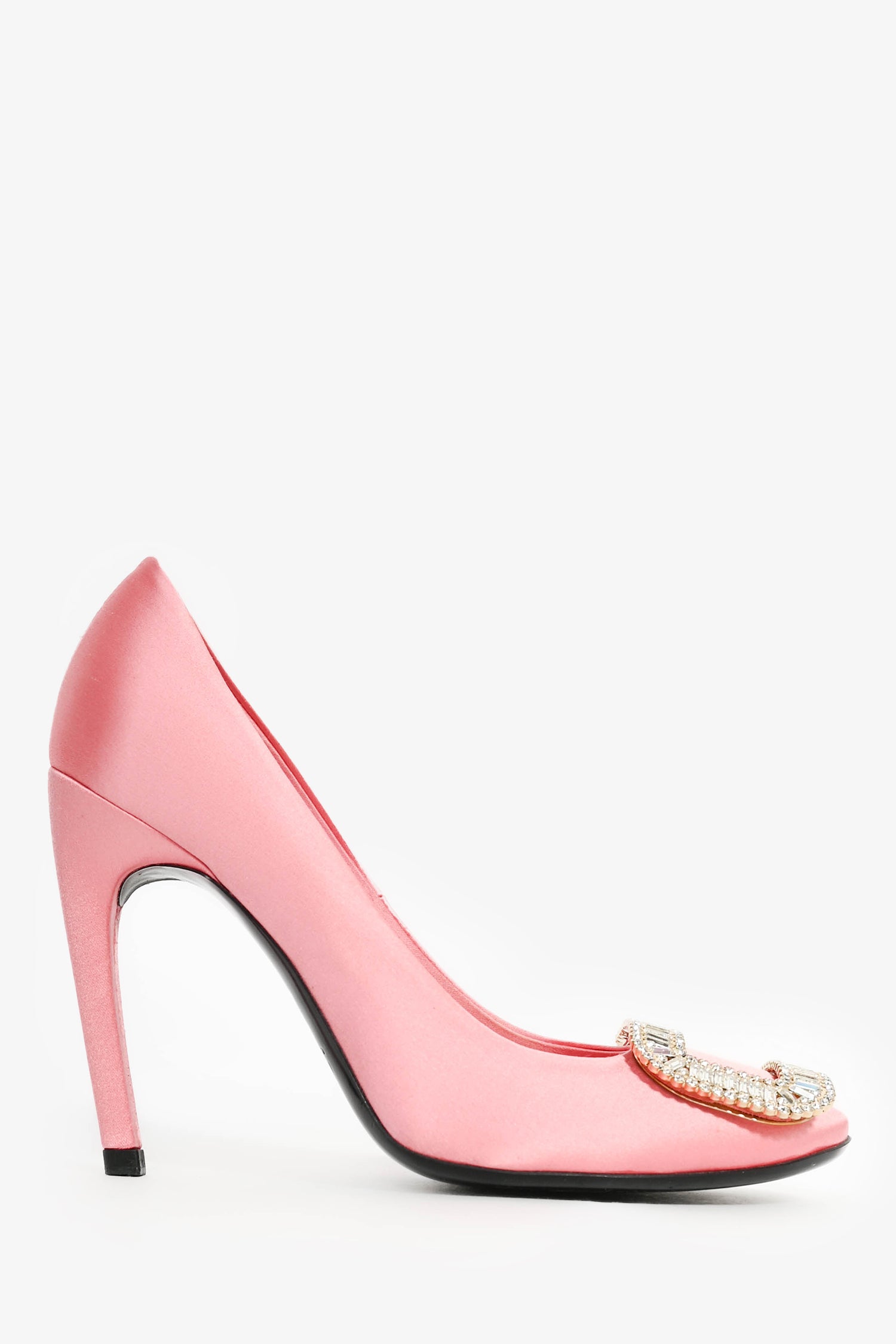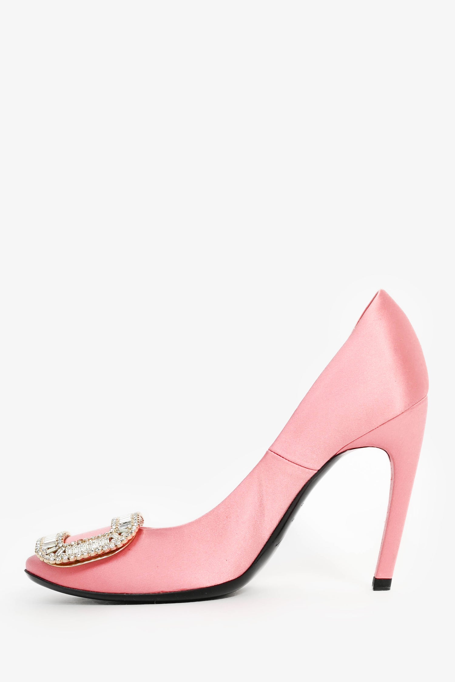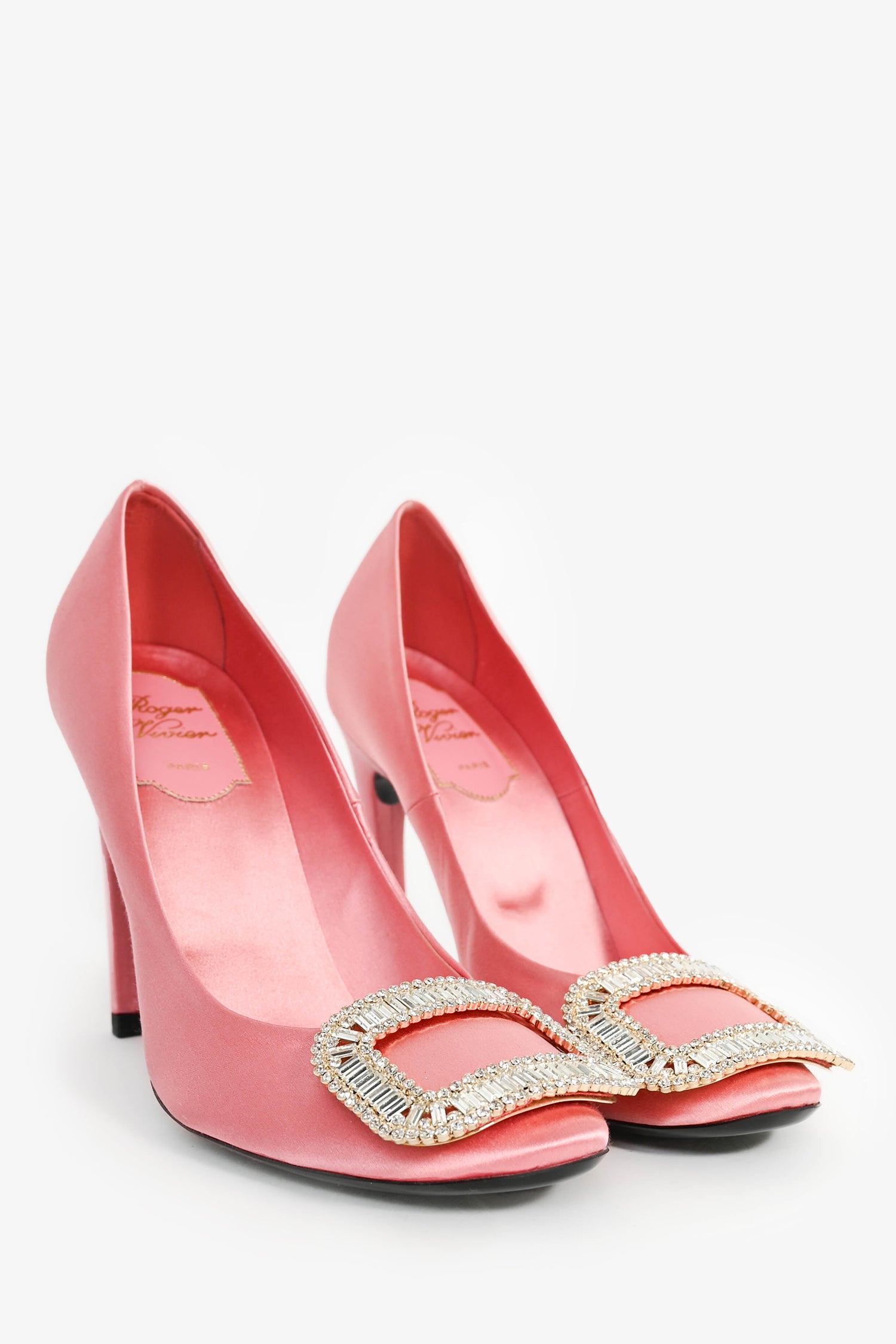 Refresh availabilityRoger Vivier Pink Satin Crystal Buckle 'Trompette' Heels. Round toe. Covered satin exterior and interior. Tonal stitching.