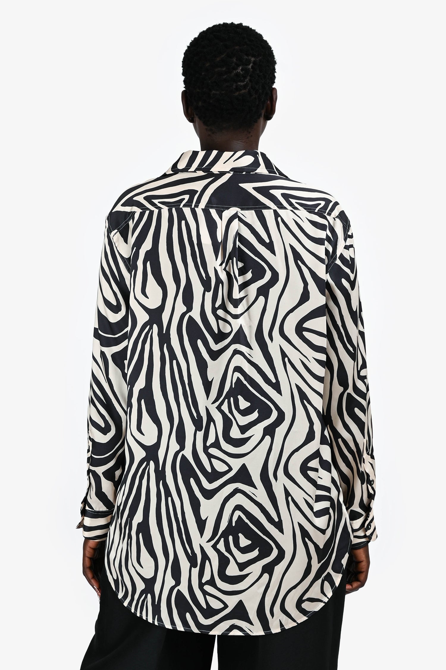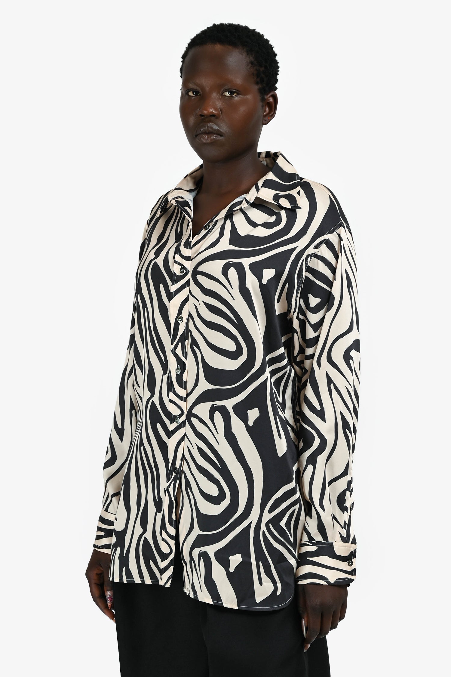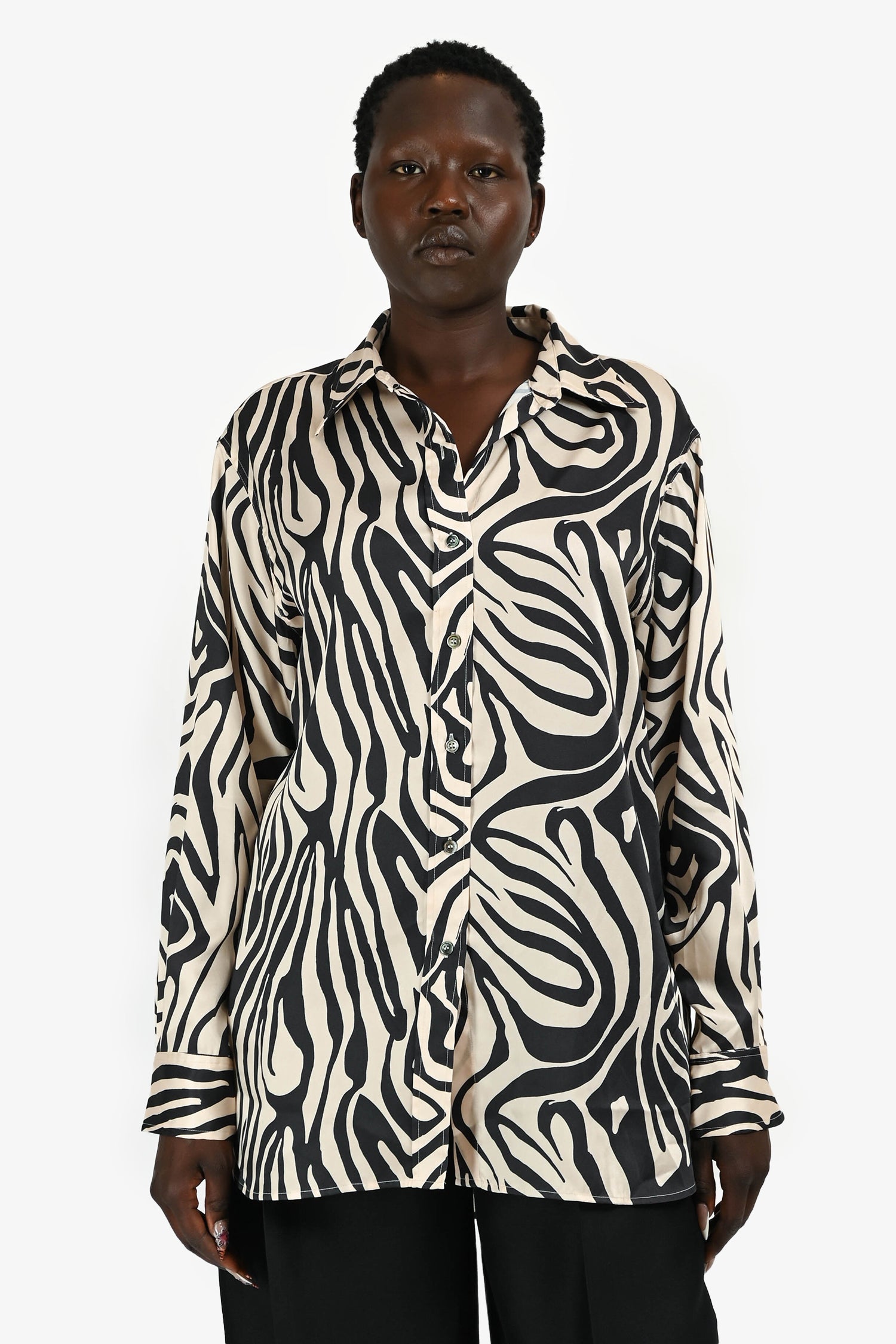 Refresh availabilityRonny Kobo Beige/Brown Animal Printed Satin Oversized Button-Up Shirt. Collared neckline. Button front closure. Long sleeves with button cuffs. Tonal stitching.