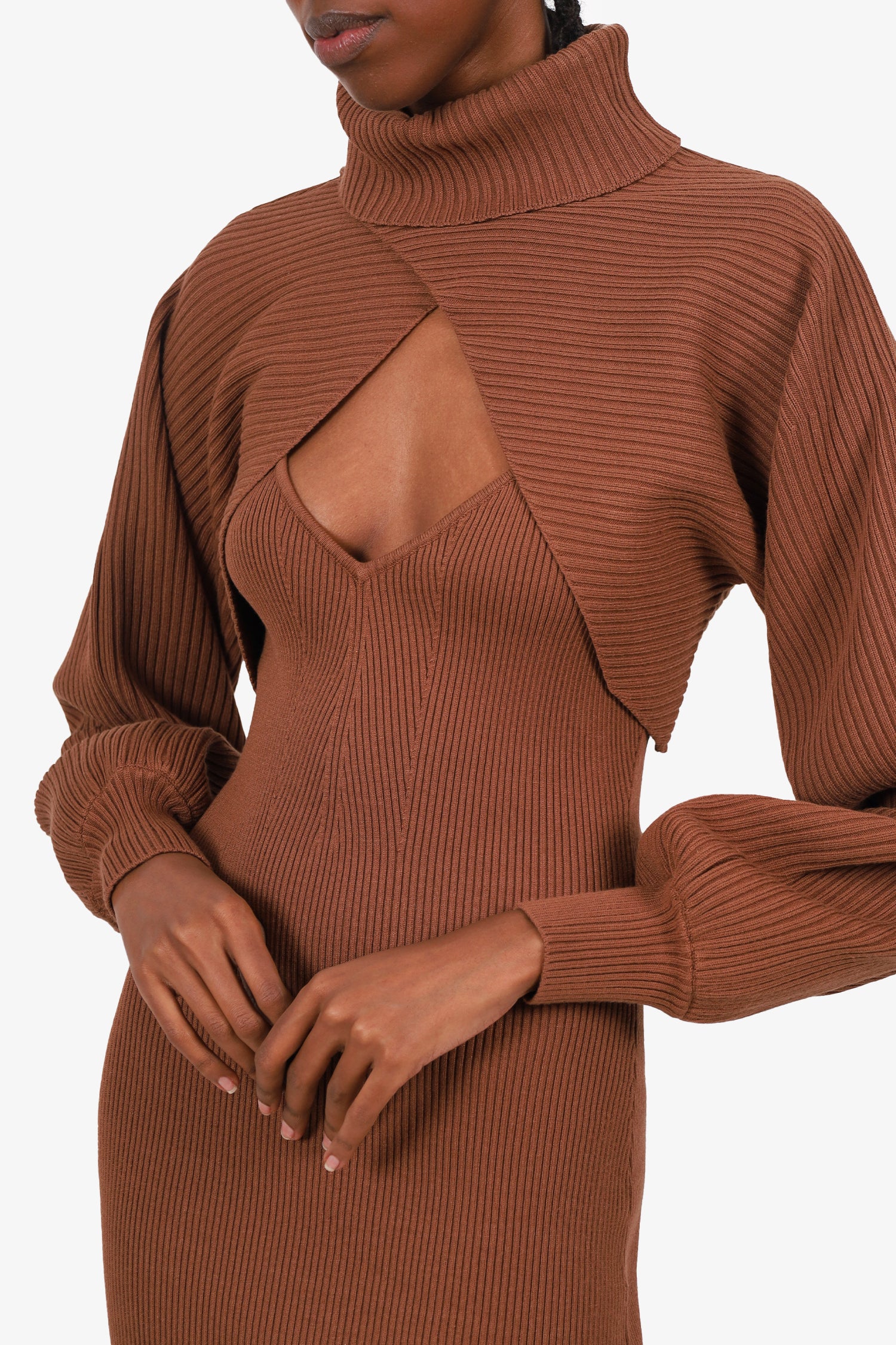 Refresh availabilityRonny Kobo Brown Knit Dress with Long Sleeve Turtle Neck Cropped Sweater. Sweater: Pull-on. Turtle-neckline. Elasticated sleeve cuffs. Dress: Pull-on. V-neckline. Tonal stitching.