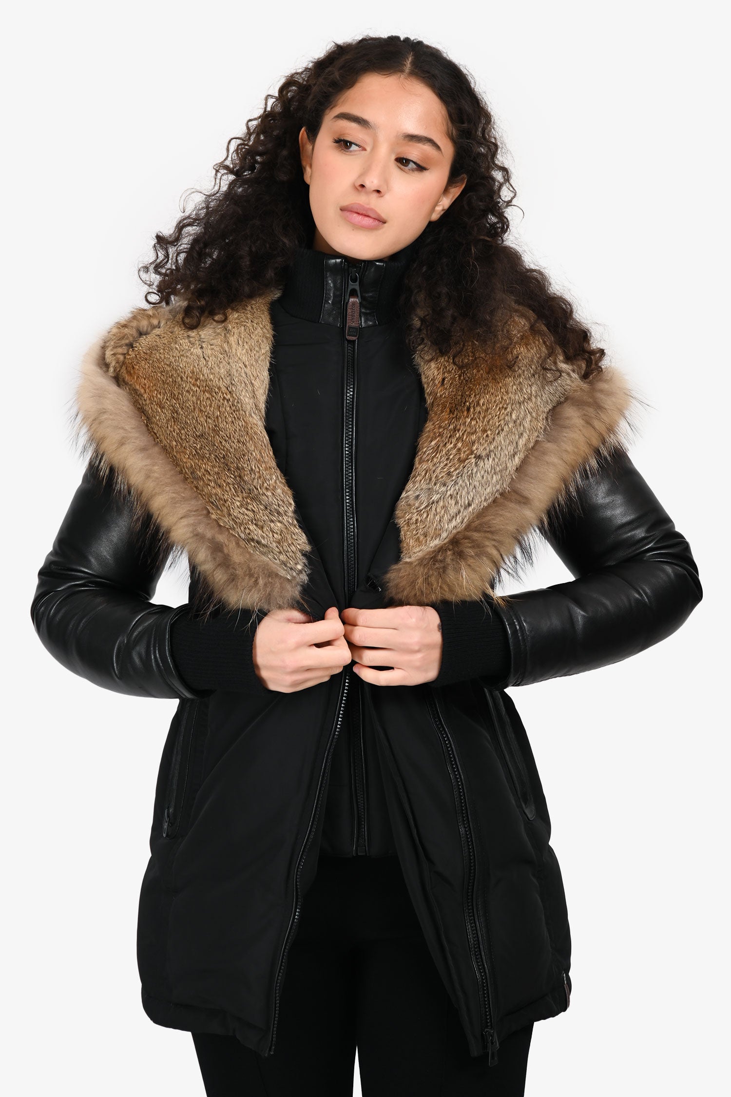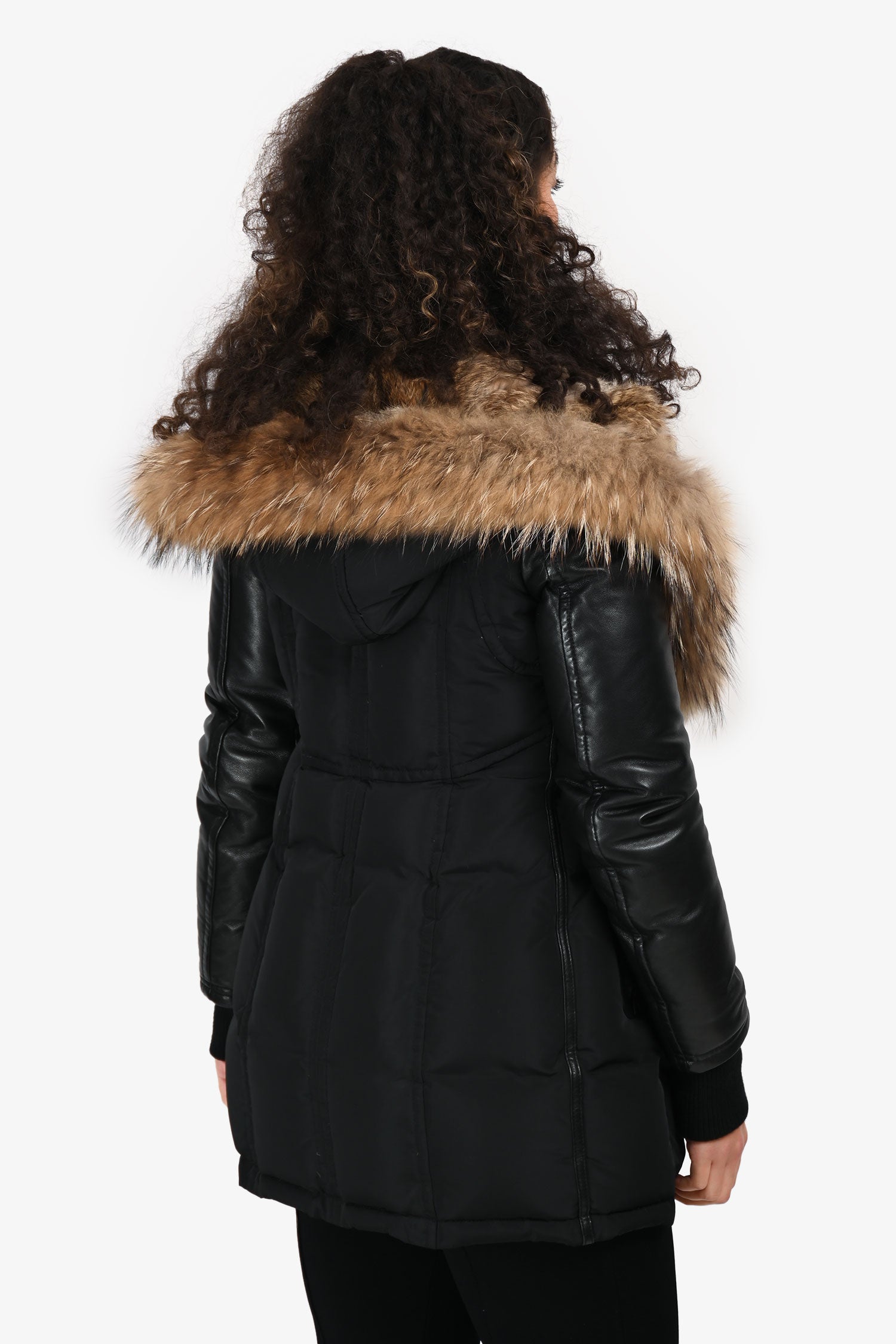 Rudsak Black Down Midi Jacket with Leather Sleeves & Rabbit/Raccoon Fur Size XS