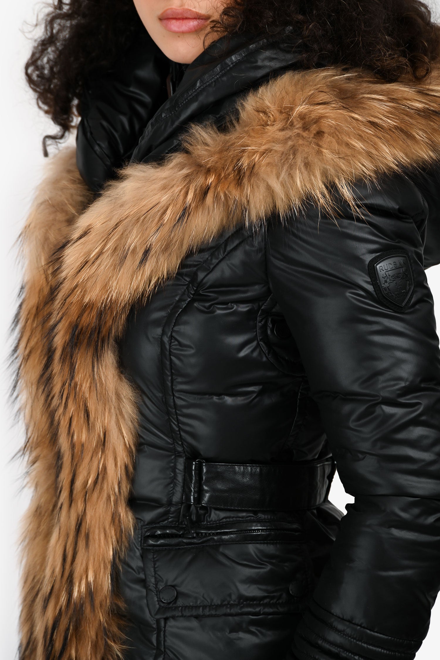 Refresh availabilityRudsak Black Down Midi Raccoon Fur Trimmed Jacket. Slip-on. Zip closure in the front. Ribbed neckline and cuffs. Adjustable leather waist belt. 2 pockets on the sides with snap-button closure. Tonal hardware. Tonal stitching.