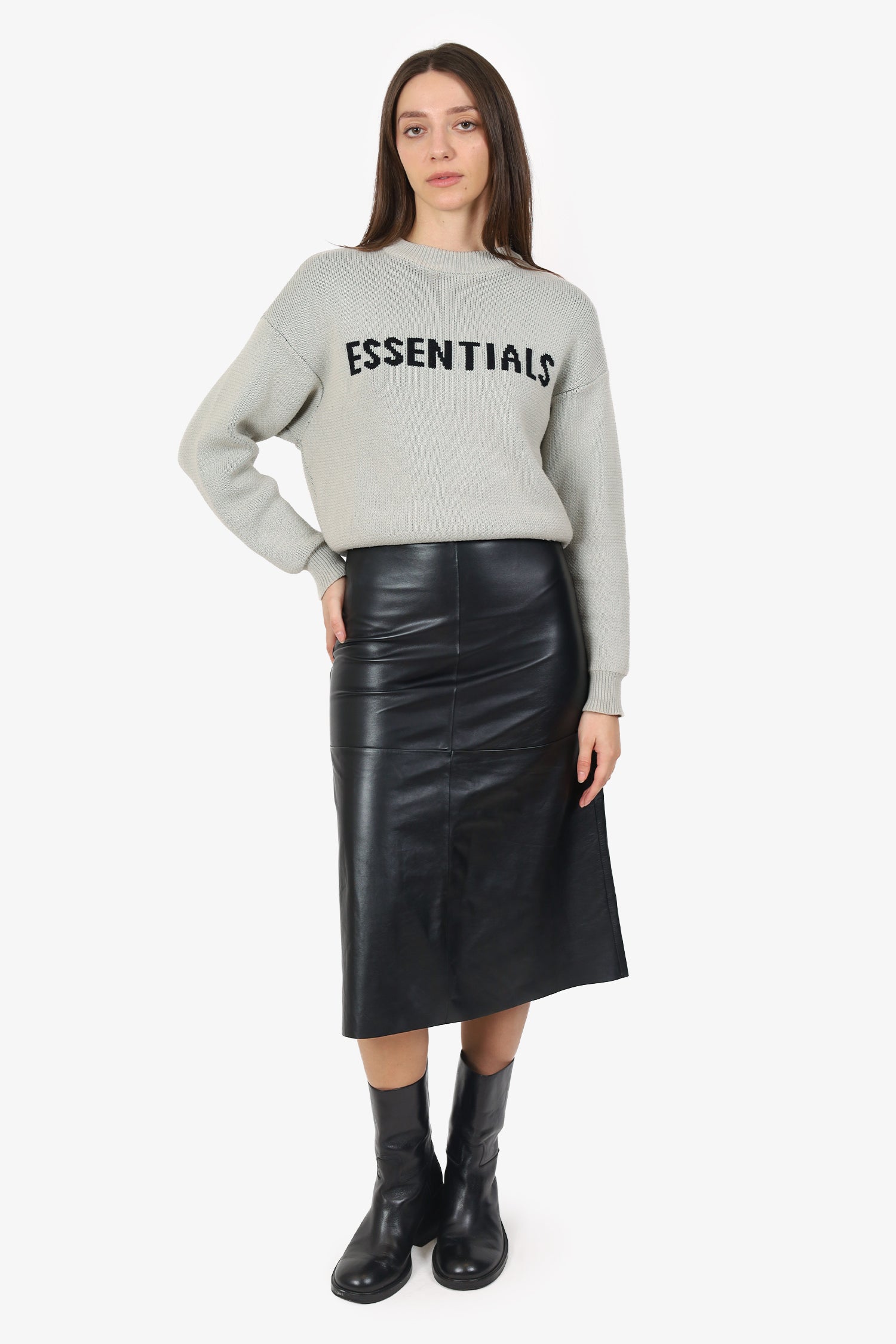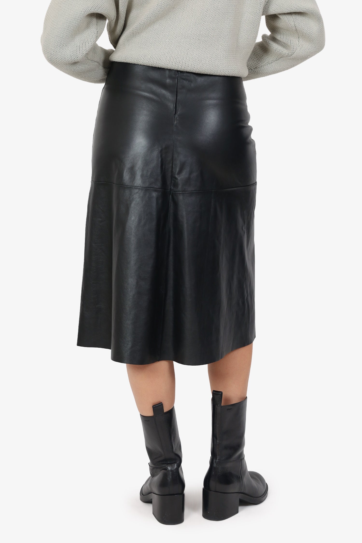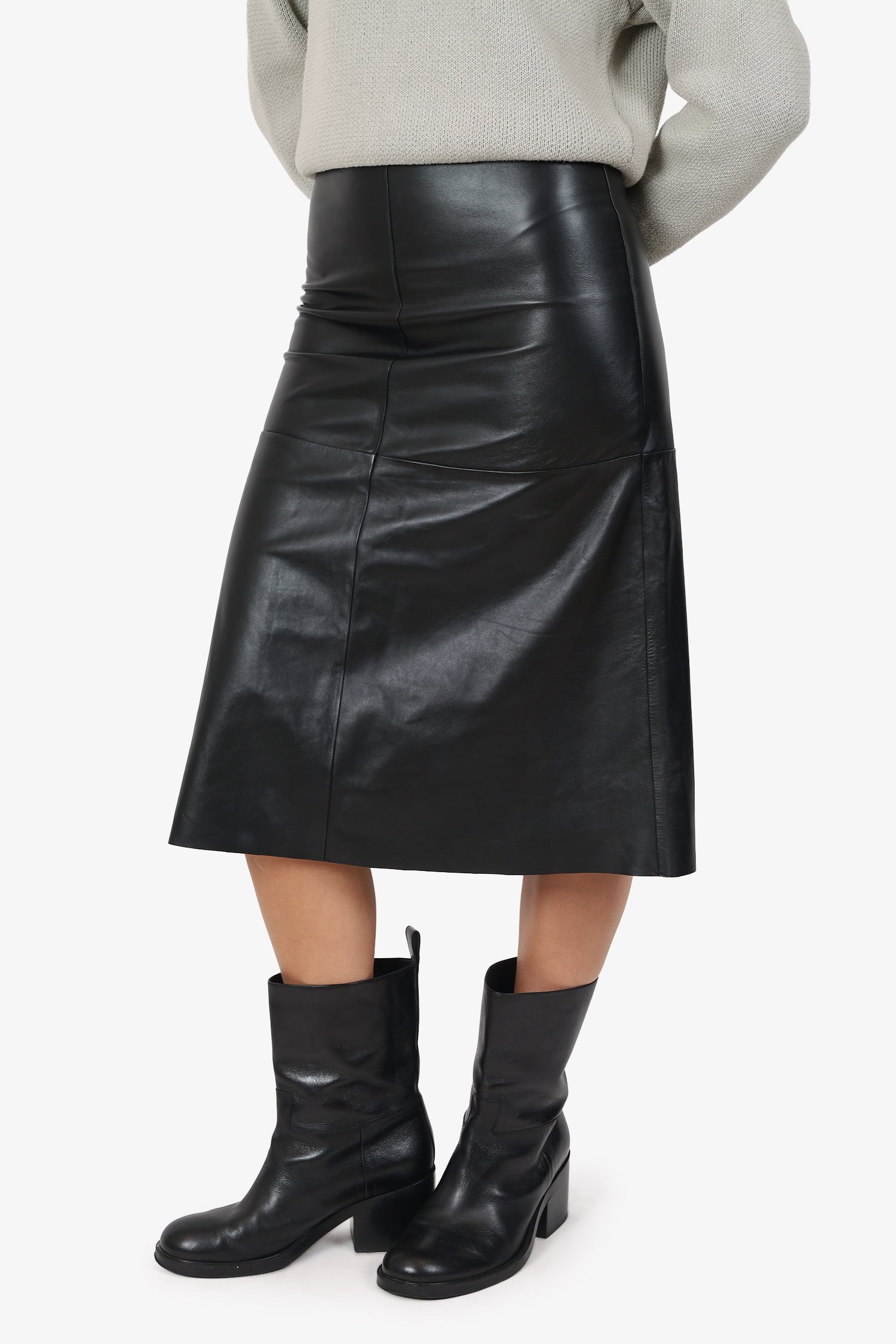 Refresh availability'S Max Mara Black Leather Midi Skirt. Slip-on. Rear zip-up closure. Lined interior. Tonal stitching.