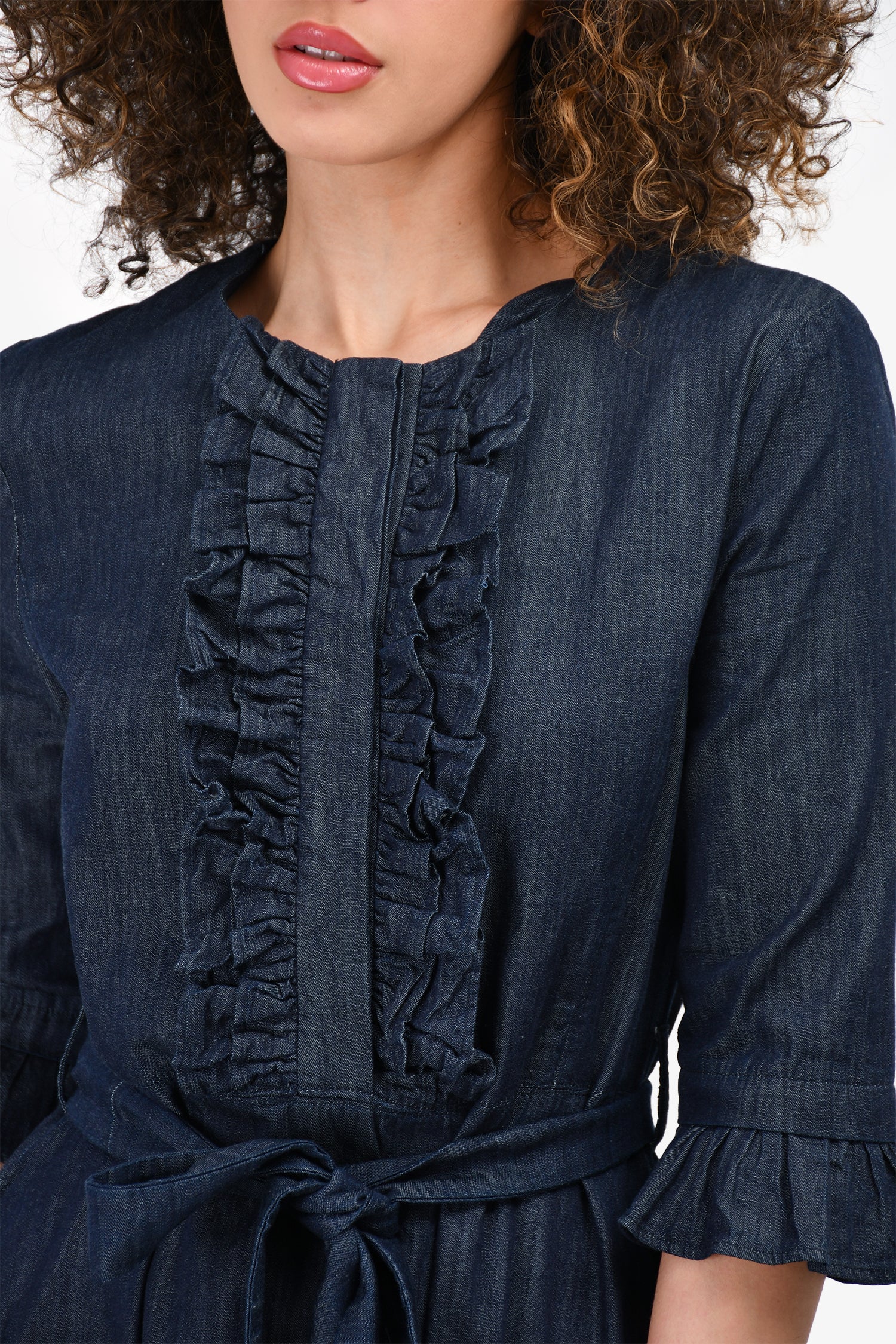 Refresh availability'S Max Mara Blue Denim Ruffle Front Dress. Round neck. Rear zip closure. Waist belt with tie-up closure. Front pockets. Unlined.