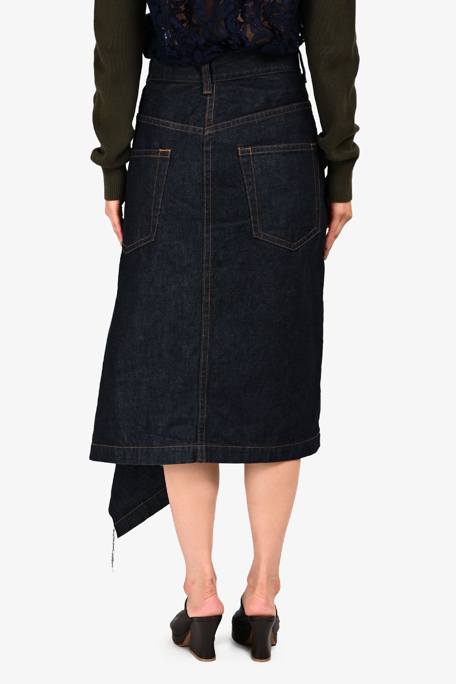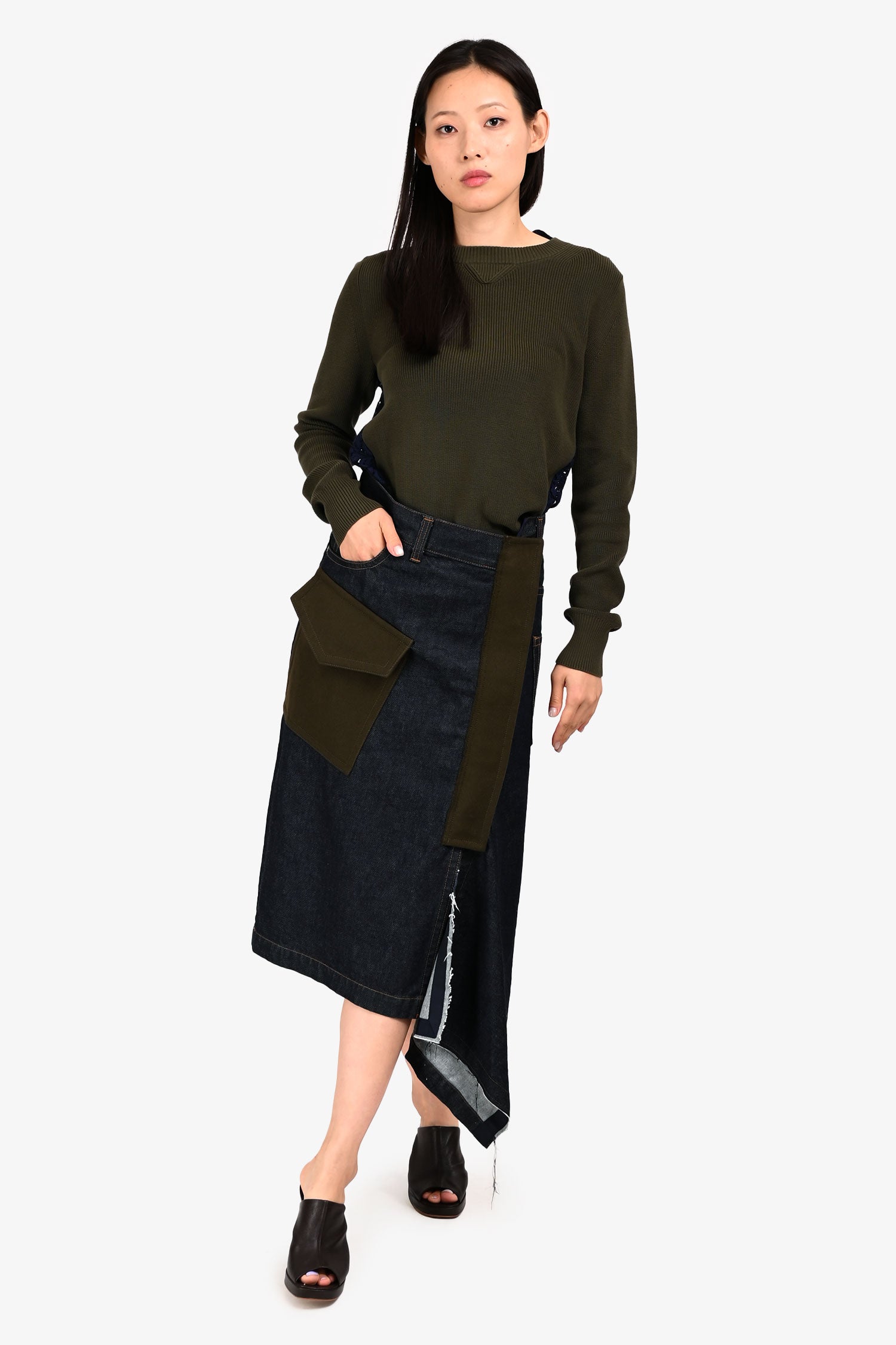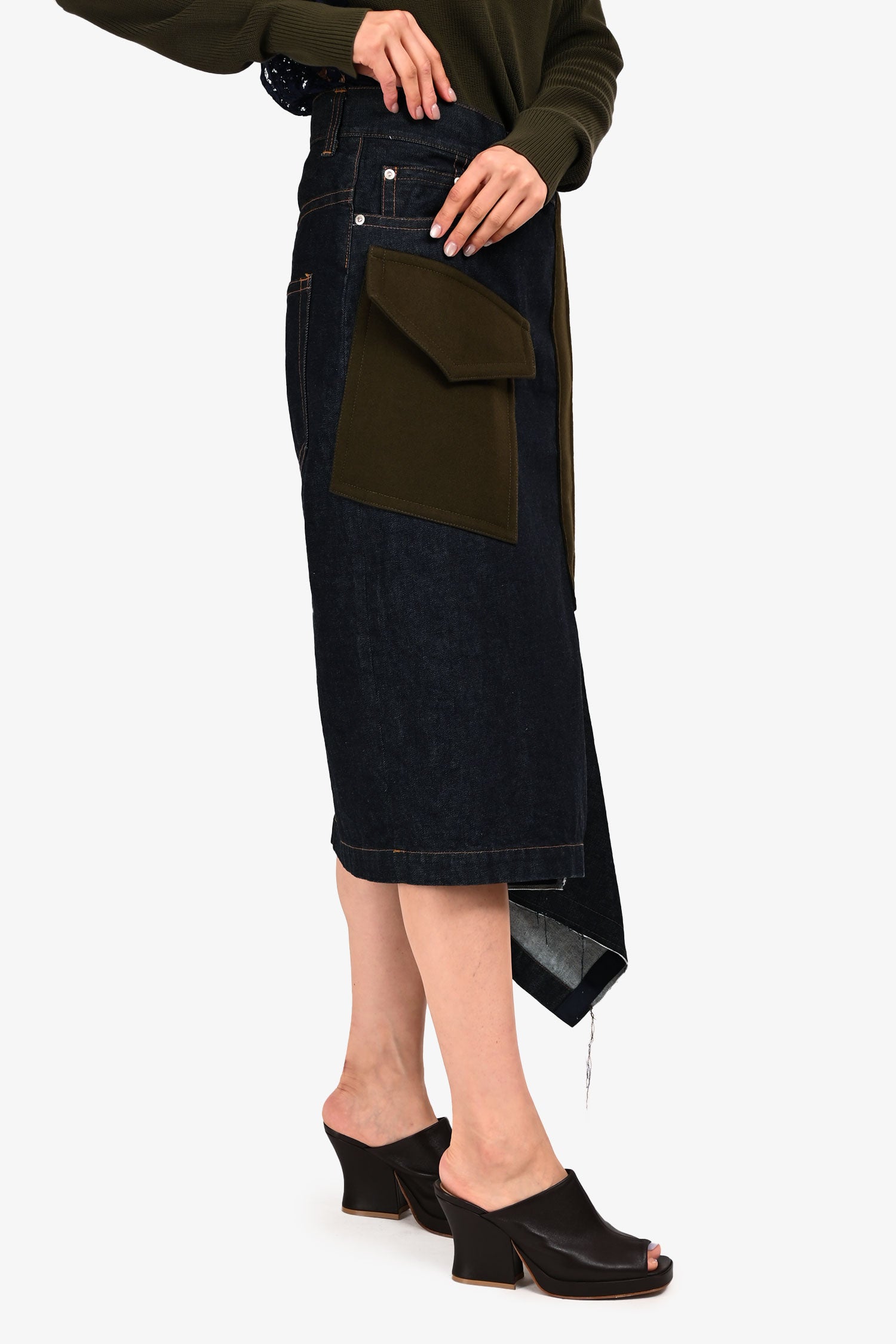 Refresh availabilitySacai Dark Denim Green Wool Panel Midi Skirt. Slip-on. Front zip and snap button closure. Front and rear slip pockets. Waistband belt loops. Unlined. Contrast stitching.
