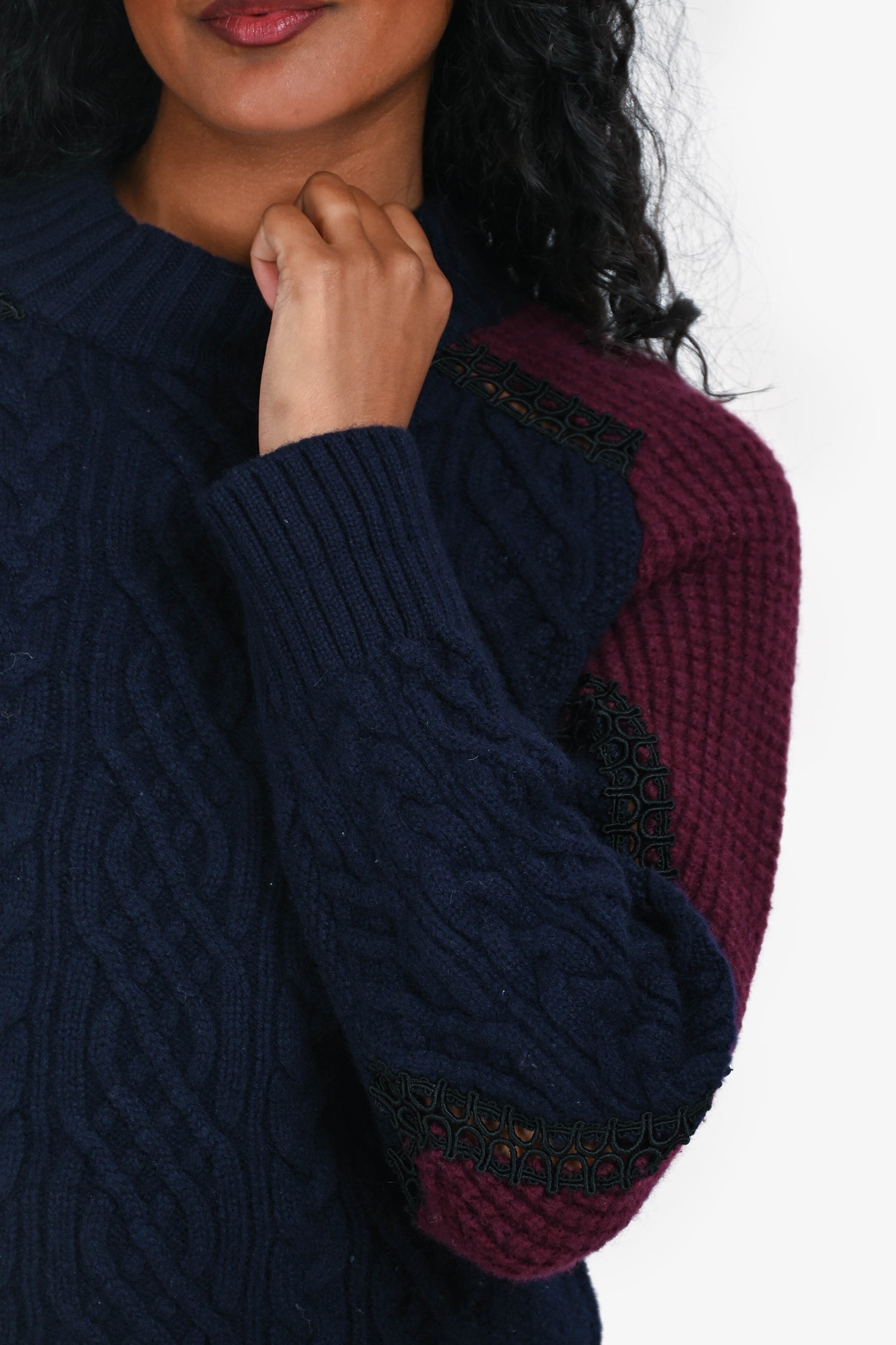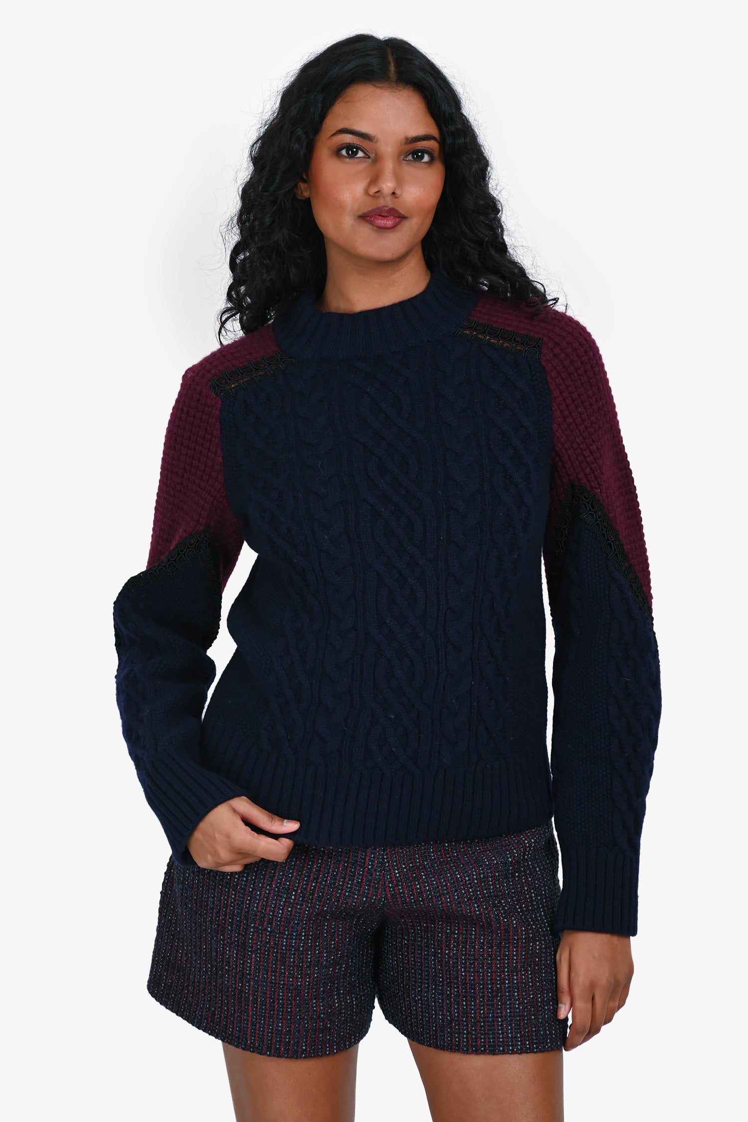 Sacai Navy/Burgundy Cable Knit Lace Detail Crewneck Sweater Size 2