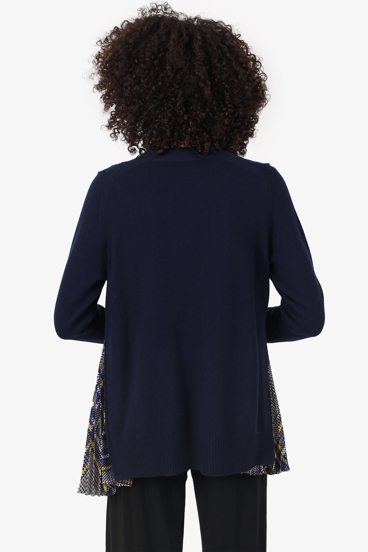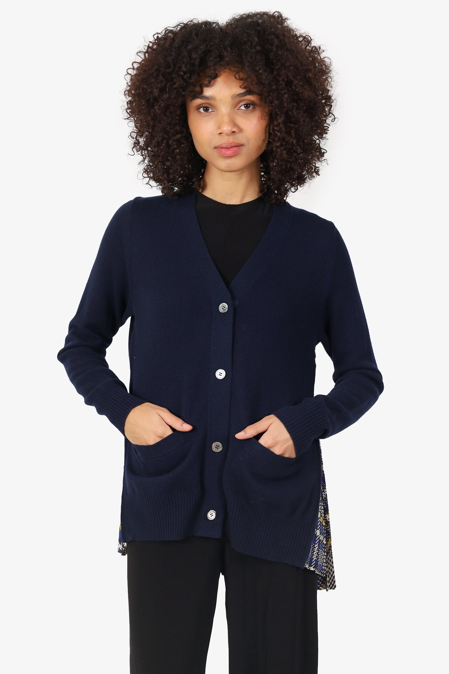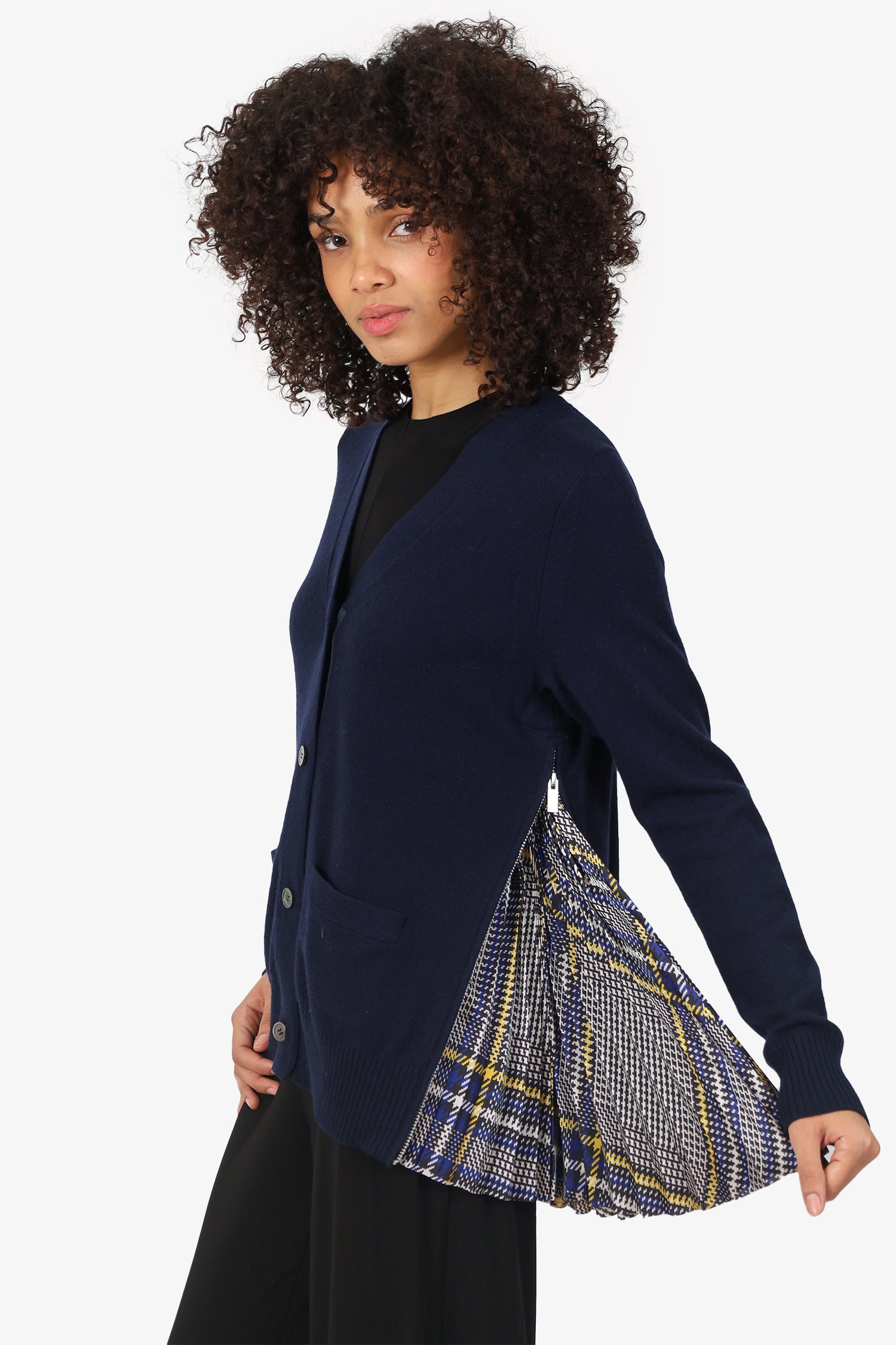 Refresh availabilitySacai Navy Wool Pleated Knit Cardigan. Pull-on. V-neckline. Front button-up closure. 2 exterior front slip pockets. Side zip-up detail. Silver-tone hardware. Tonal stitching.
