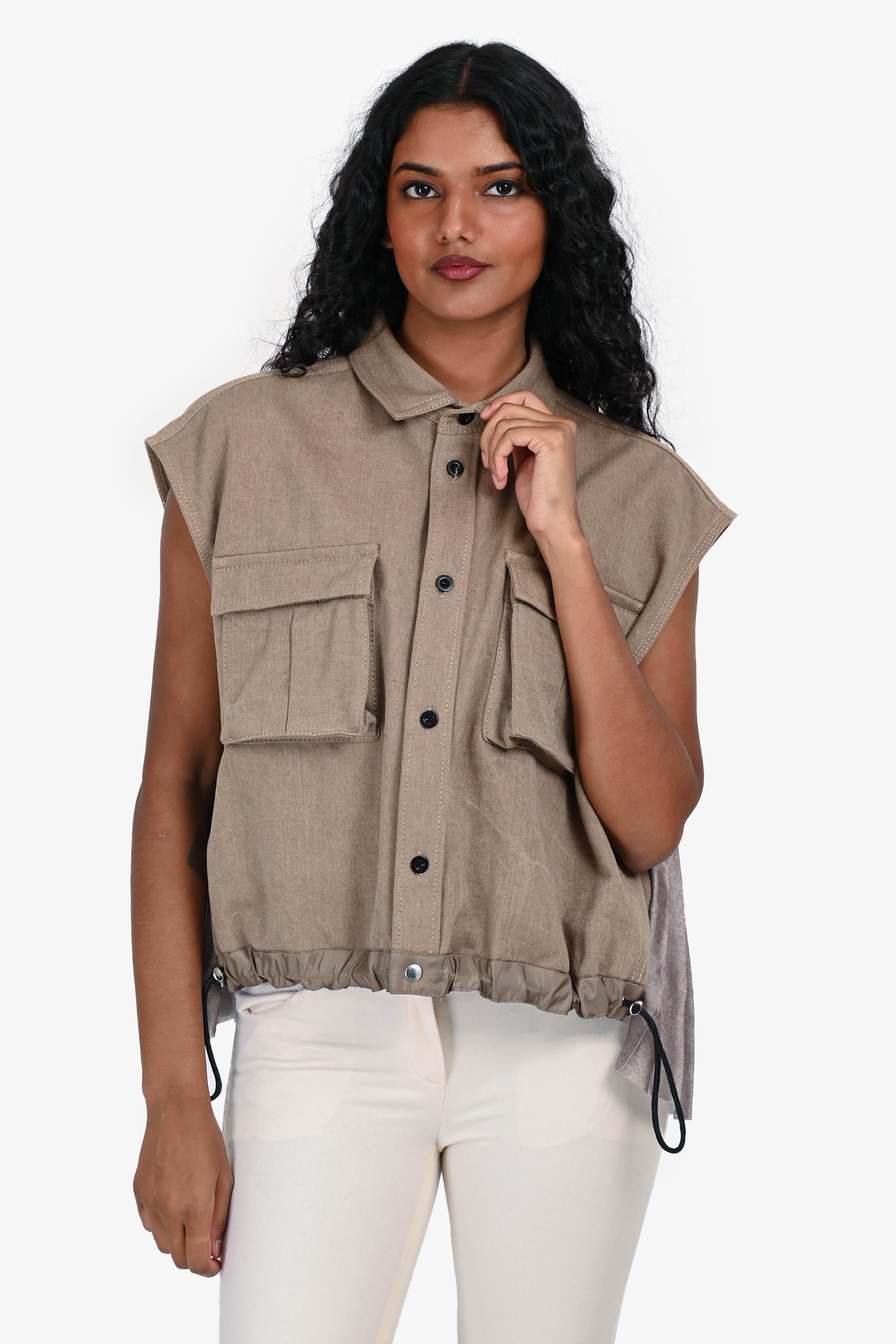 Refresh availabilitySacai Taupe Denim Pleated Back Shirt Vest. Front button-up closure. Front chest pockets. Drawstring detail on the hem.