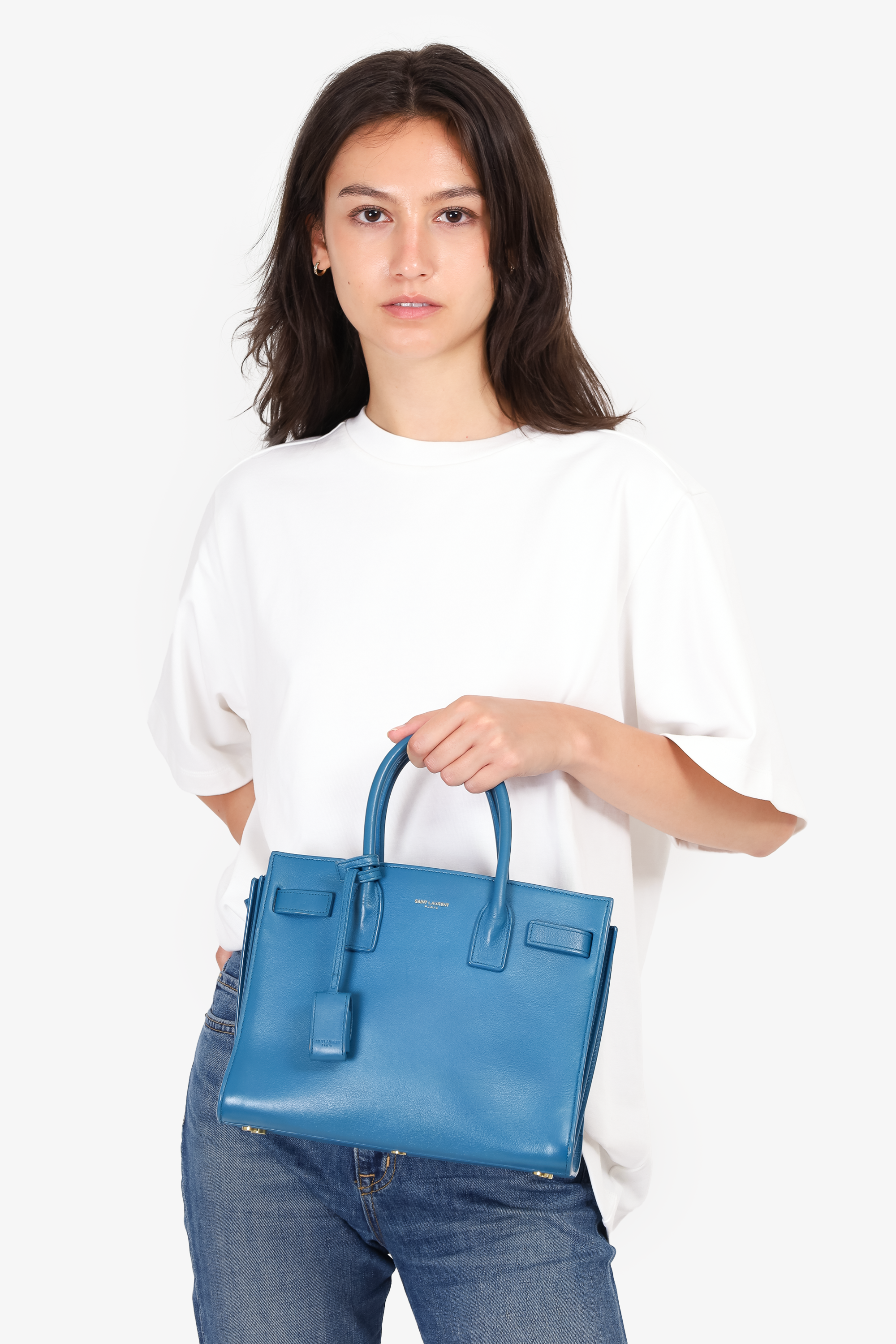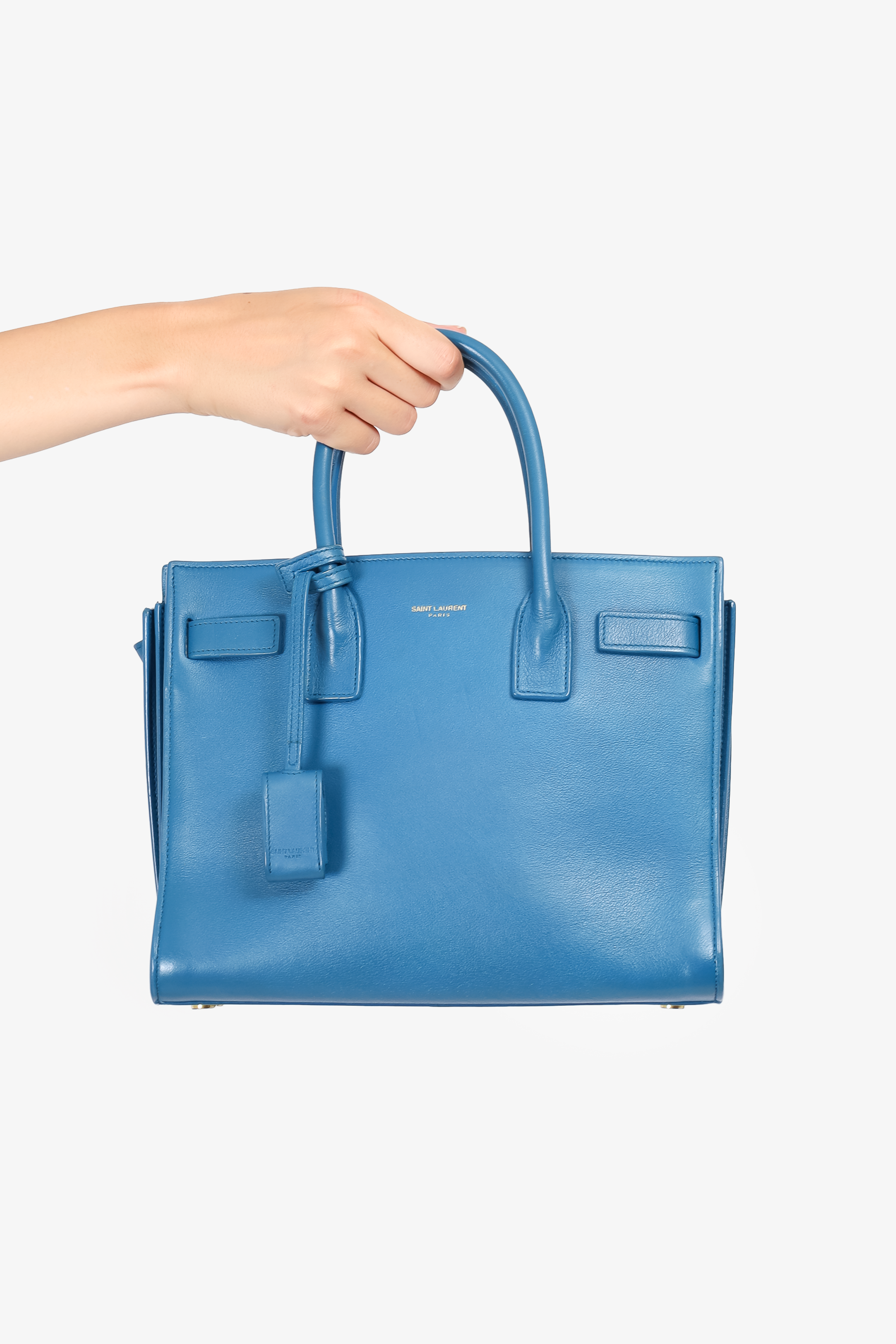 Refresh availabilitySaint Laurent 2014 Blue Leather Nano Sac de Jour Top Handle with Strap. Top handle. 1 interior slip pocket. Tonal stitching.