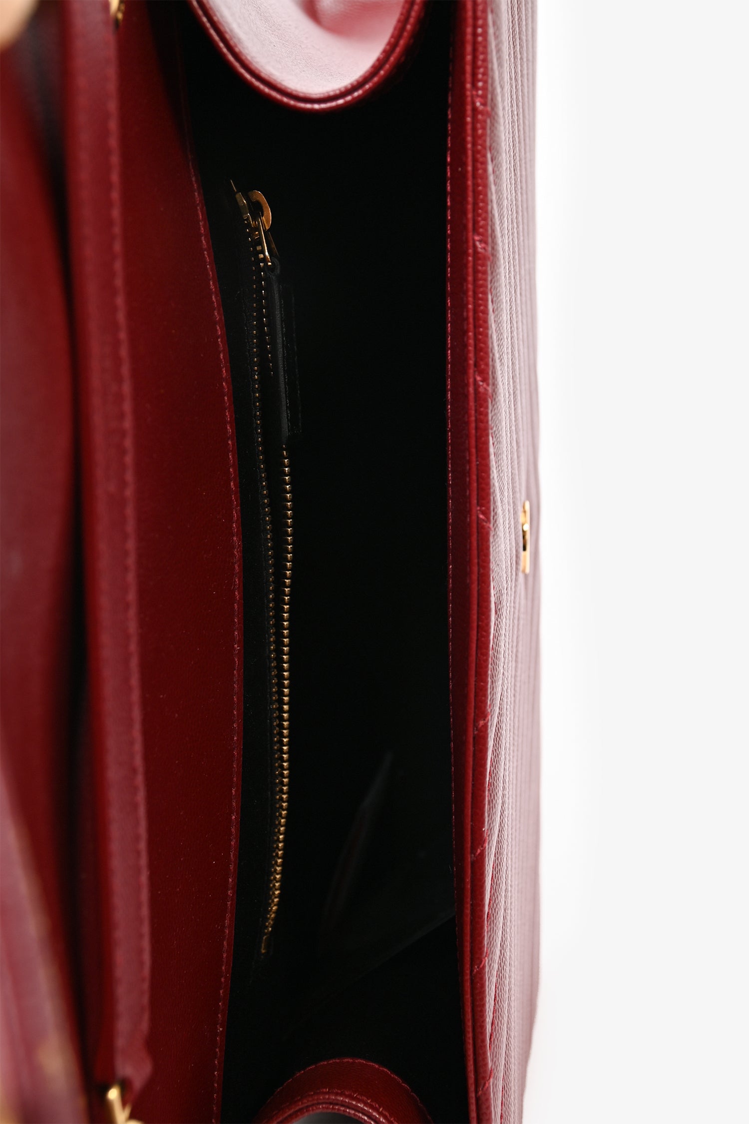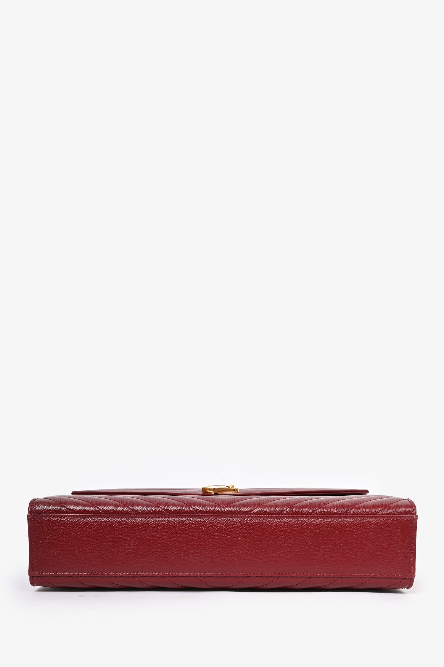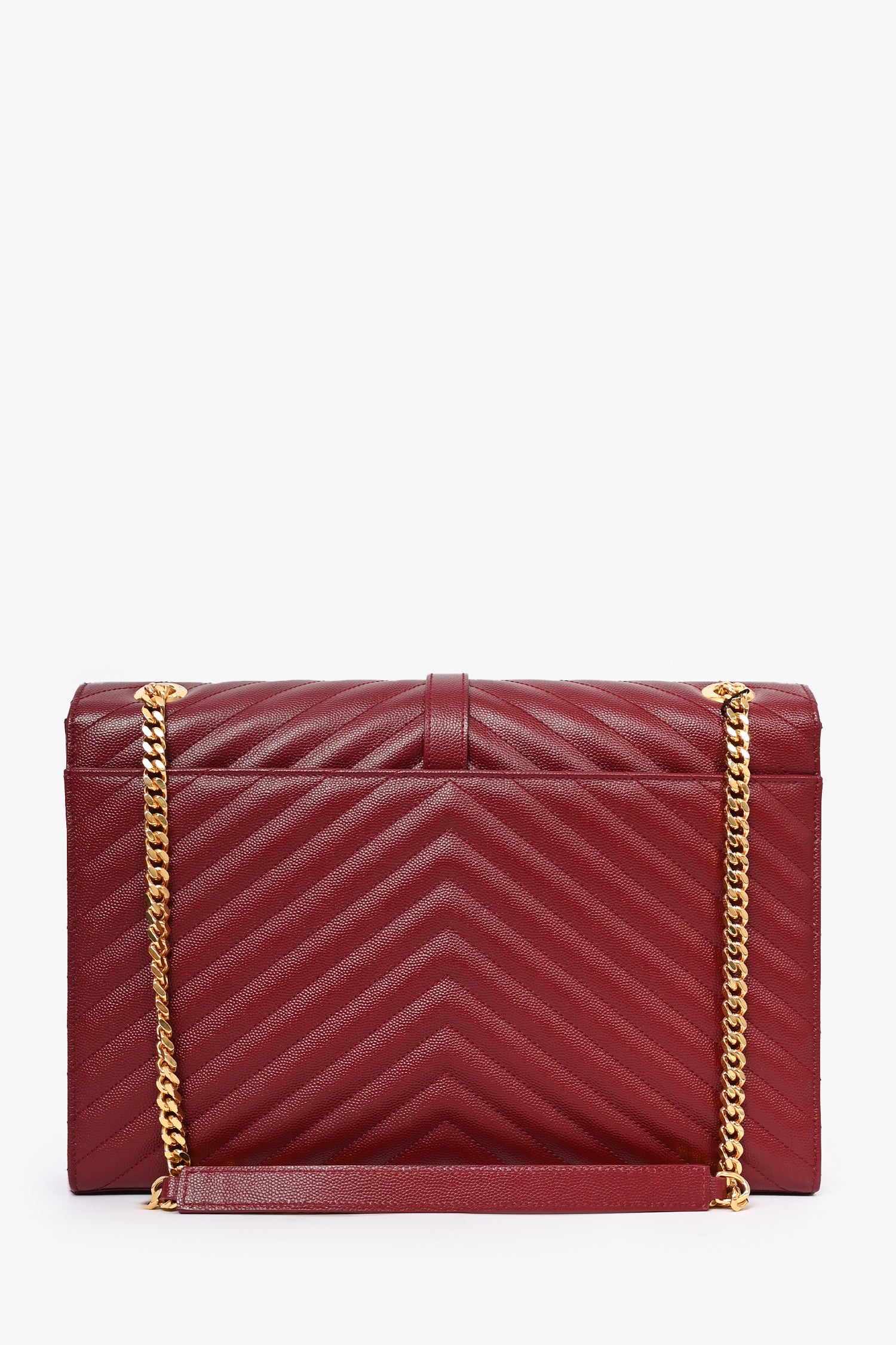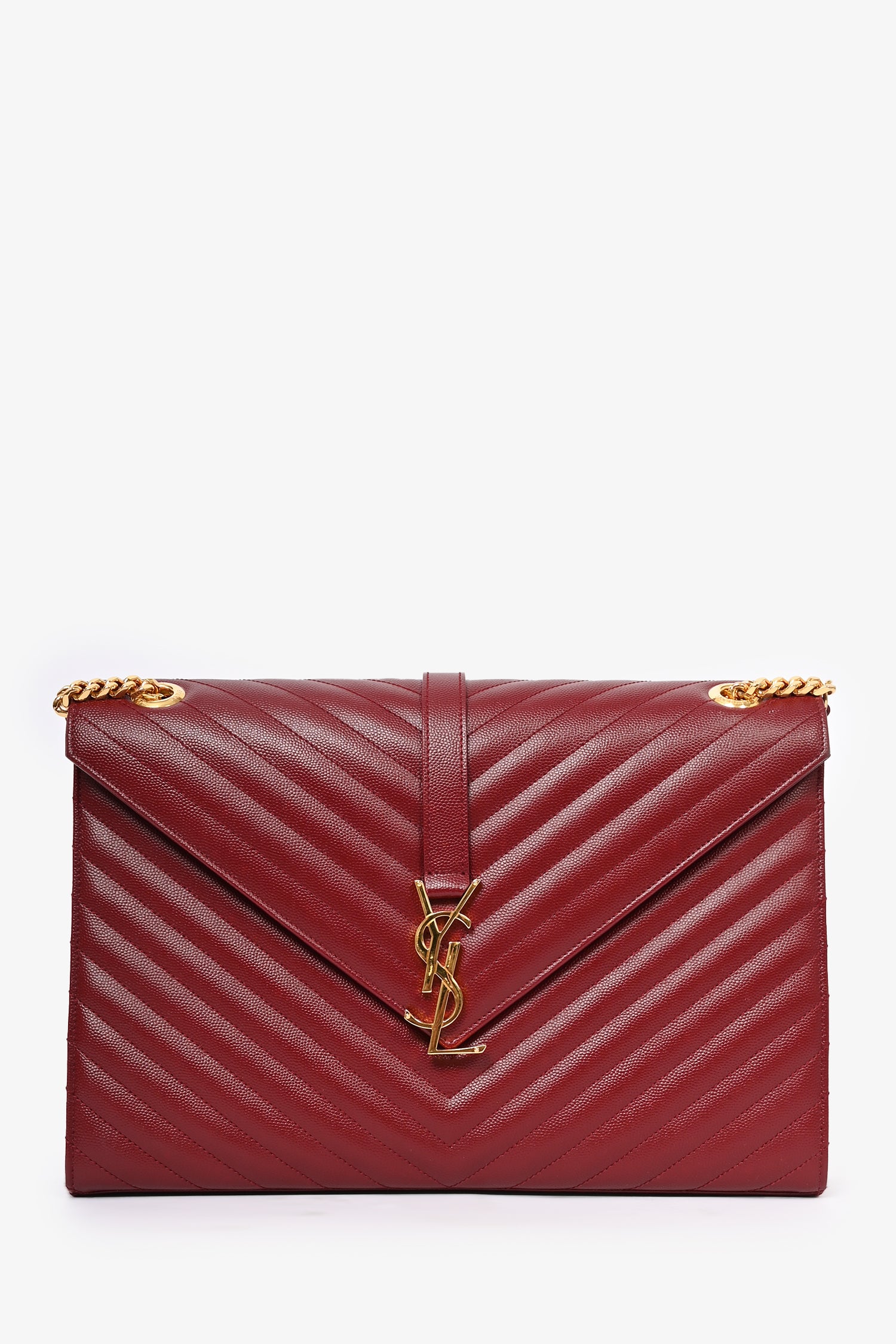Refresh availabilitySaint Laurent 2015 Burgundy Chevron Leather Large Envelope Shoulder Bag. Tonal stitching. Chain-link shoulder strap with leather accents. 'Cassandre' hardware logo at front. Magnetic snap closure. Back exterior compartment. Interior zippered compartment.