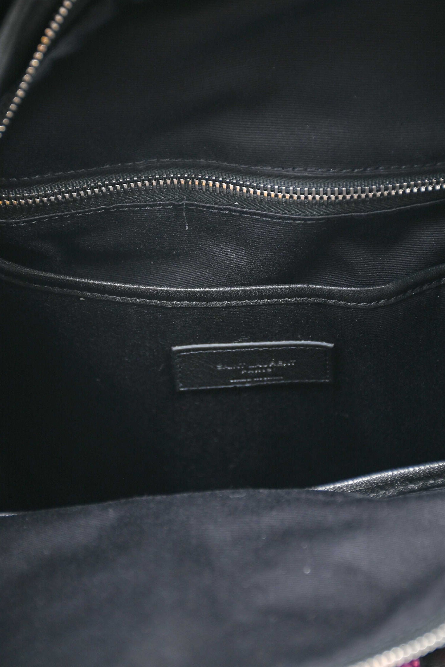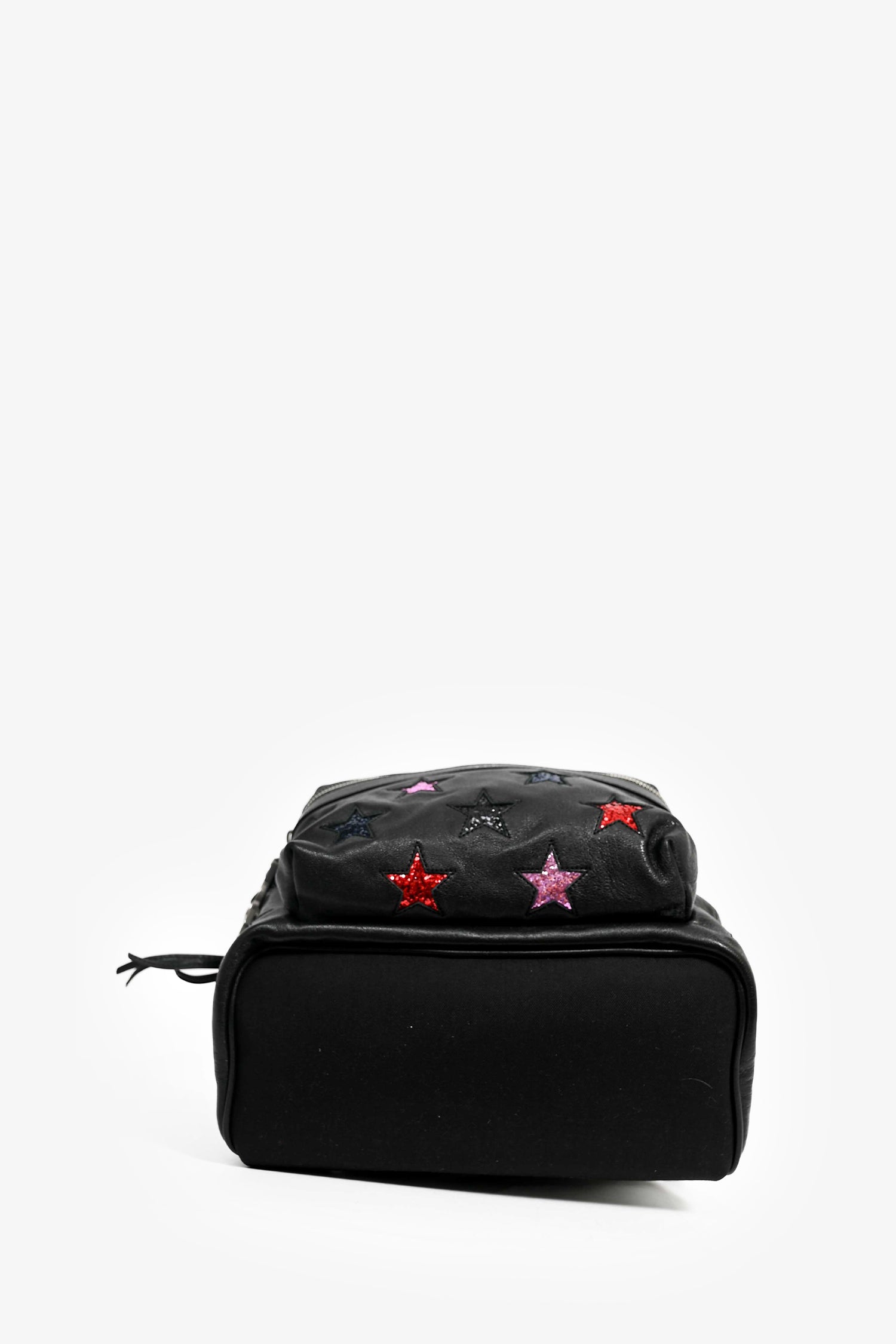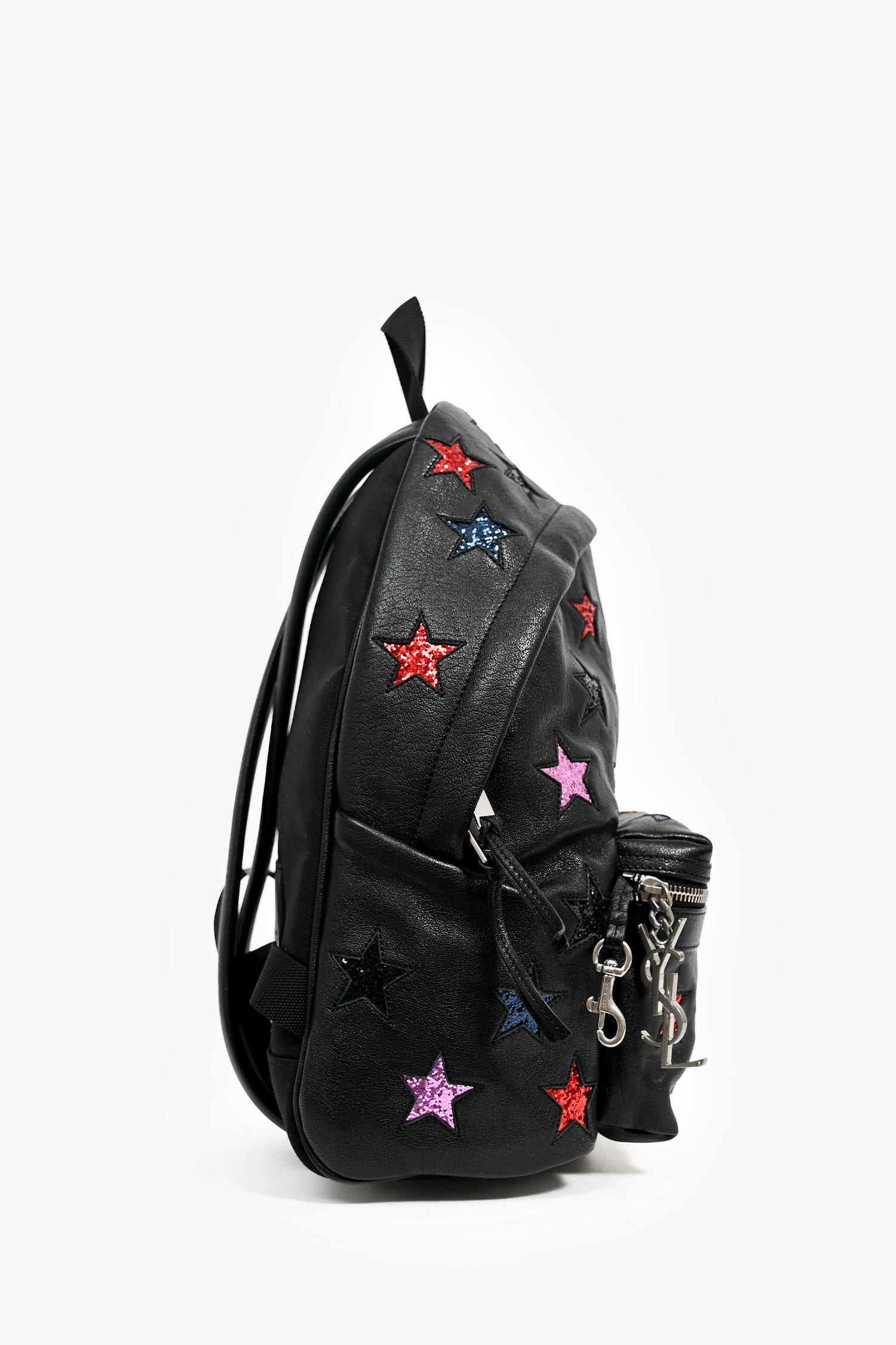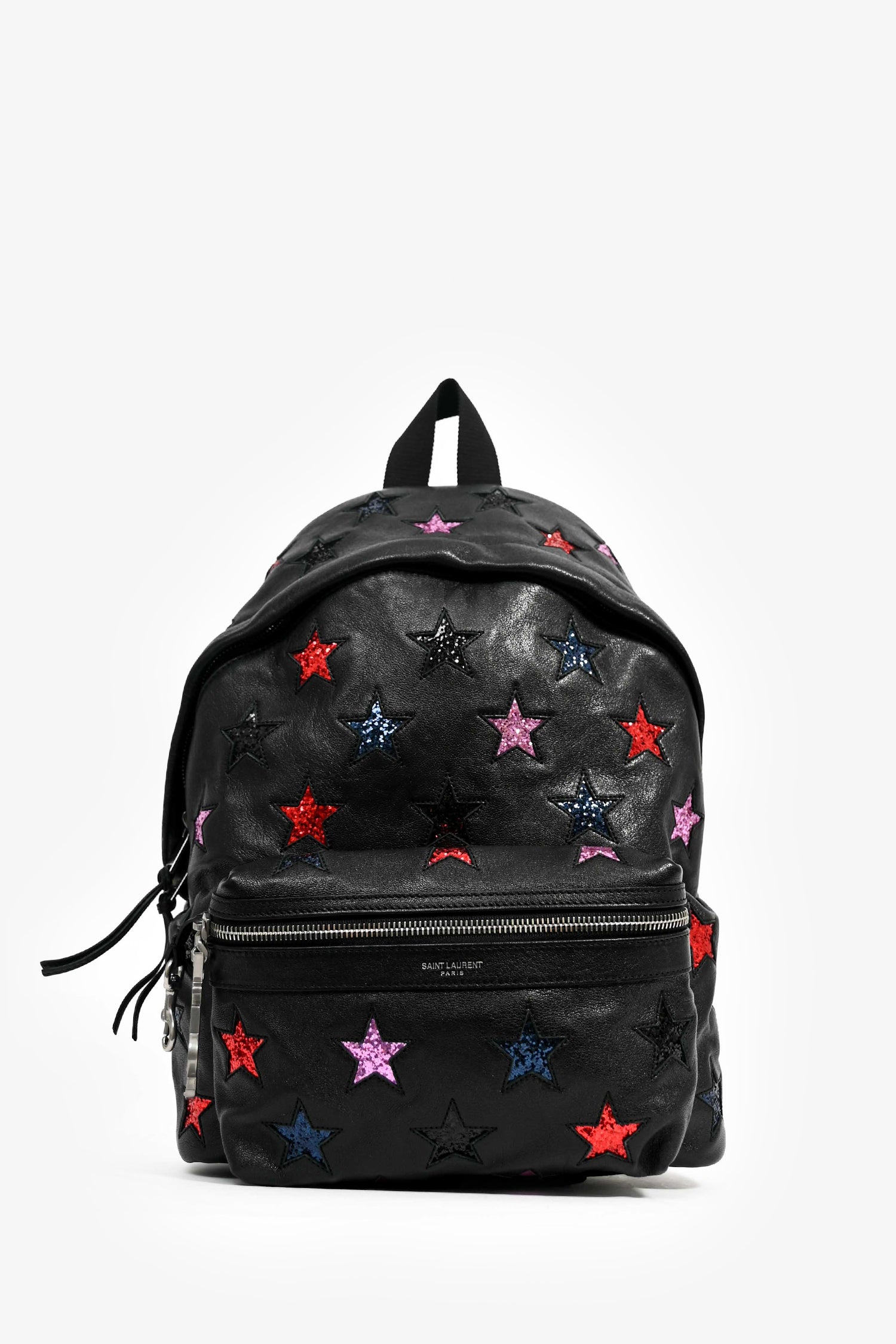 Refresh availabilitySaint Laurent 2016 Black Leather Multicolour Glitter Star Backpack. Front zip pocket. Front two-way zip closure. Top handle. Textile interior lining. single compartment with three wall slip pockets, and a wall zip pocket. Front exterior compartment with zipper closure. Adjustable straps. Silver-tone hardware. Tonal stitching.