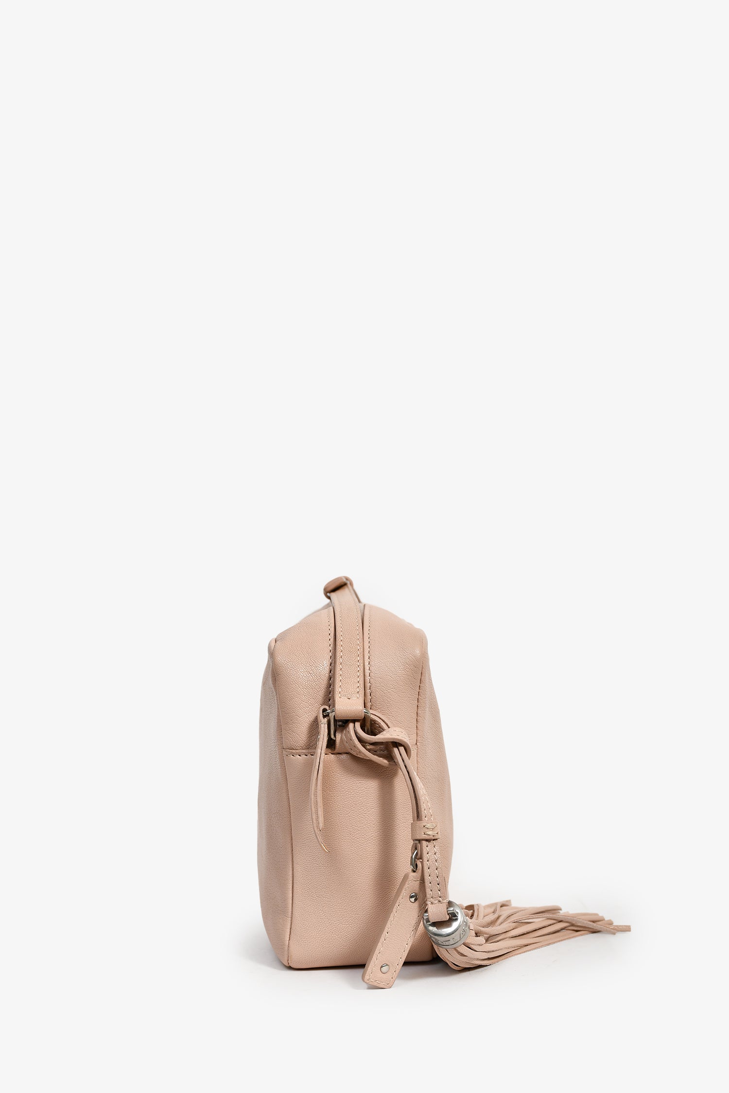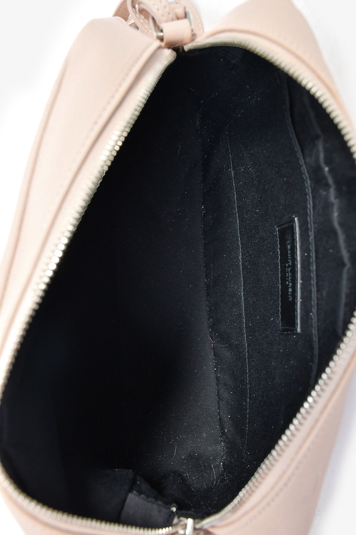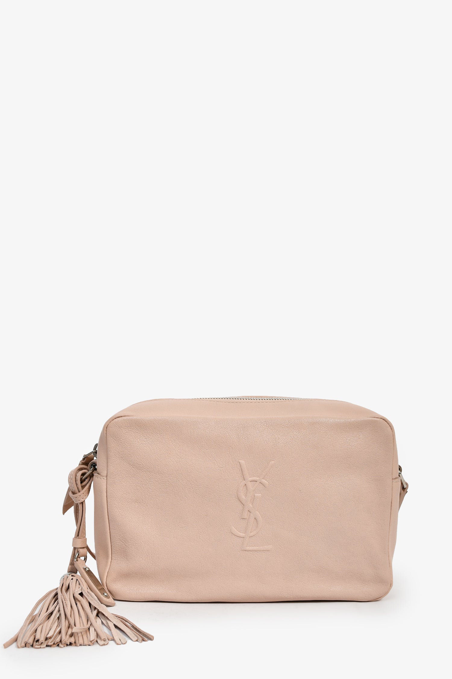 Refresh availabilitySaint Laurent 2017 Blush Pink Leather Tassel Camera Crossbody. Top zip closure. Black textile interior lining. Single interior wall slip pocket. Adjustable strap. Detachable tassel. Silver-tone hardware.
