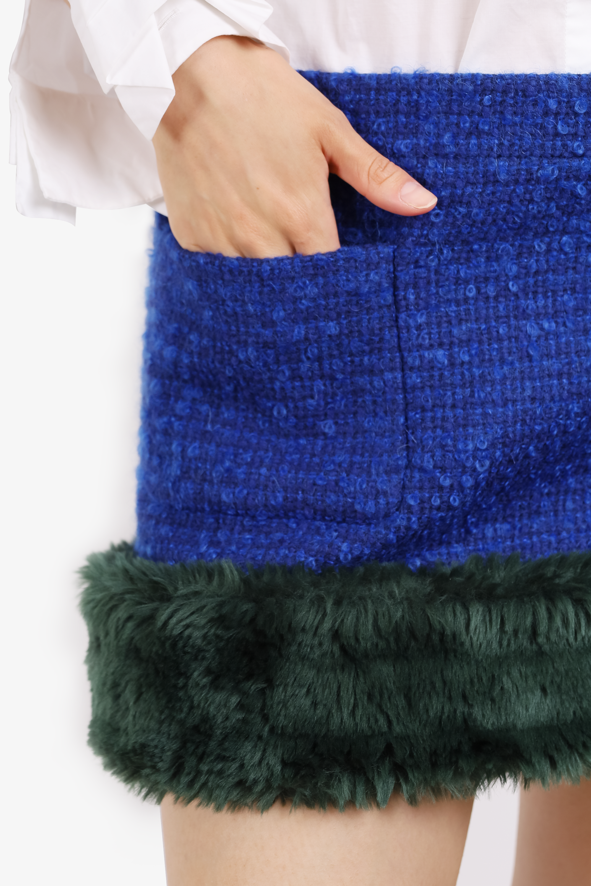 Refresh availabilitySaint Laurent 2021 Blue Wool/Mohair Tweed Faux Fur Hem Mini Skirt. Side zipper closure. Lined. Front slip pocket detail. Tonal stitching.