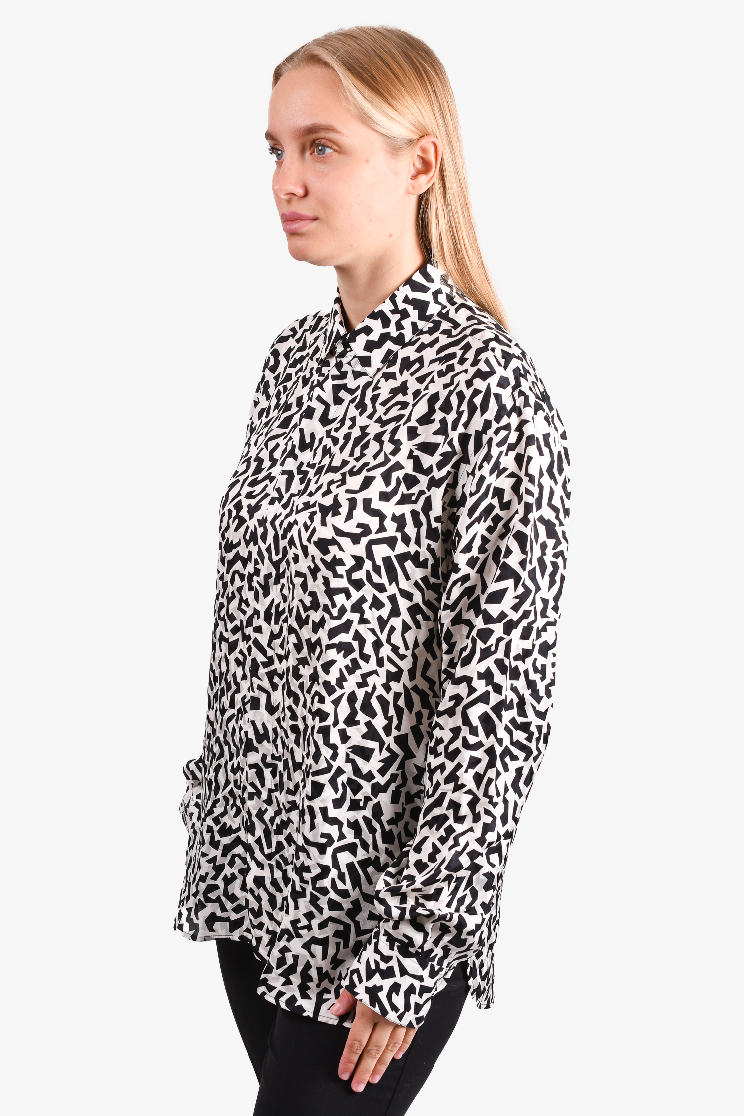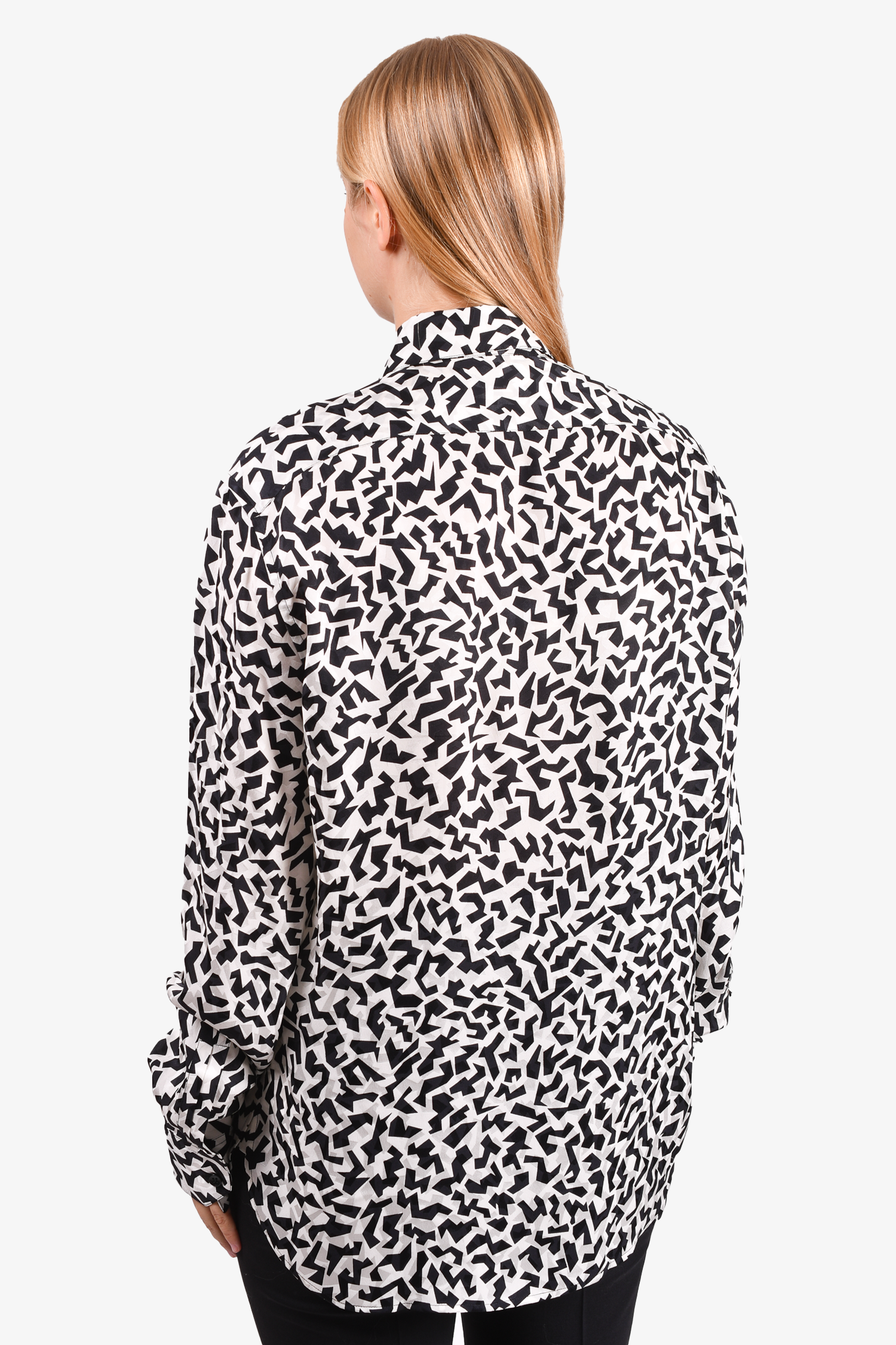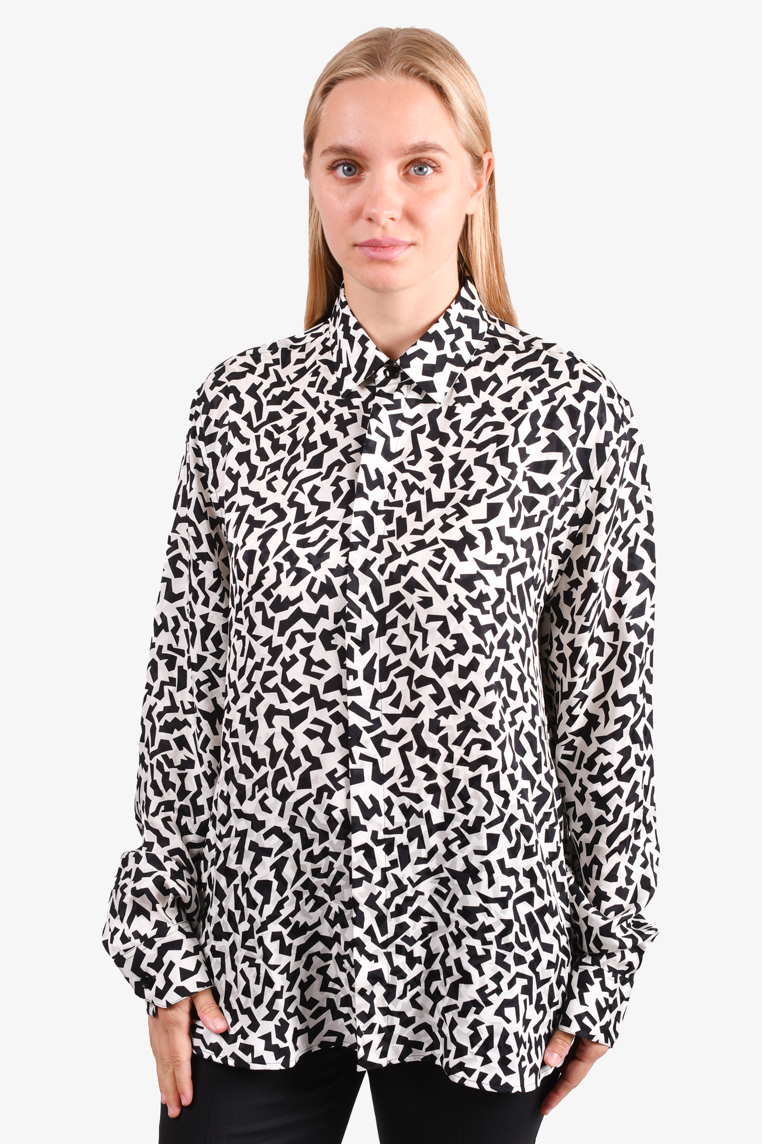 Refresh availabilitySaint Laurent 2021 White/Black Silk Geometric Print Button Down Shirt. Button closure on the cuffs. Tonal stitching.