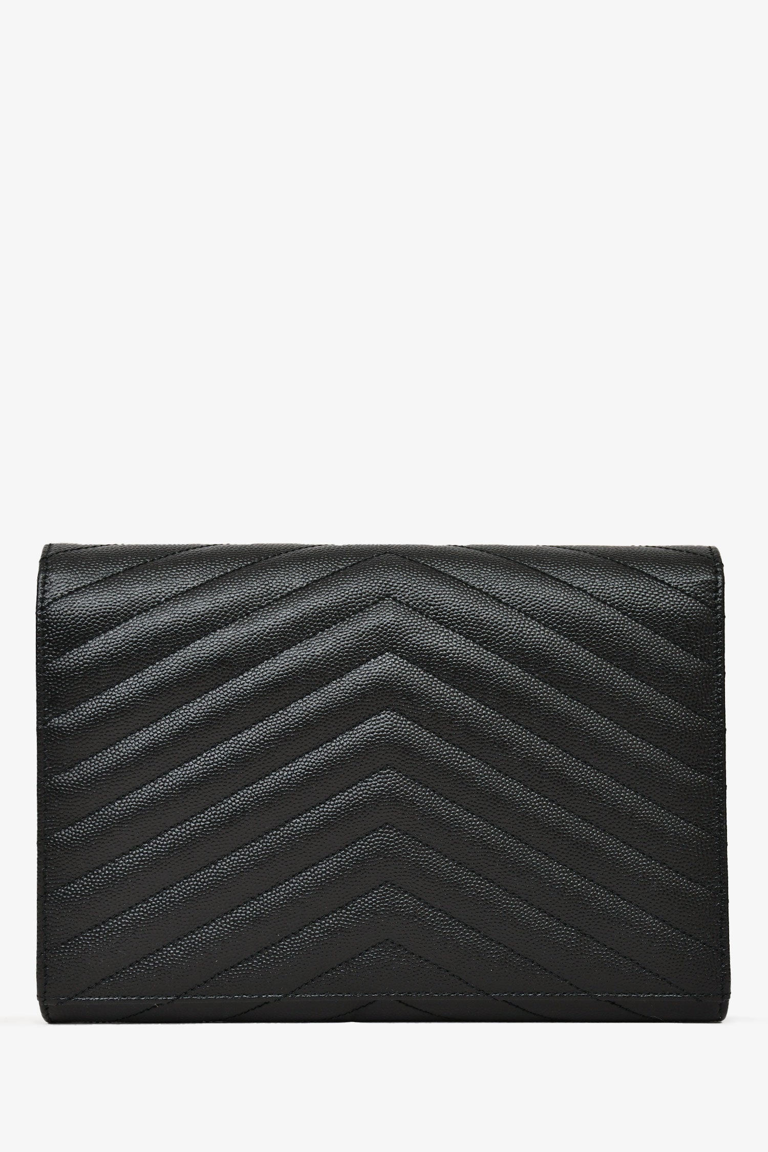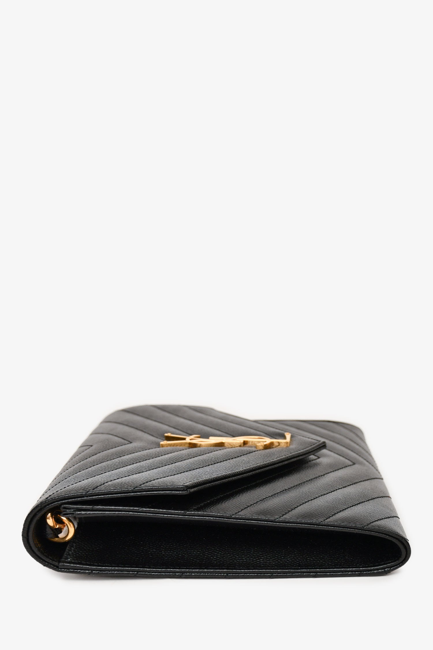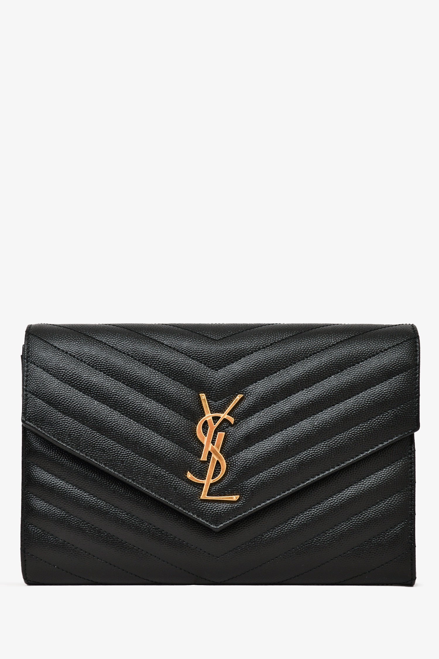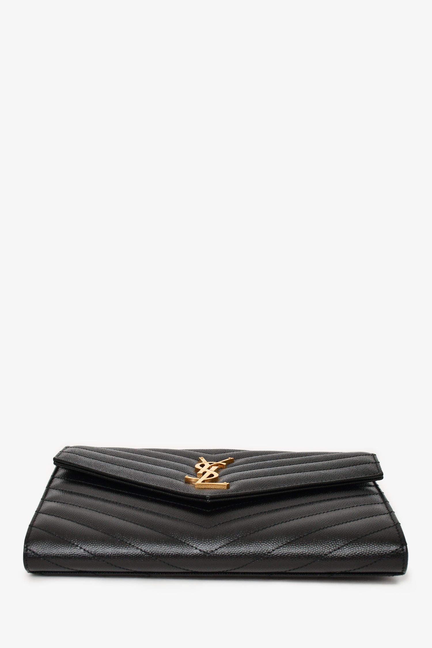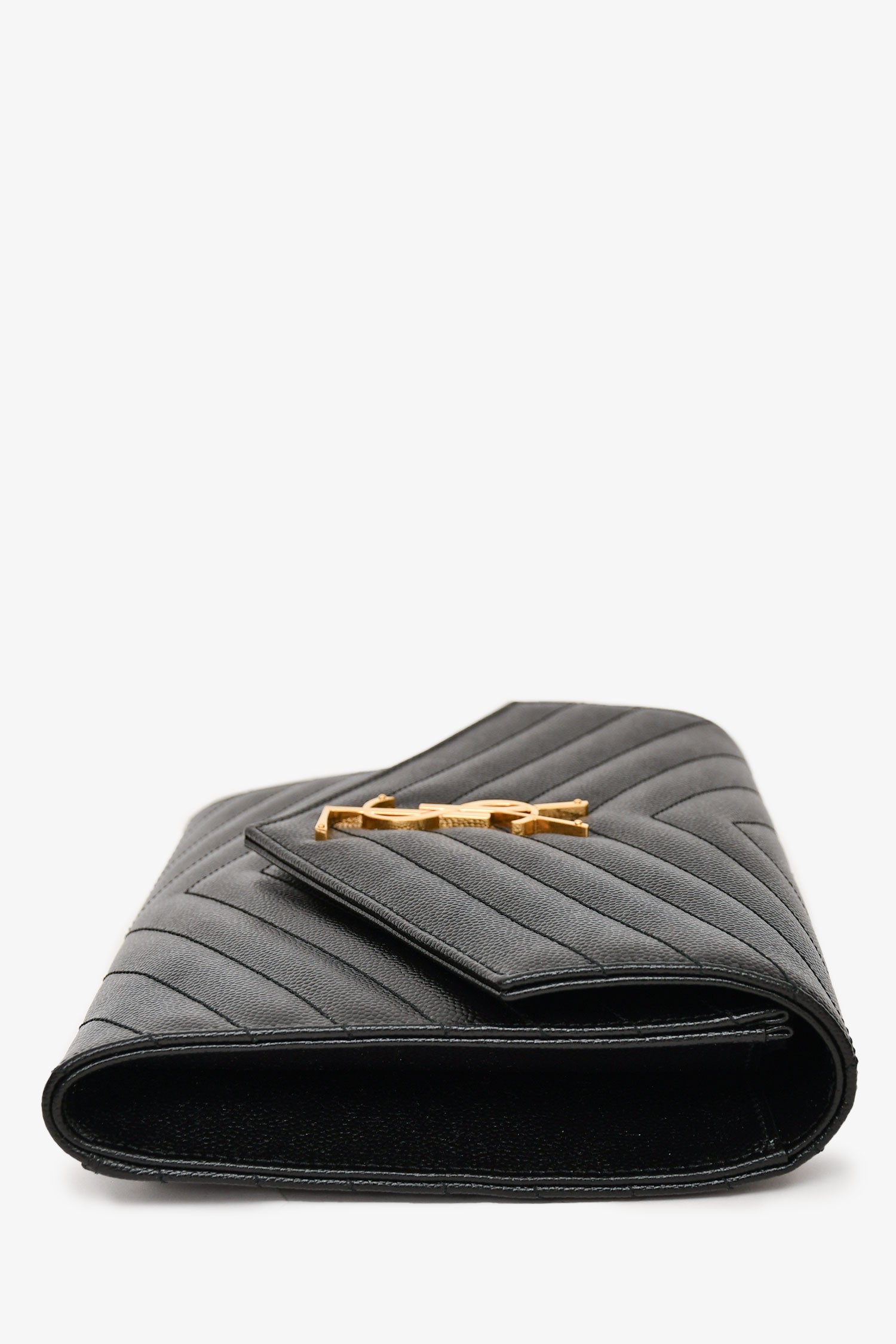 Refresh availabilitySaint Laurent 2022 Black Leather Chevron Quilted Cassandra Clutch. Front fold-over closure with snap-button. Single interior wall slip pocket. Removable wrist strap. Tonal textile interior lining. Gold-toned hardware. Tonal stitching.