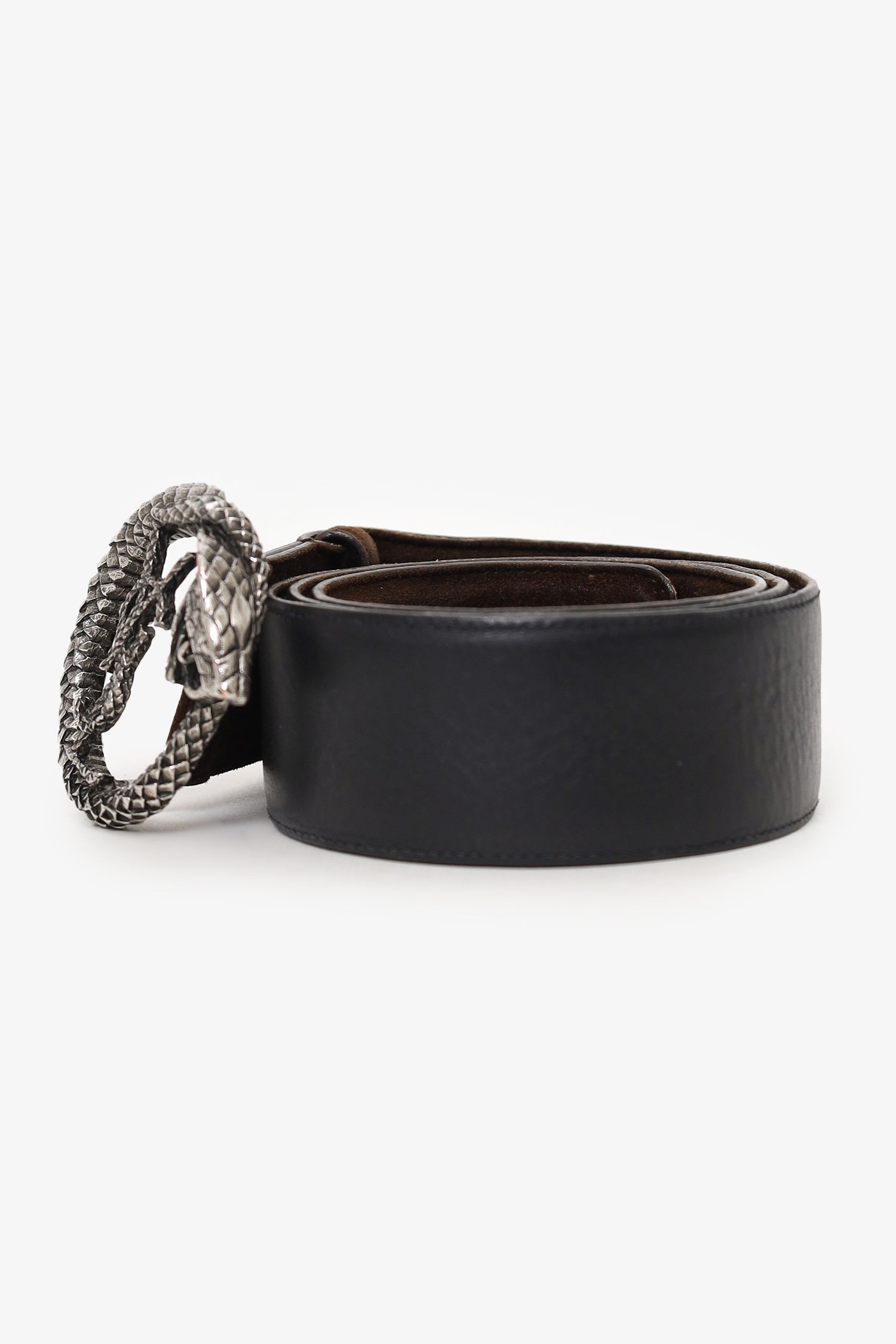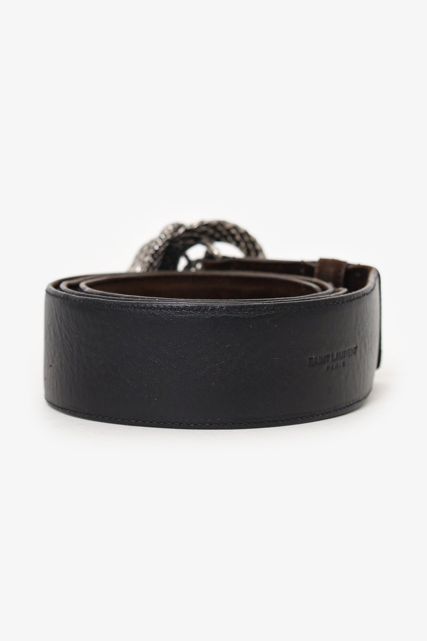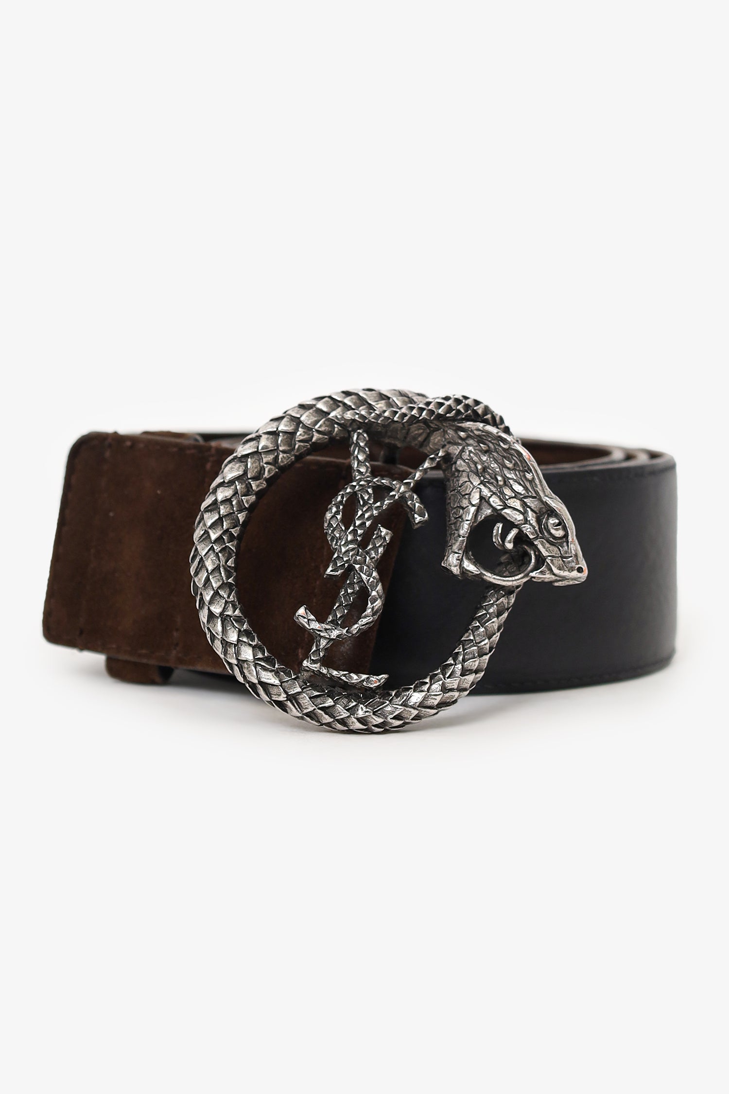 Refresh availabilitySaint Laurent Black/Brown Leather/Suede Belt Size 85. Adjustable pull-through buckle closure. Circular snake detail to silver-tone hardware. Tonal stitching.
