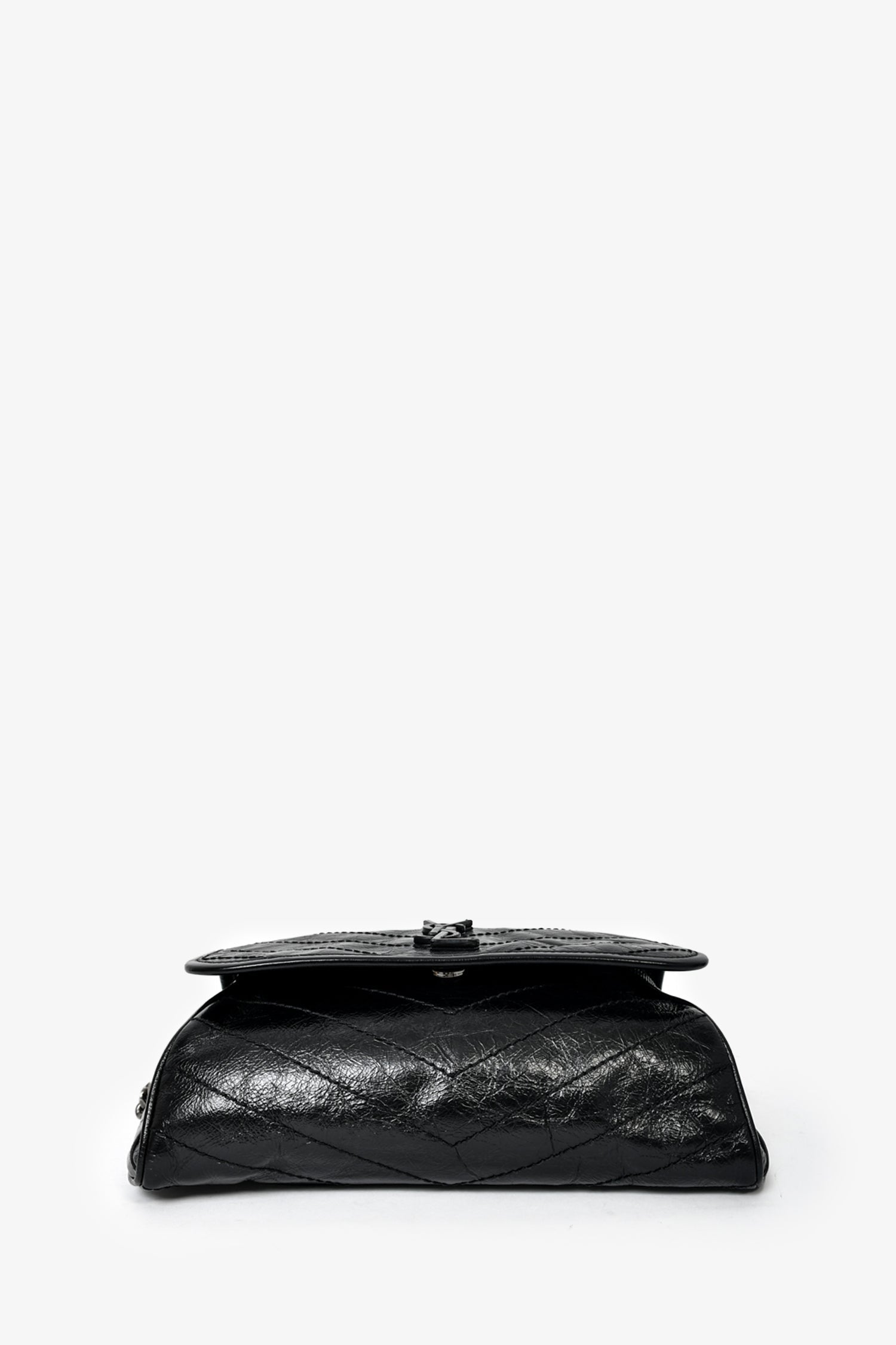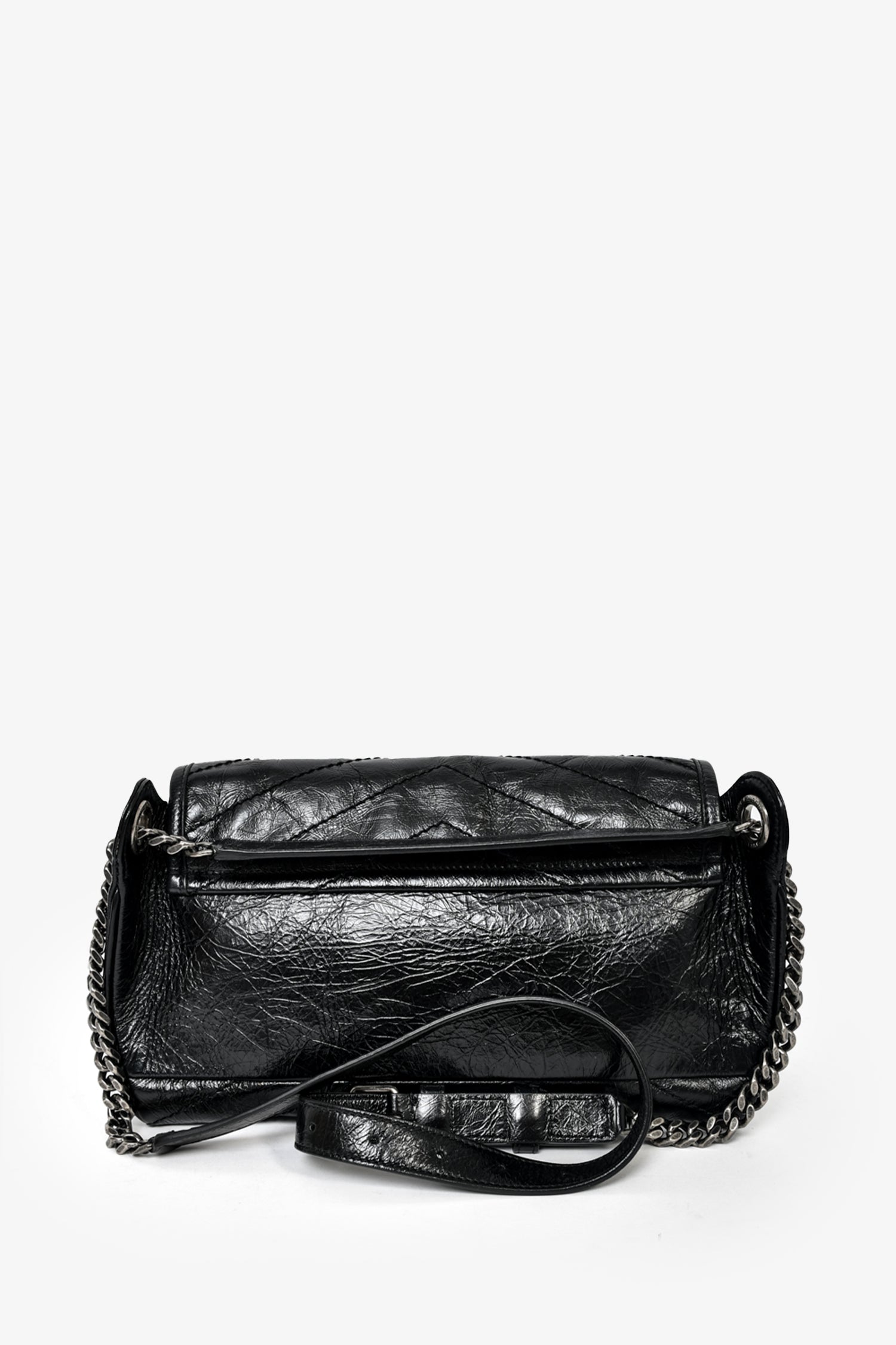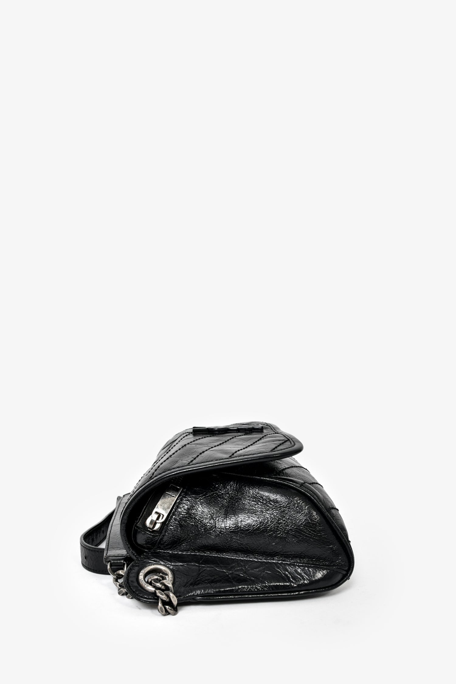 Saint Laurent Black Crinkled Leather 'Niki' Belt Bag. Fold-over flap with magnetic closure. Under-flap zip closure and slip pocket. 1 interior zip pocket. Adjustable strap. Gunmetal-toned hardware. Tonal stitching.
