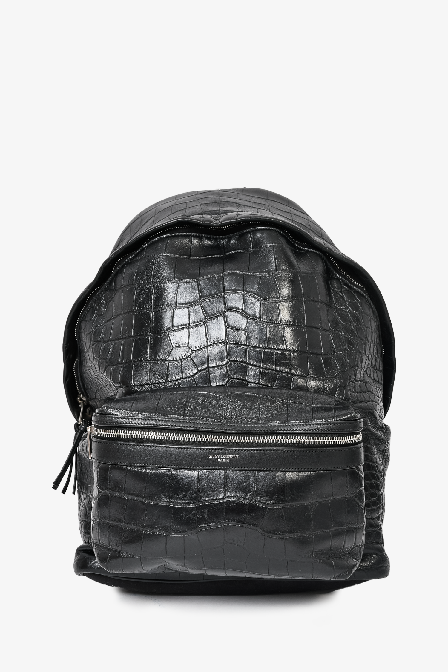 Refresh availabilitySaint Laurent Black Croc Embossed Leather Backpack. Top zip closure. 2 interior slip pockets. 1 interior zip pocket. 1 small interior phone pocket. Front pocket with zip closure and interior key leash. Card slot on back. Adjustable straps. Silver-toned hardware. Tonal stitching.