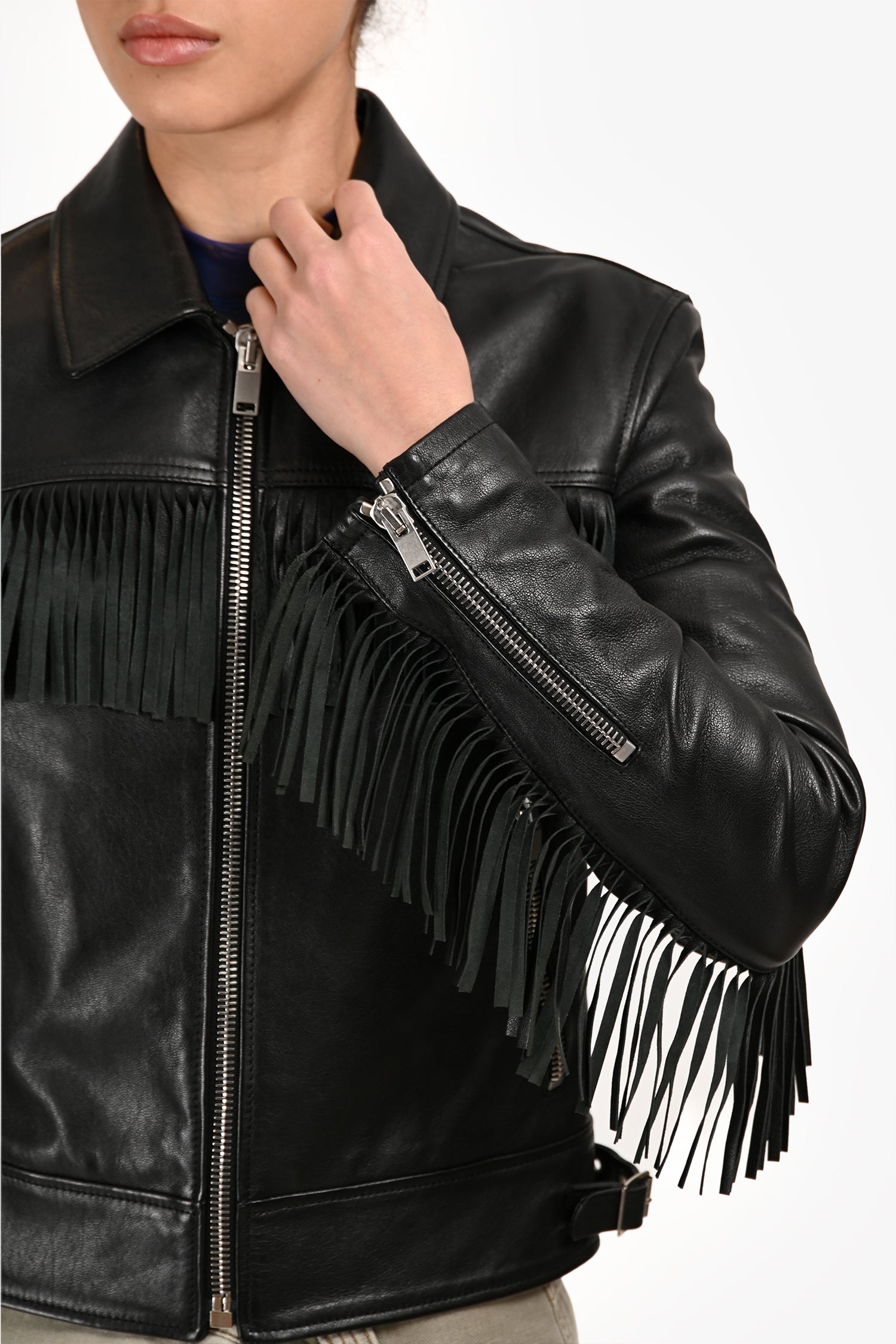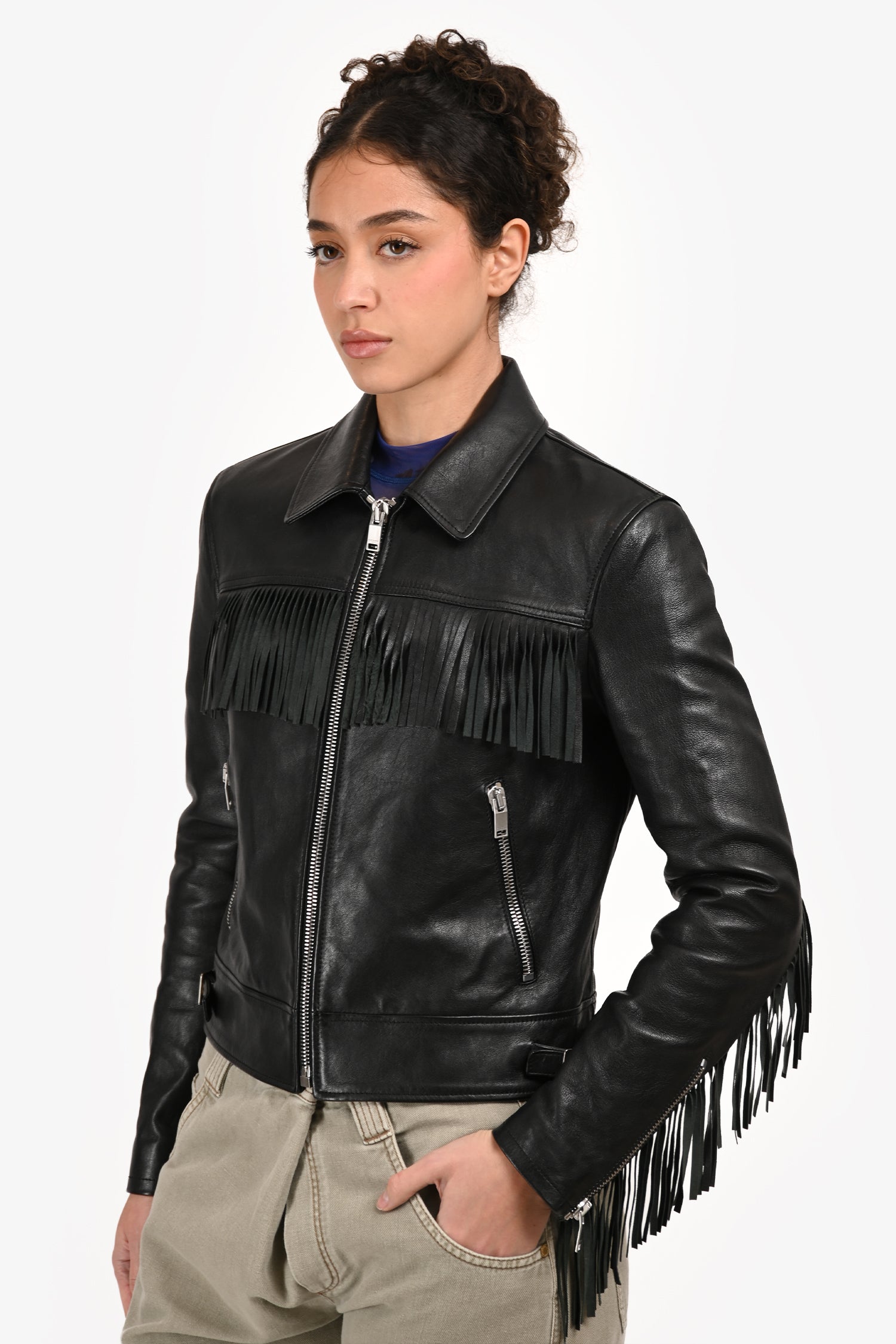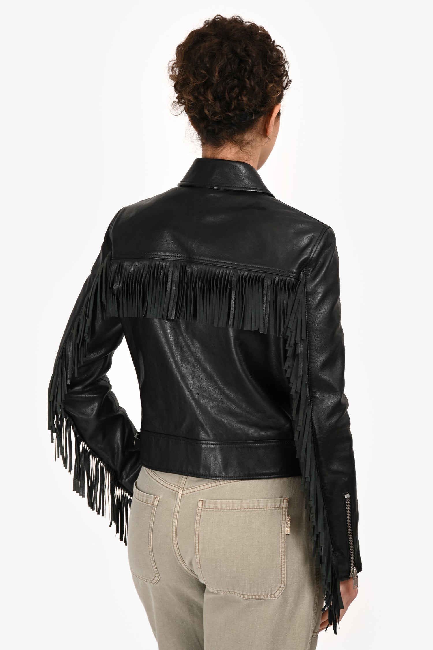Refresh availabilitySaint Laurent Black Leather Fringe Jacket. Slip-on. Collared neckline. Front zip closure. 2 front zip pockets. Lined interior. Zipper closure on the sleeve cuffs. Silver-tone hardware. Tonal stitching.