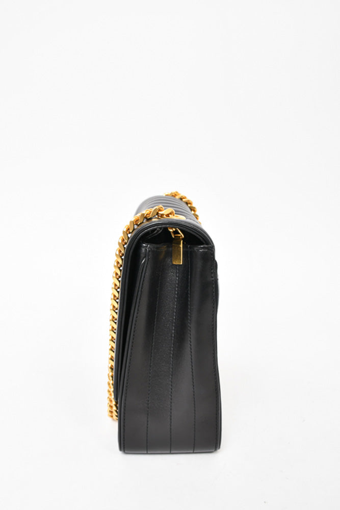 Refresh availabilitySaint Laurent Black Leather Large Vicky Chain Bag. Gold-tone hardware. Single exterior slip pocket on rear. Foldover flap with snap button closure. Tonal interior. Single interior wall slip pocket. Tonal stitching.