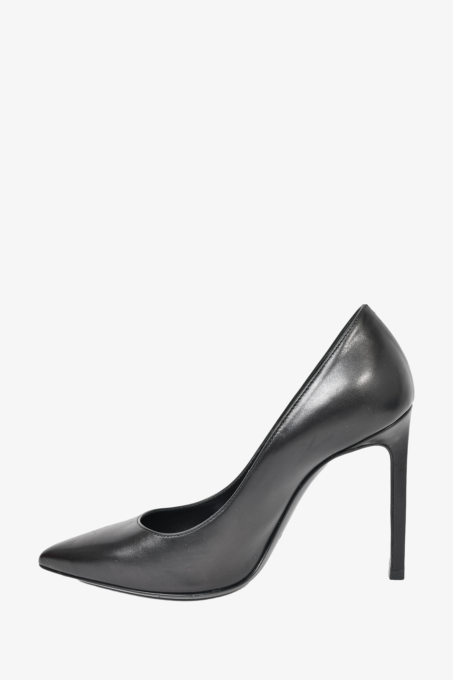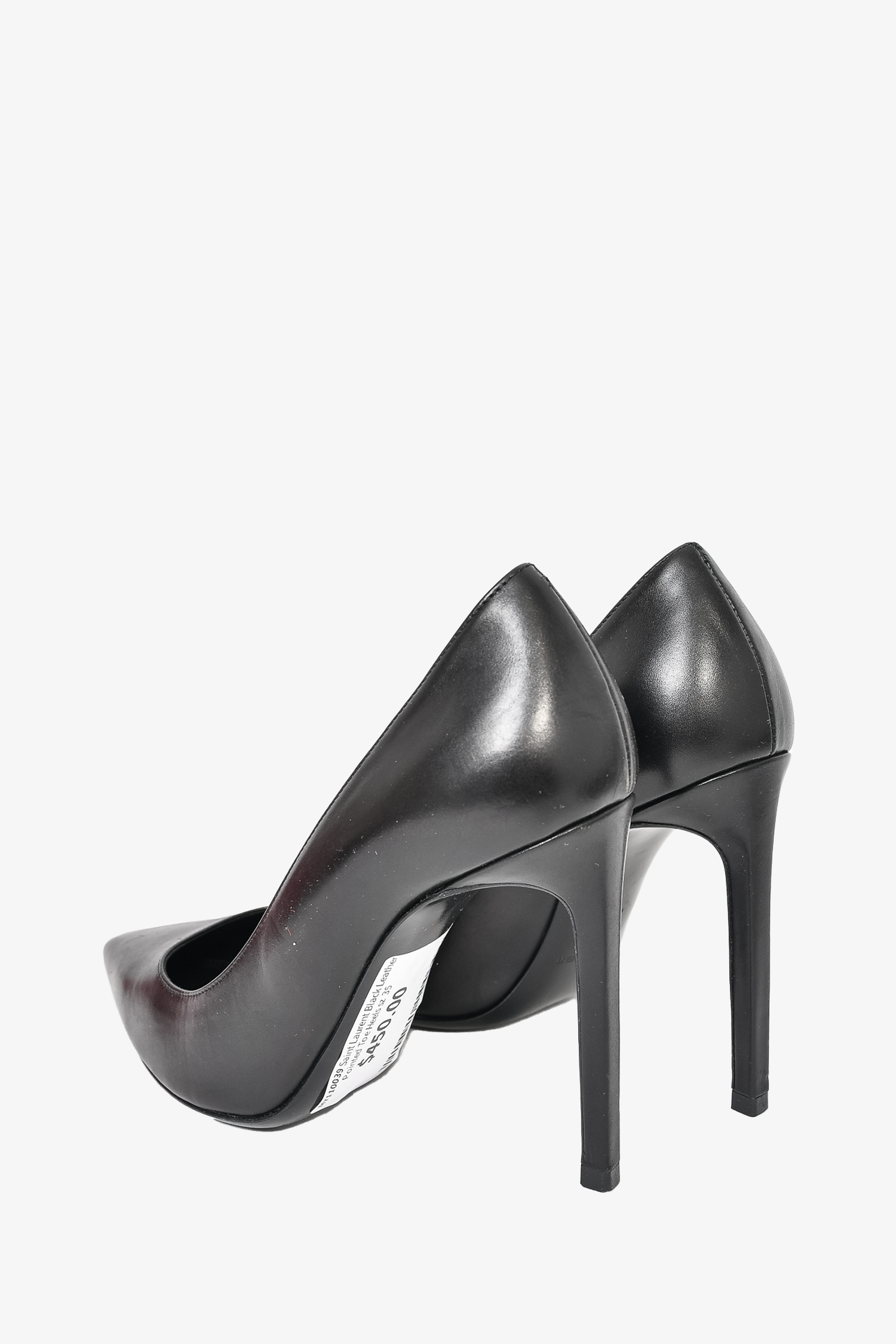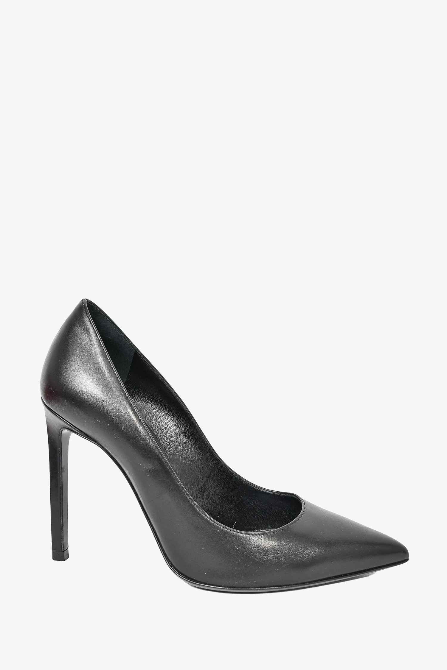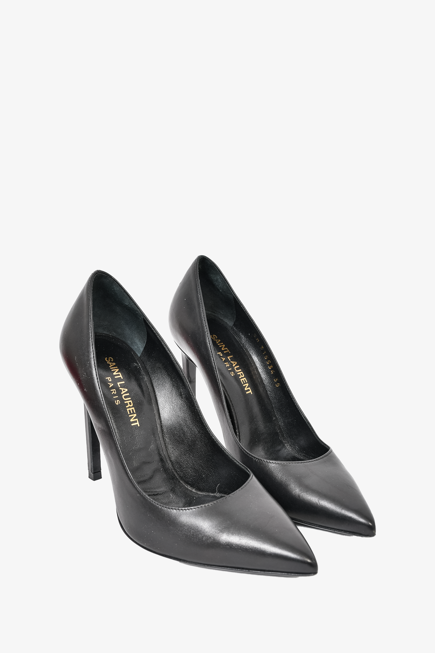 Refresh availabilitySaint Laurent Black Leather Pointed Toe Heels. Stiletto heel. Pointed toe. Tonal stitching. Matte finish.