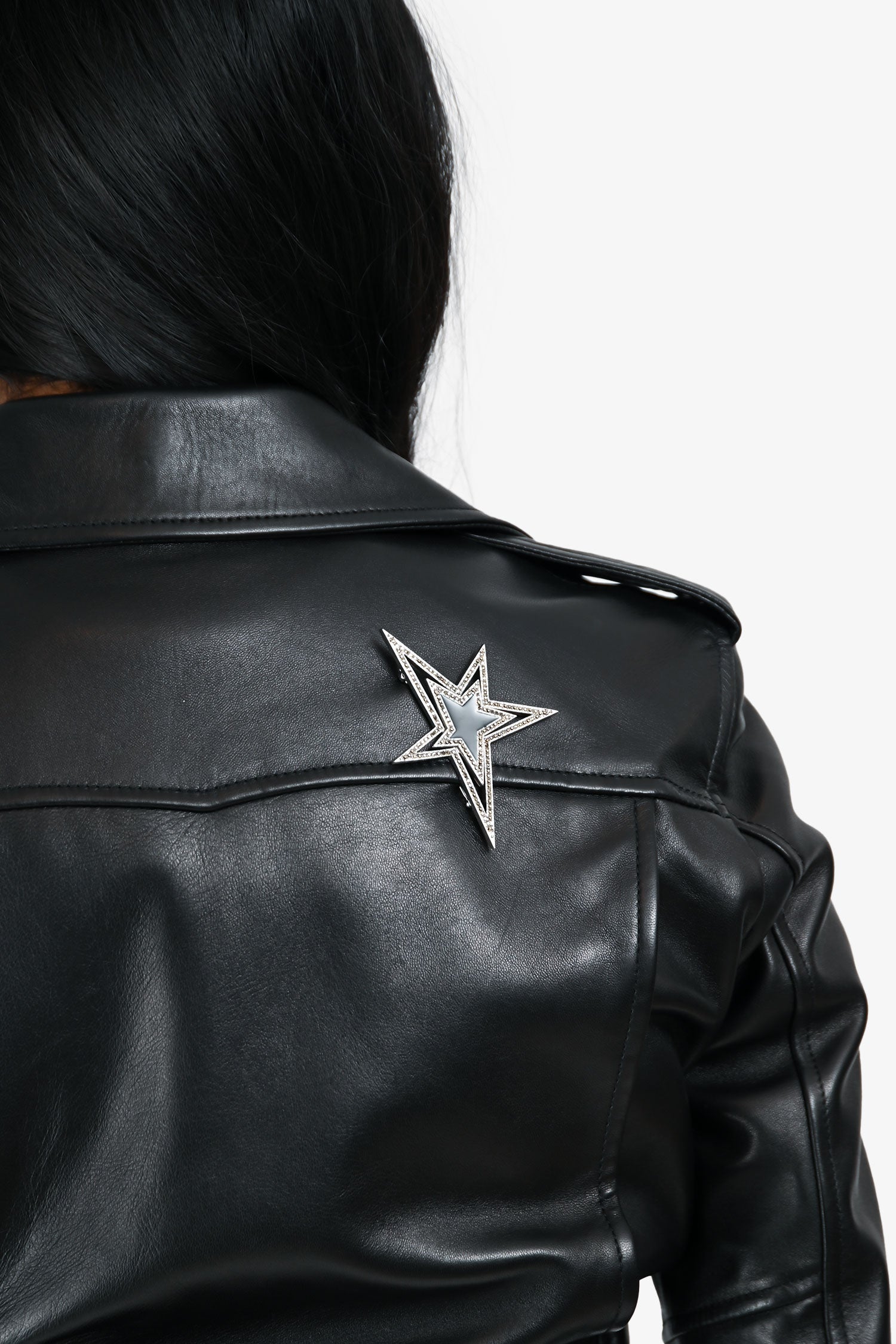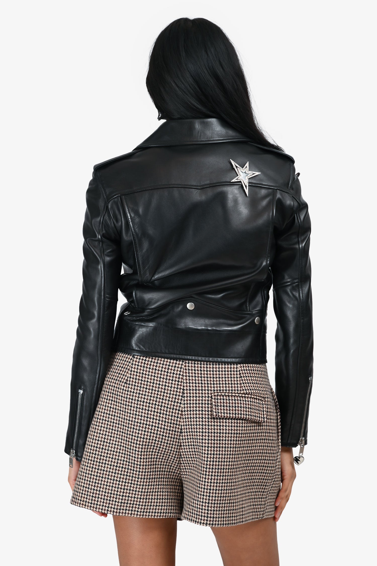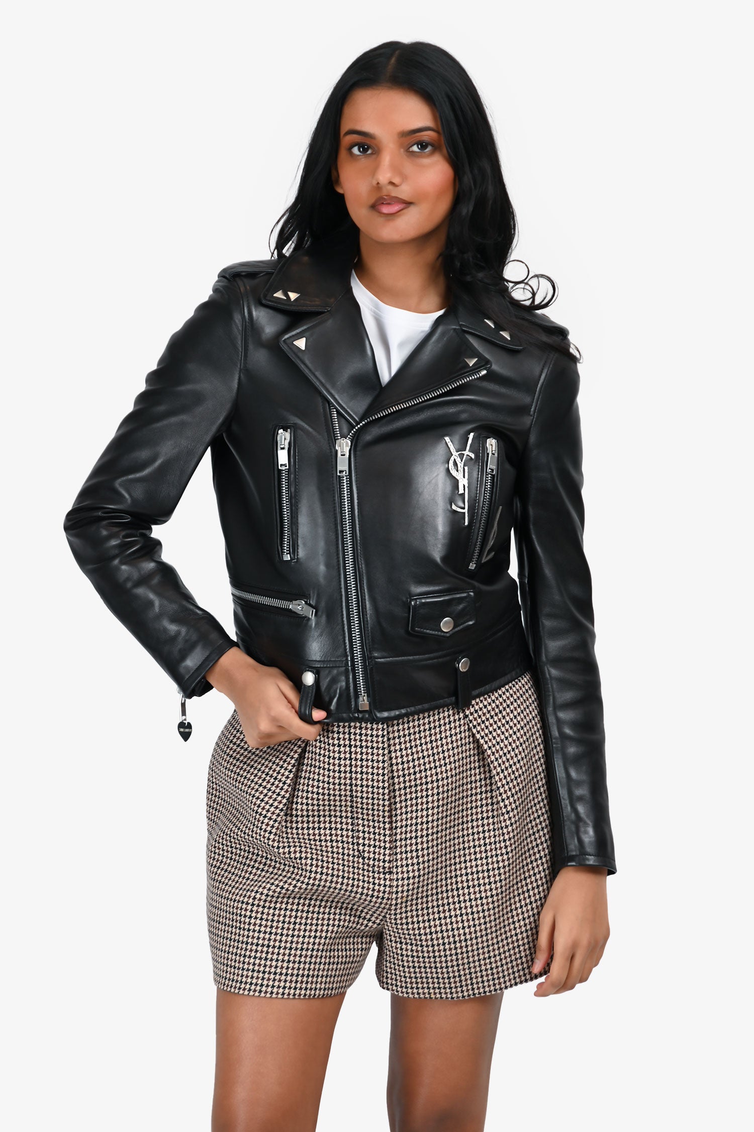 Refresh availabilitySaint Laurent Black Leather 'YSL' Biker Jacket. Pull-on. Collared neckline. Front zipper closure. 6 pockets: 3 exterior side zip, 1 exterior button, 2 interior slip. Sleeves with zipper closure. Rear detachable star embellished pin. Lined interior. Silver-tone hardware. Tonal stitching.