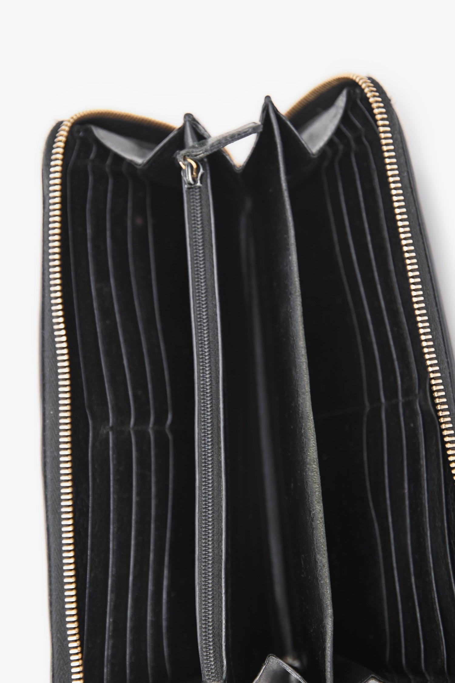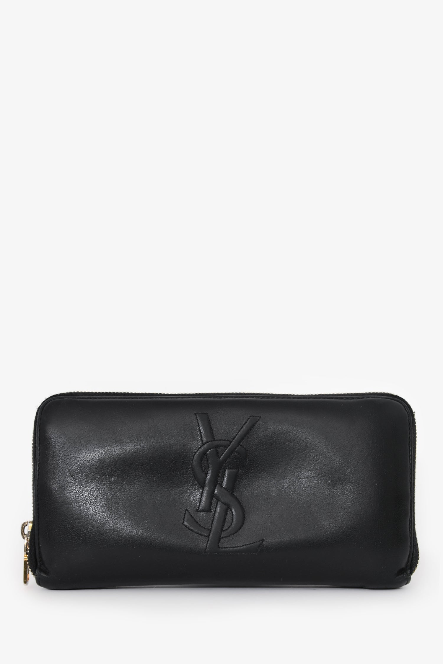 Refresh availabilitySaint Laurent Black Leather Zip-Around Large Wallet. Zip-around closure. Accordion-style interior with 2 bill compartments, 16 card slots, and 1 zip coin pocket. Gold-tone hardware. Tonal stitching.