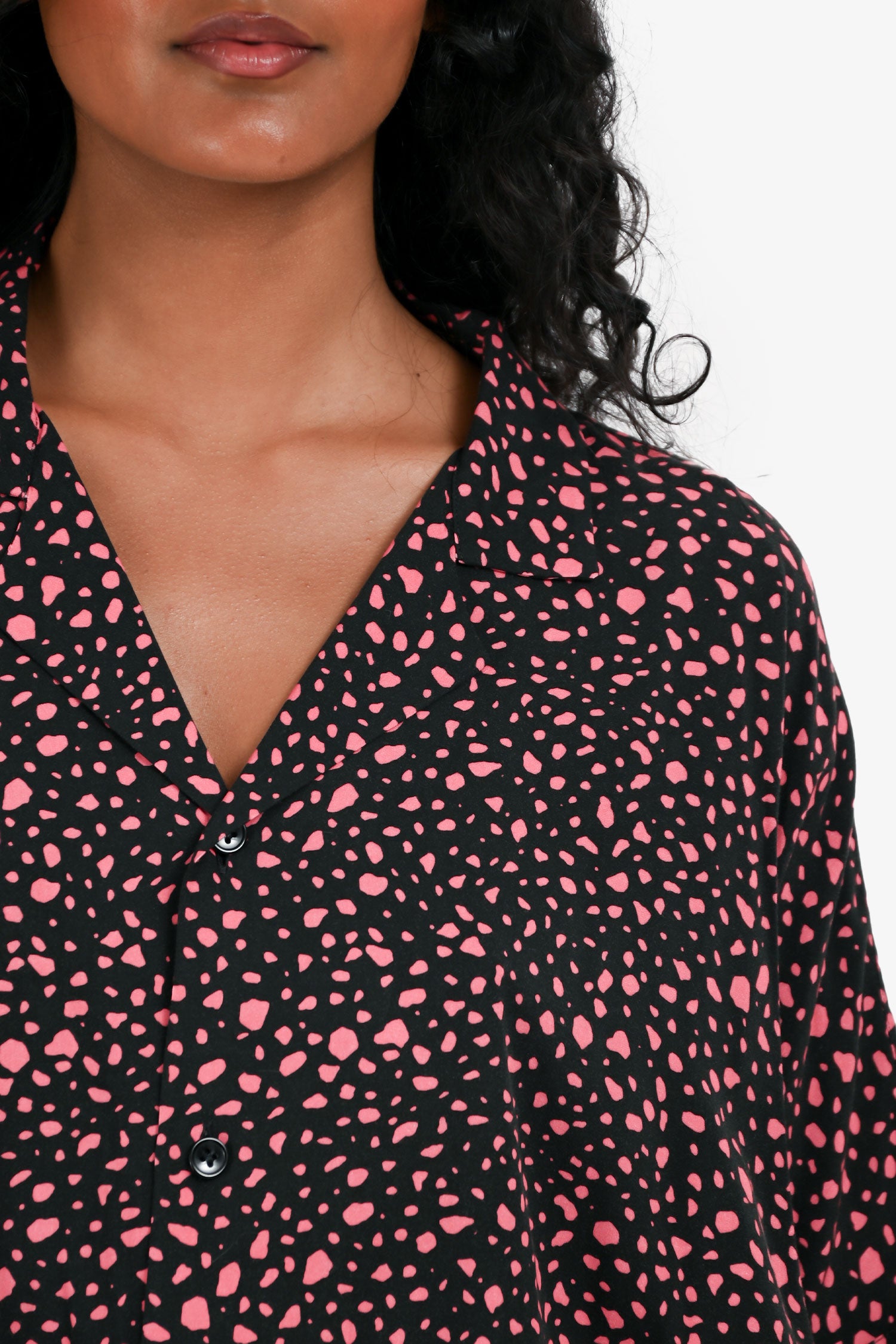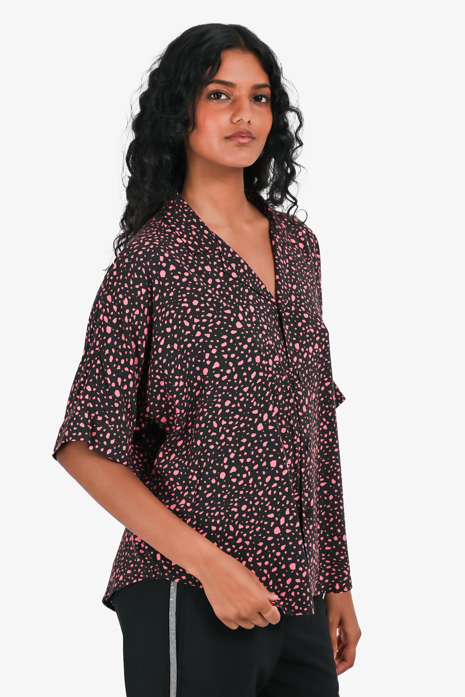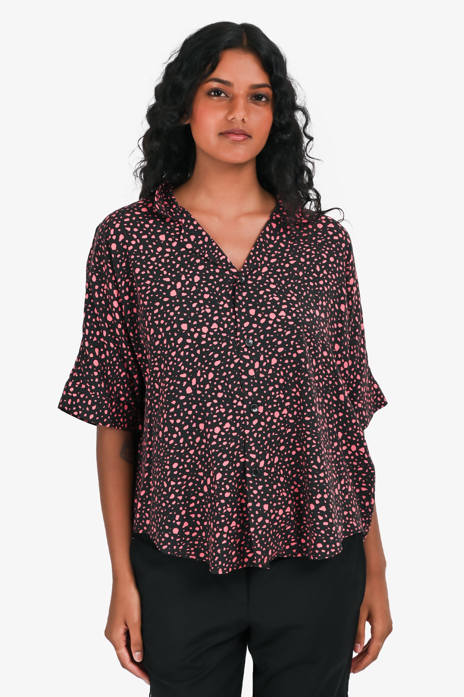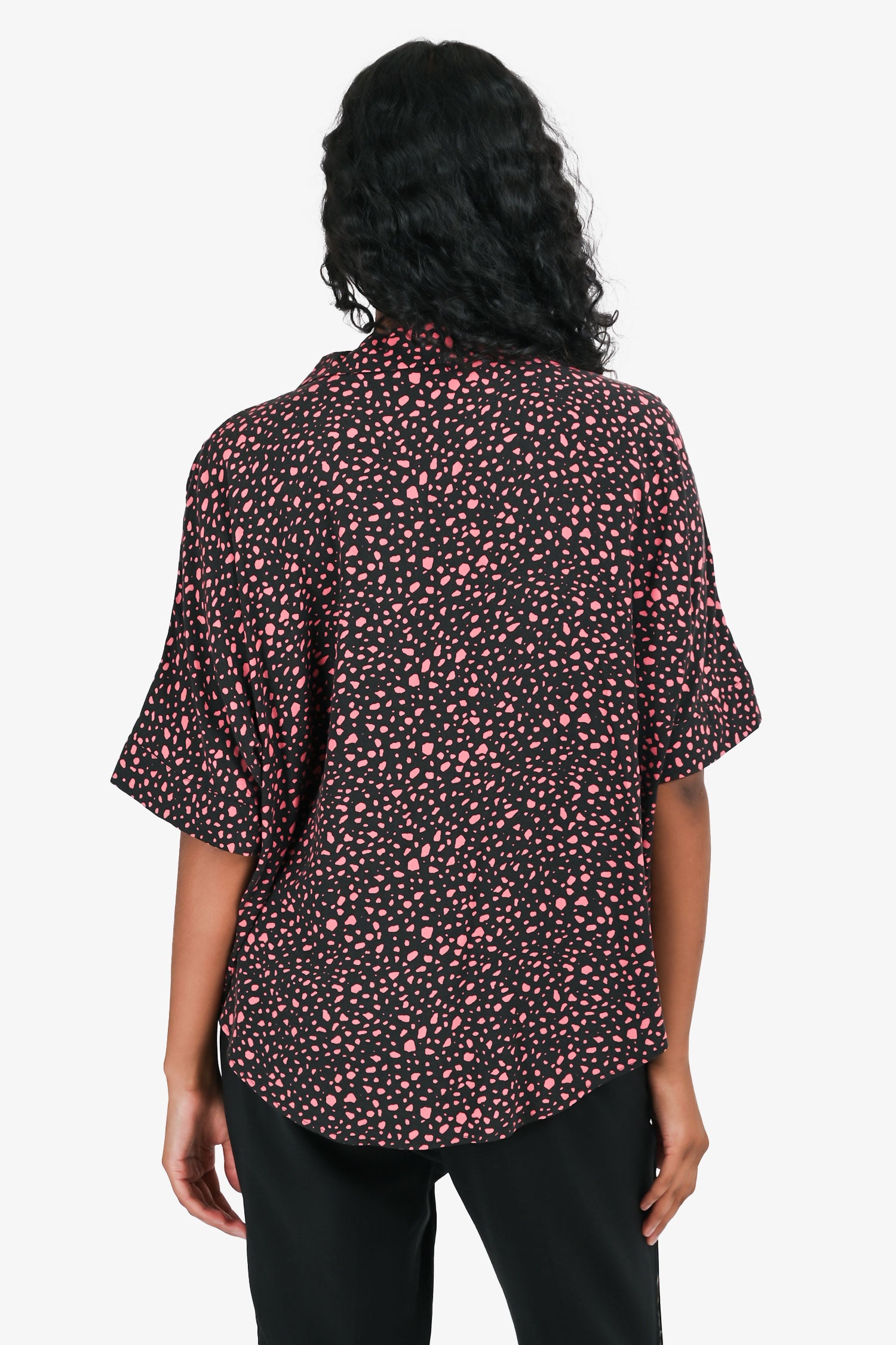 Refresh availabilitySaint Laurent Black/Pink Dotted Short Sleeve Button Down Shirt. Classic collar. Short sleeves. Front button closure. Tonal stitching.