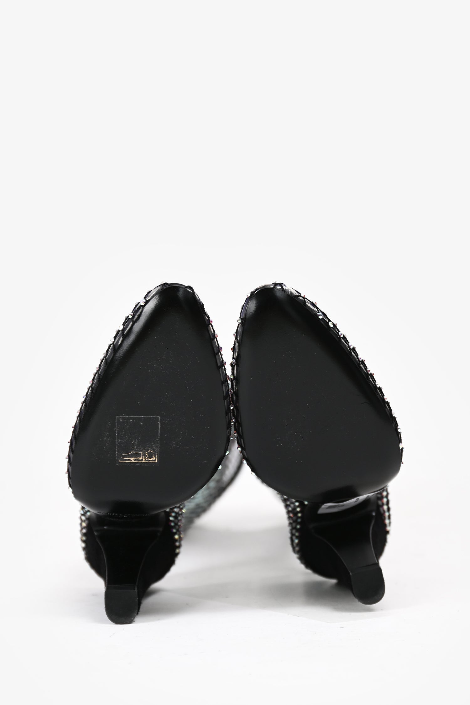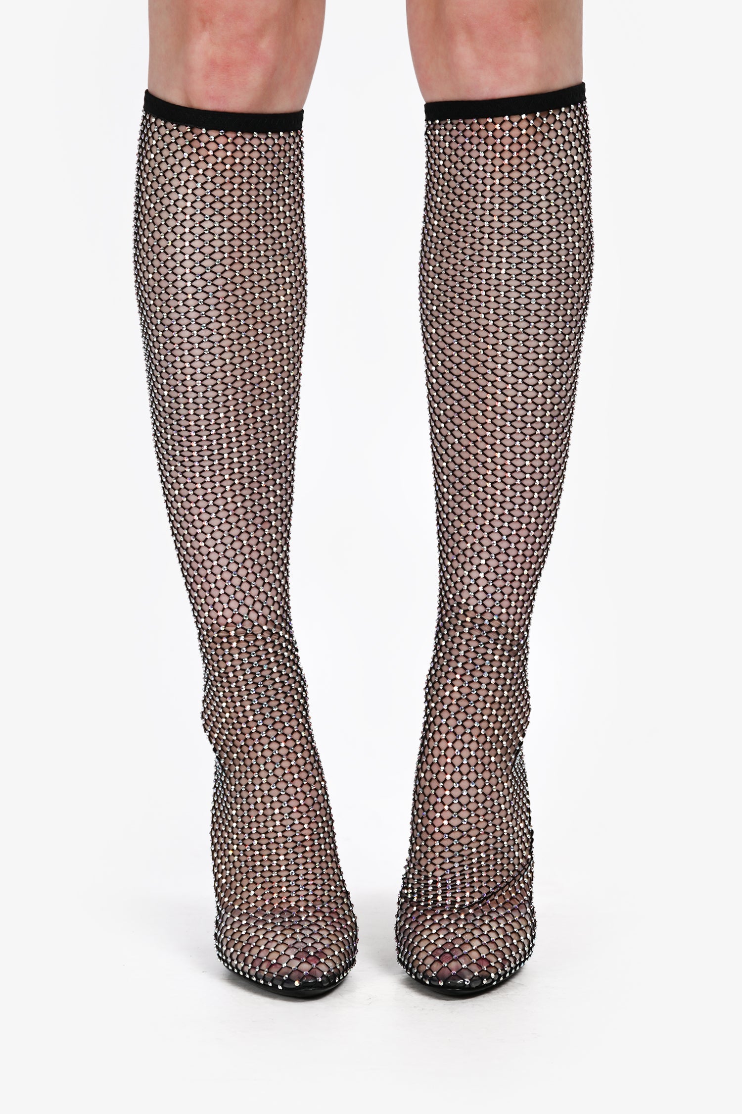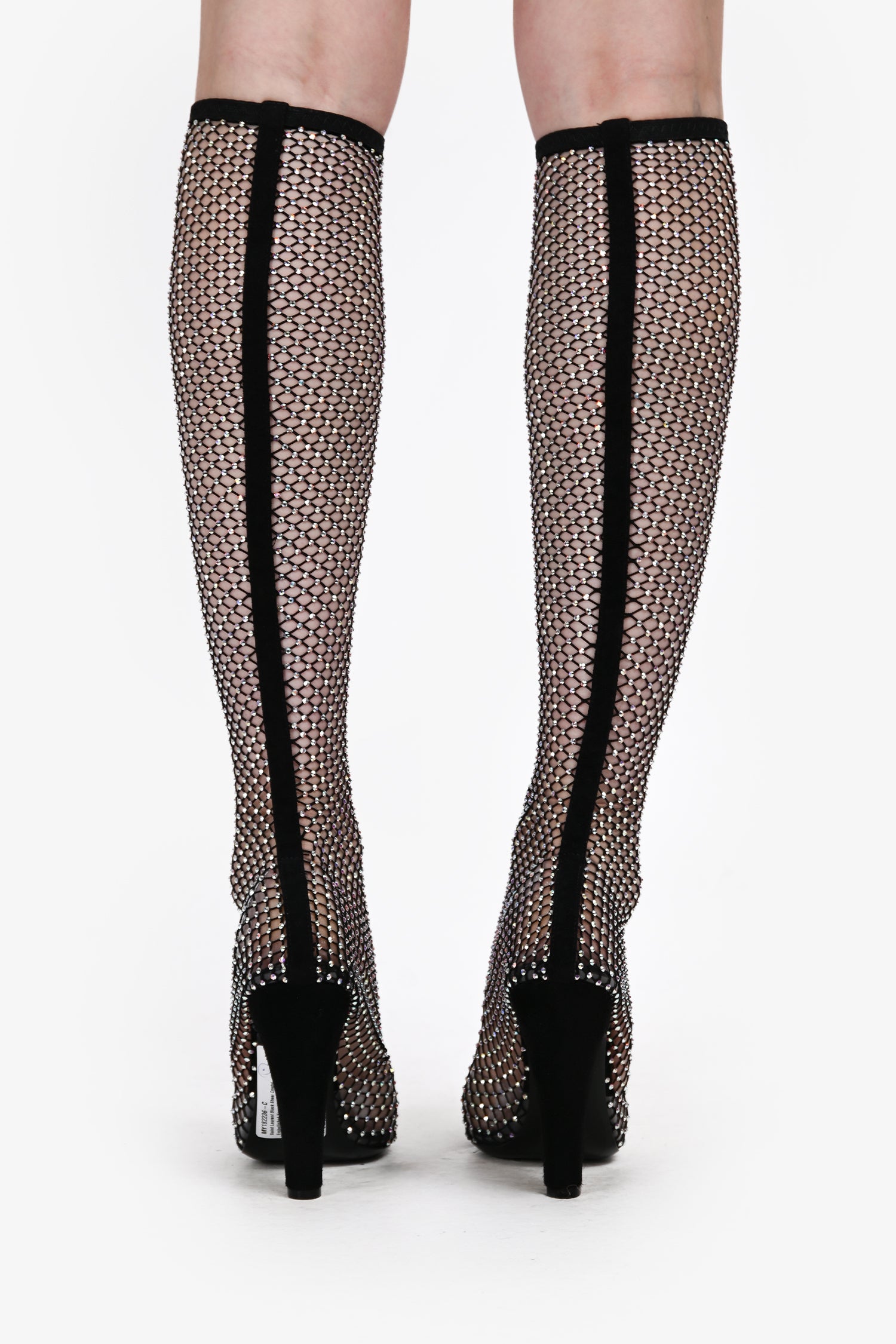 Refresh availabilitySaint Laurent Black Sheer Crystal Embellished Knee High Boots. Pull-on. Pointed toe. Contrast suede material on the heel. Tonal stitching.