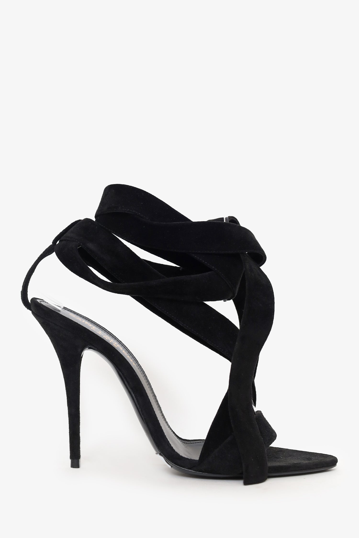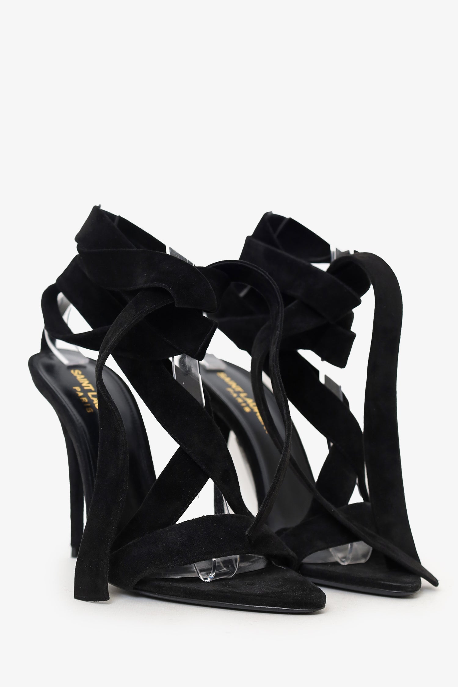Refresh availabilitySaint Laurent Black Suede Deva 105 Strappy Heels. Slip-on. Open pointed-toe. Wrap-around ankle straps with tie-up closure. Tonal stitching.
