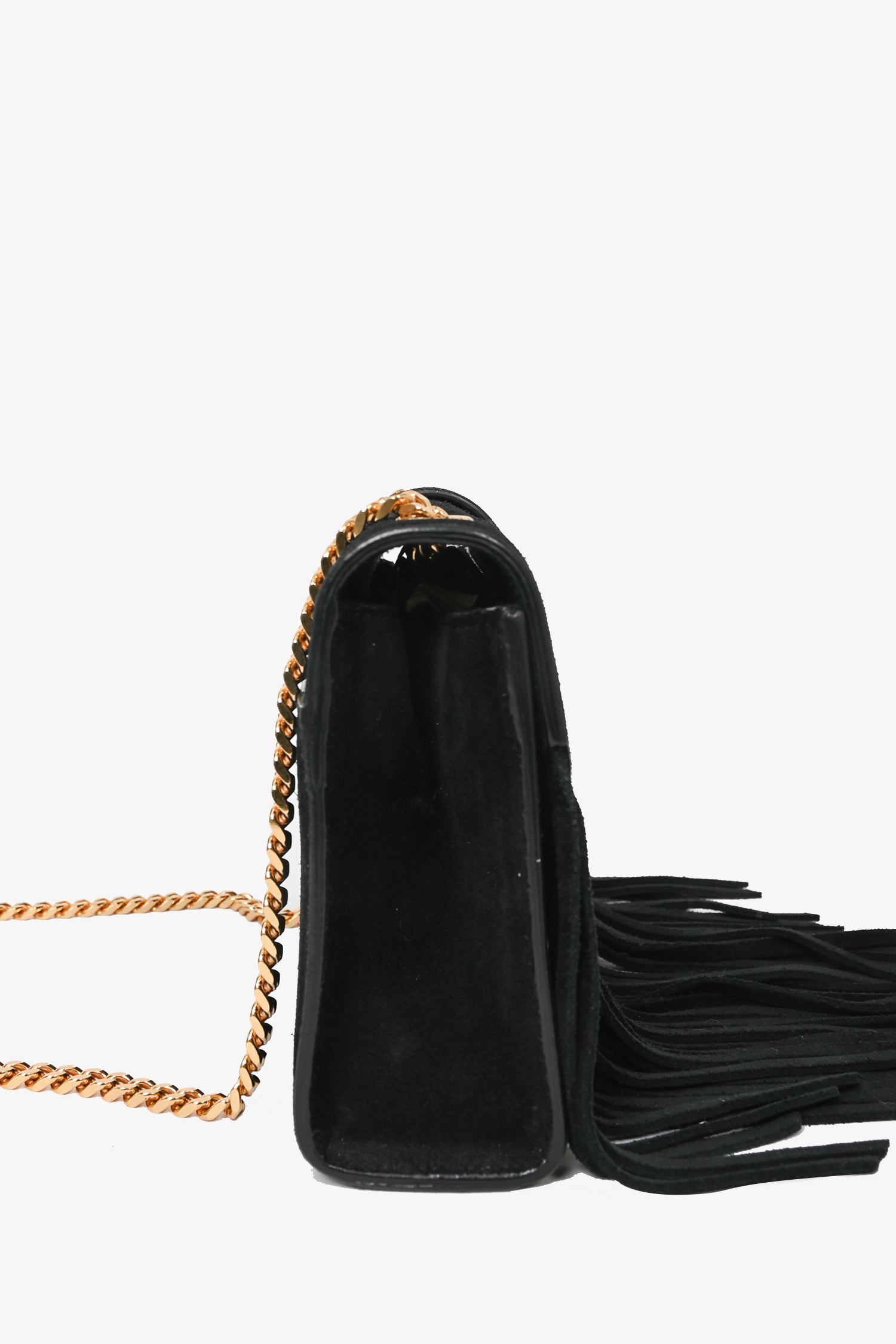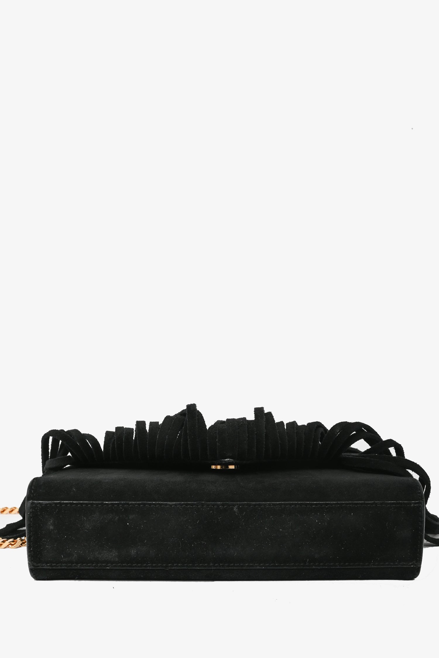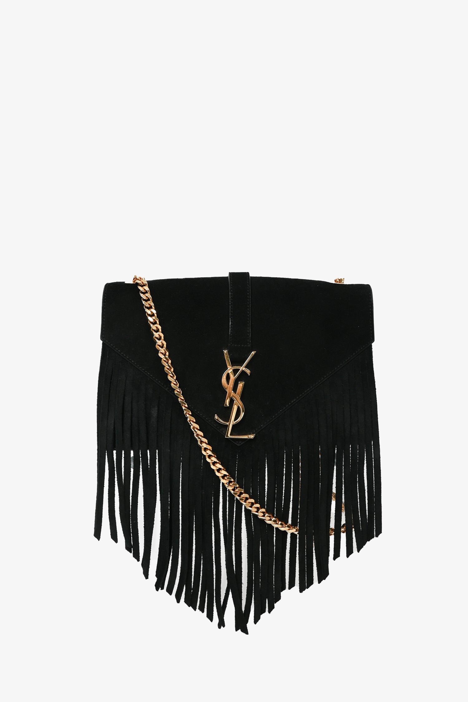 Refresh availabilitySaint Laurent Black Suede Leather Fringe Detailed Crossbody Bag. Front fold-over flap with magnetic button closure. Tonal interior. Single interior wall slip pocket. Slide-around chain. Gold-tone hardware. Tonal stitching.
