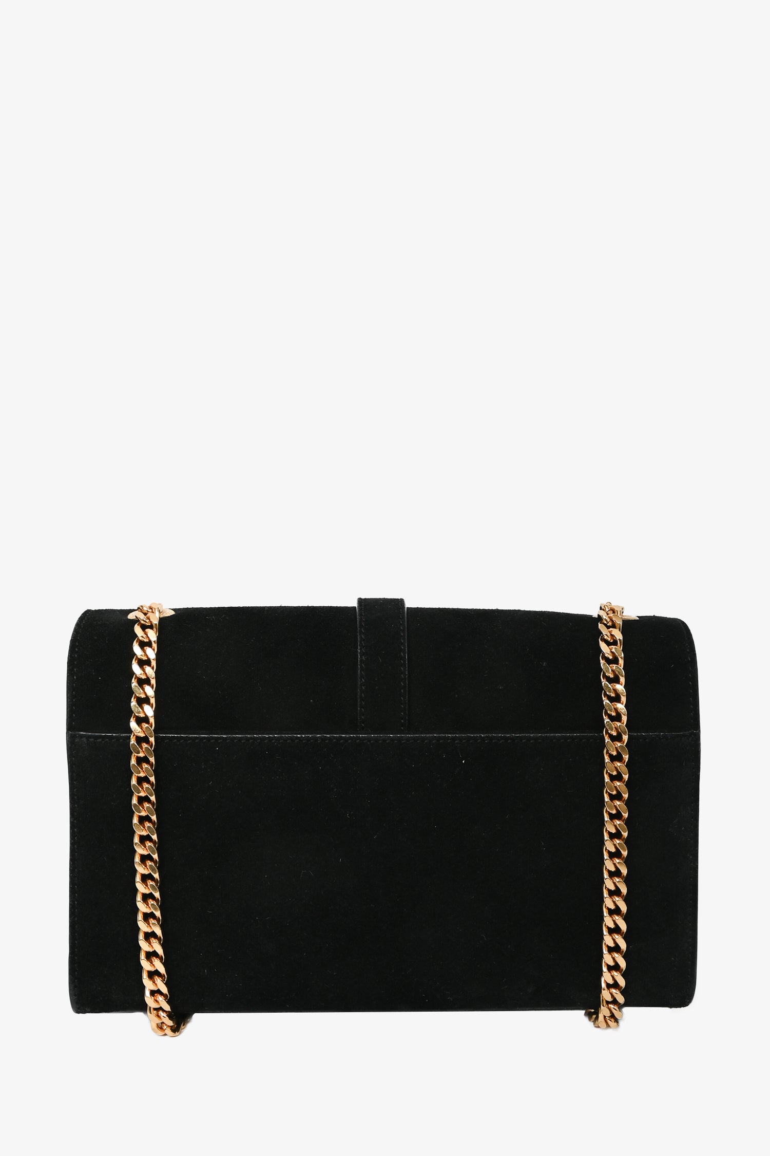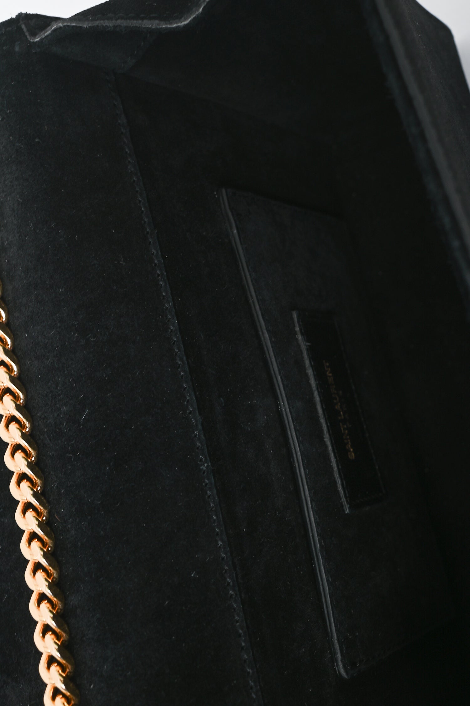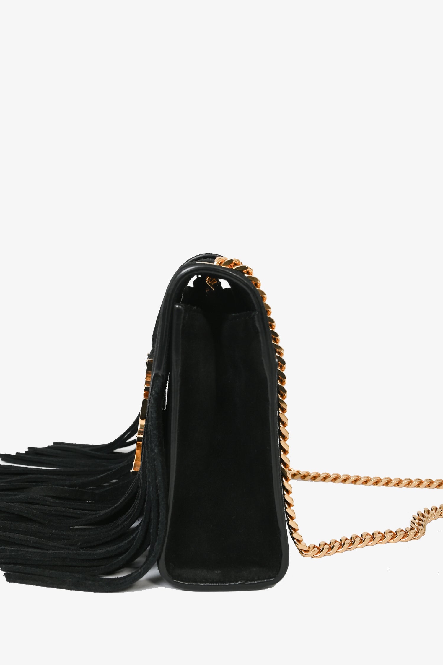 Refresh availabilitySaint Laurent Black Suede Leather Fringe Detailed Crossbody Bag. Front fold-over flap with magnetic button closure. Tonal interior. Single interior wall slip pocket. Slide-around chain. Gold-tone hardware. Tonal stitching.