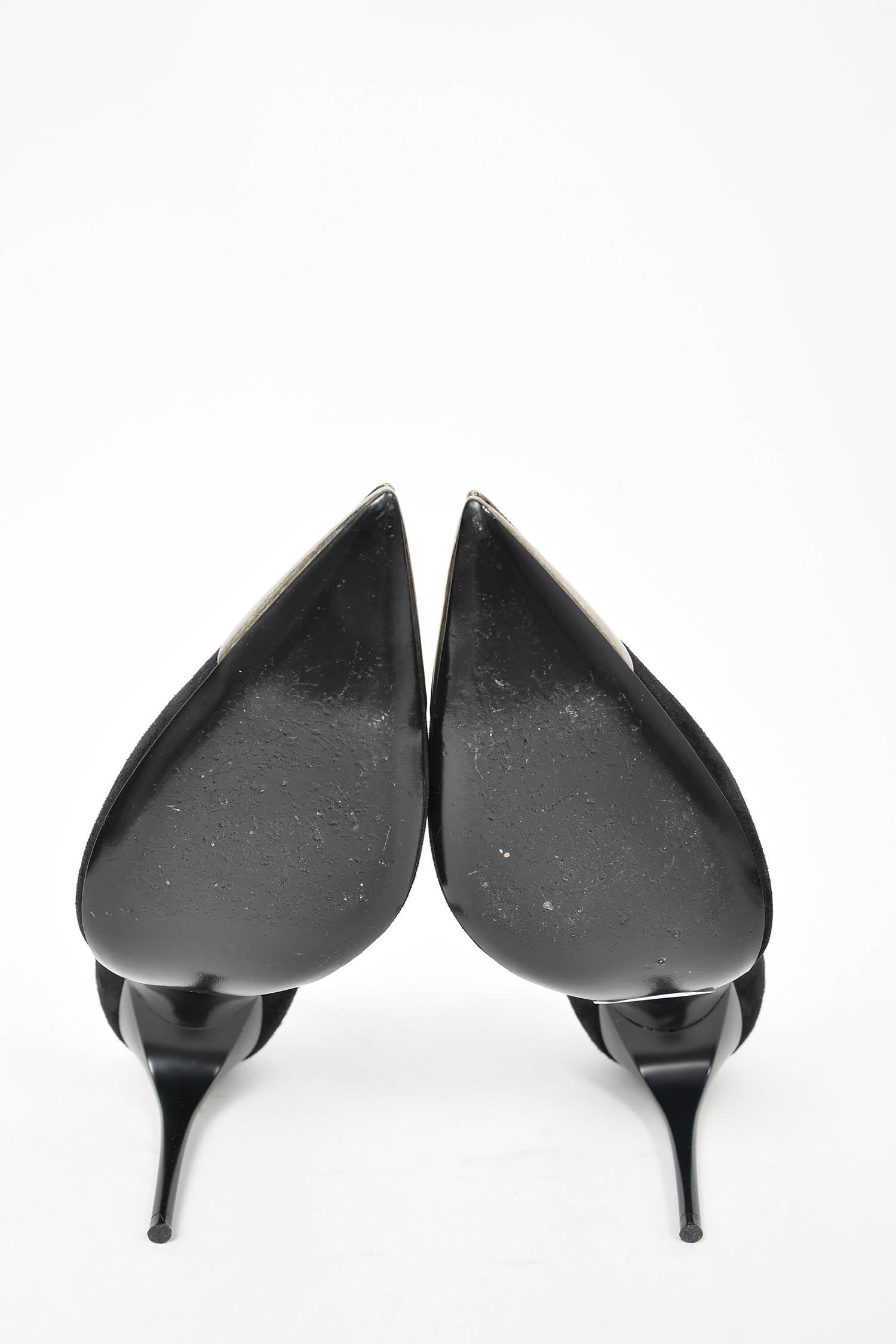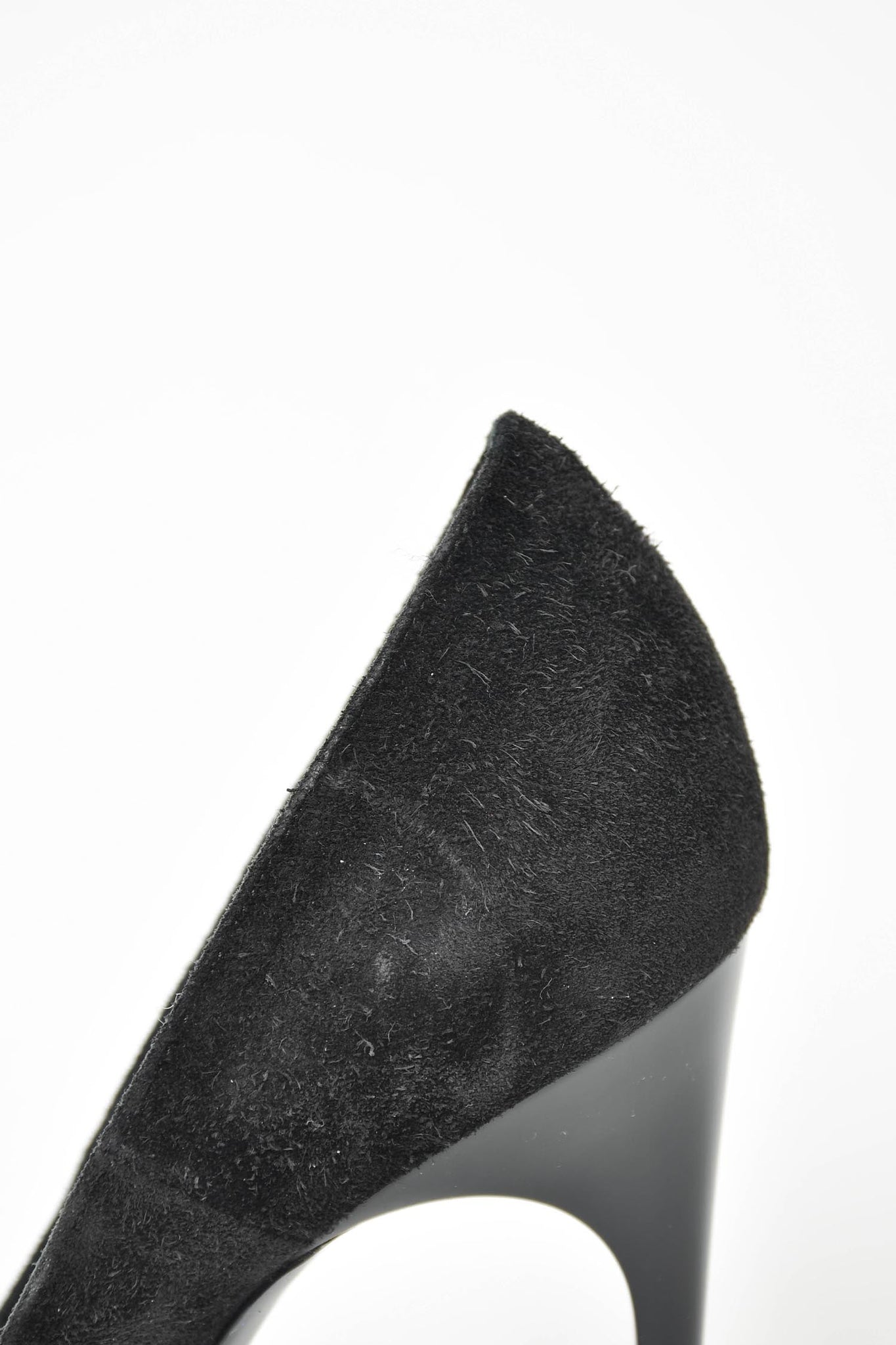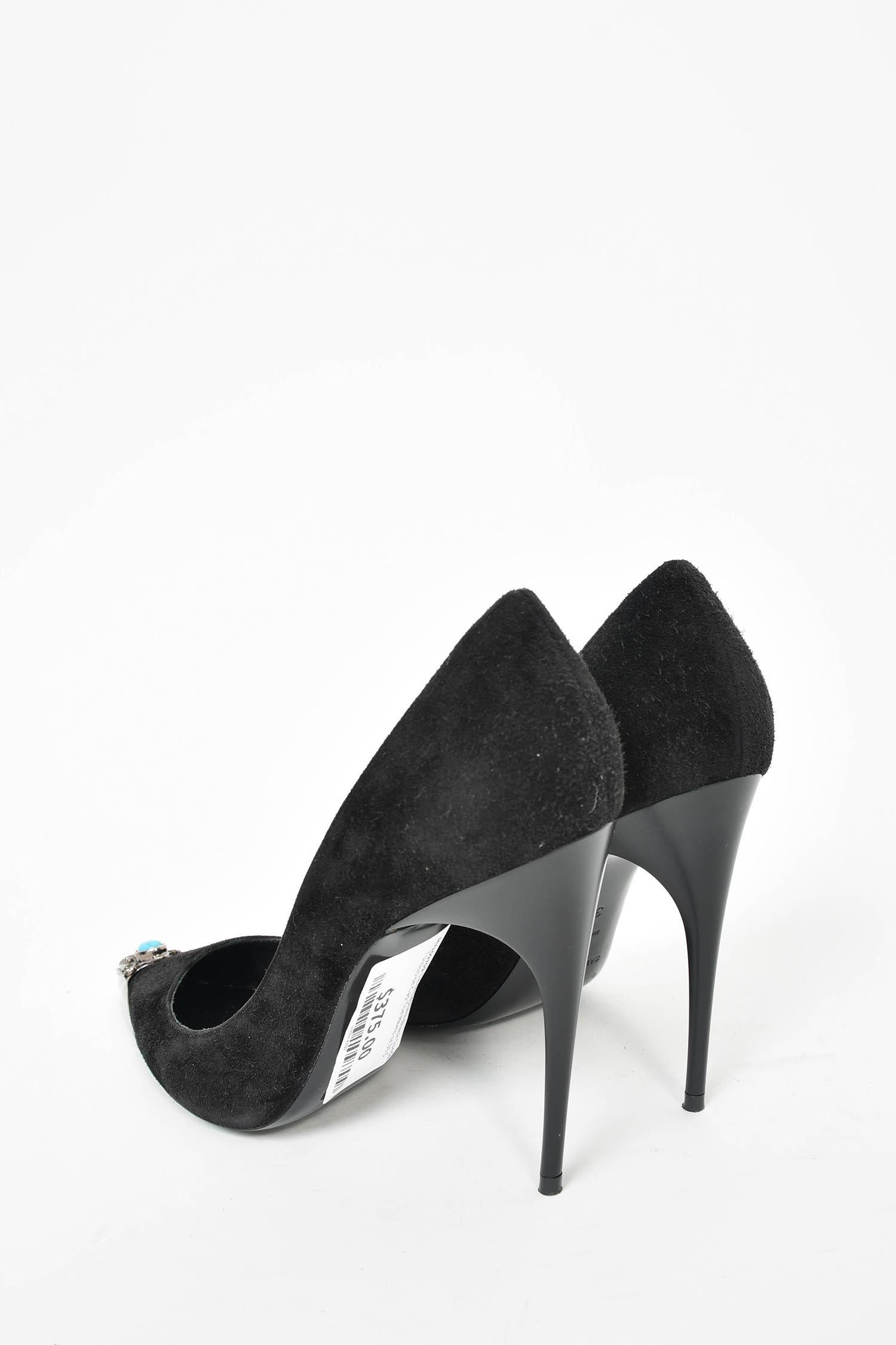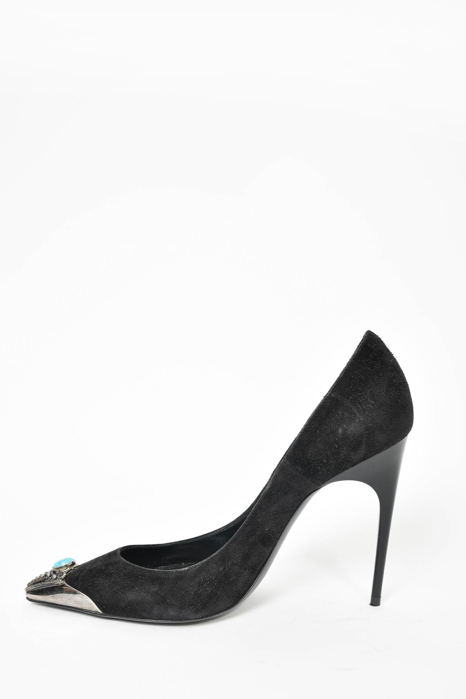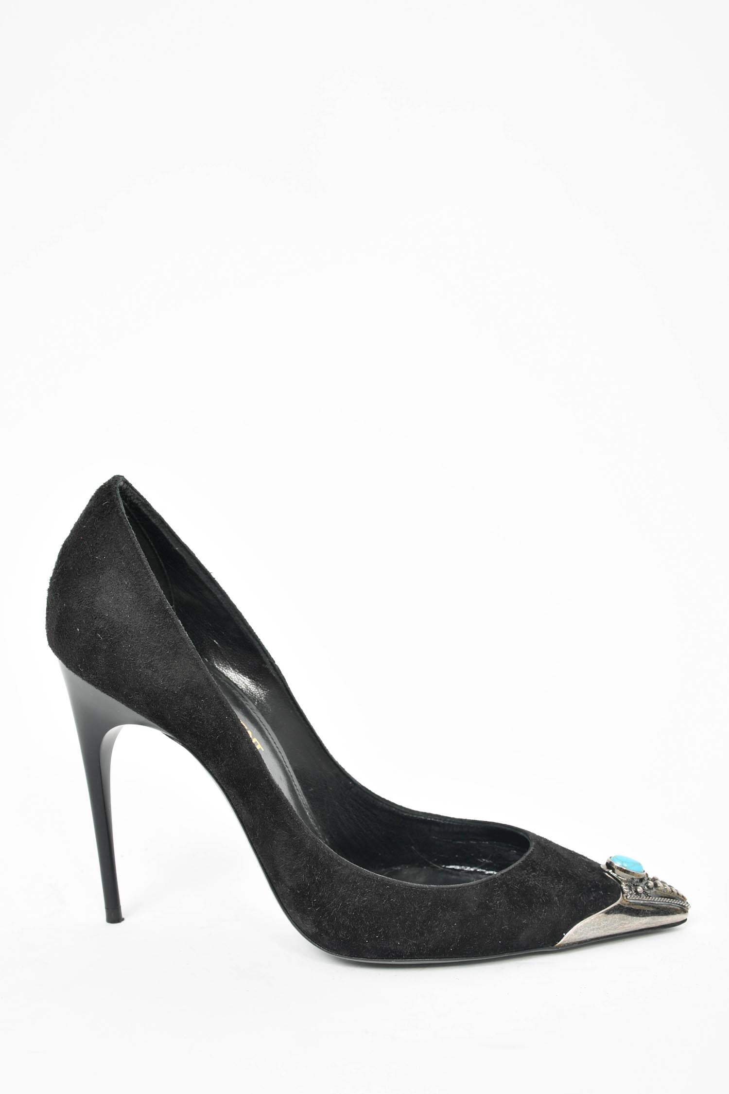 Refresh availabilitySaint Laurent Black Suede Turquoise Cap Toe Heels. Pointed toe. Tonal stitching.
