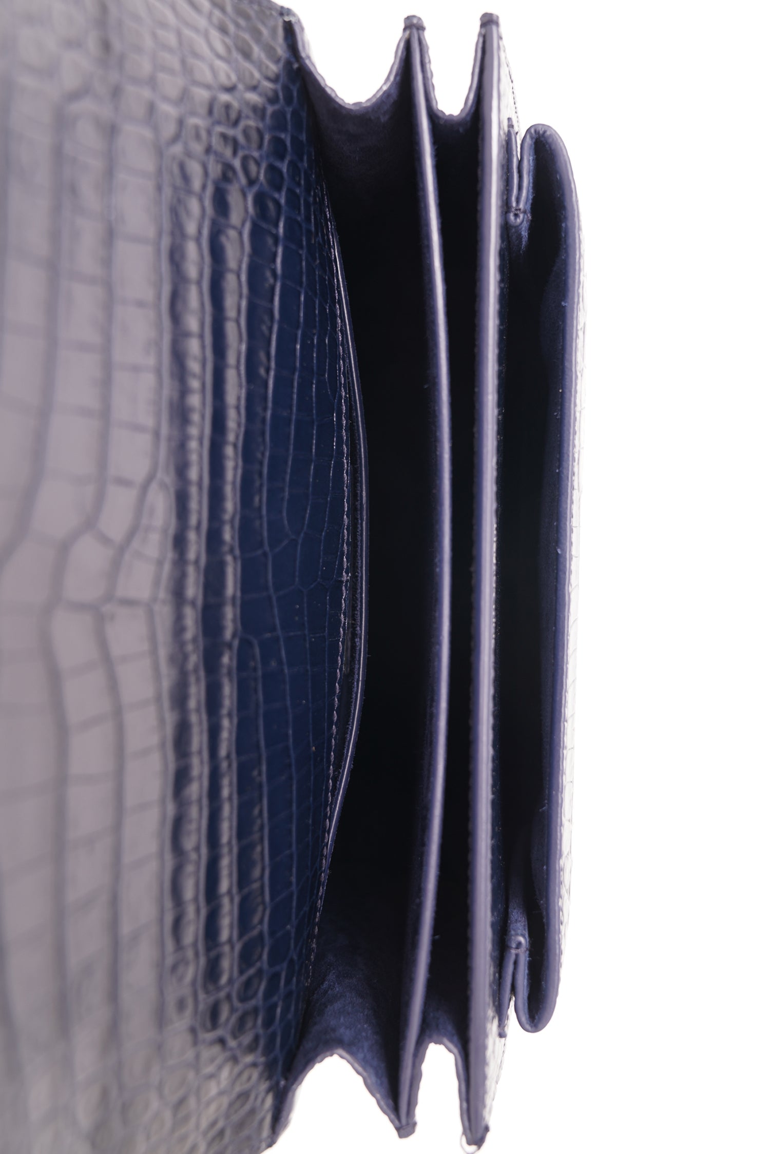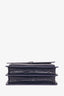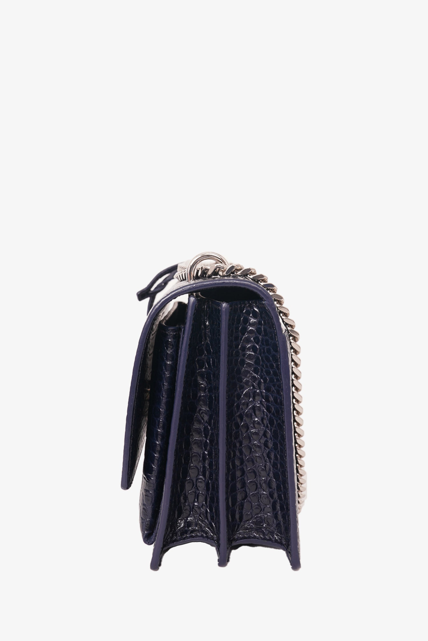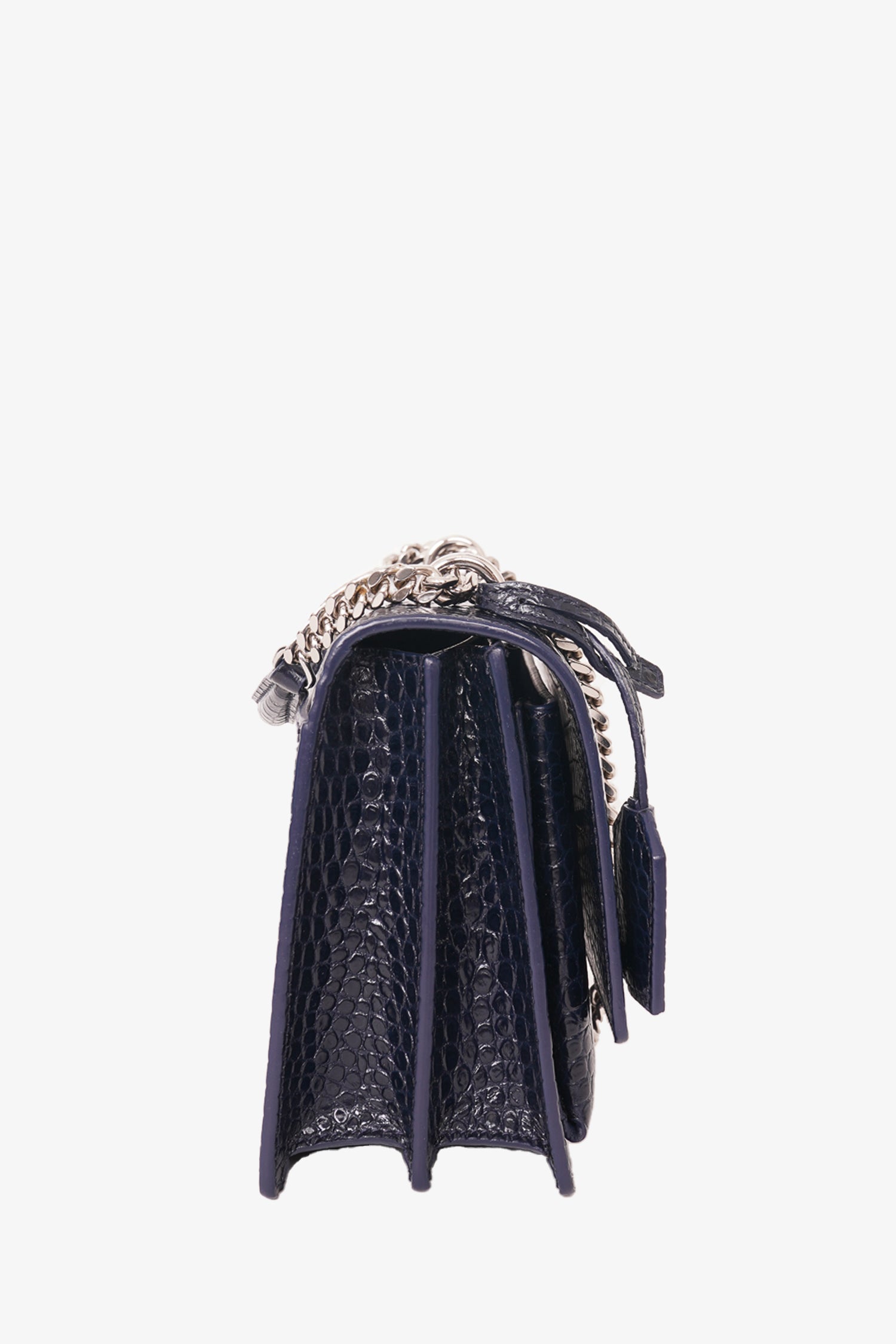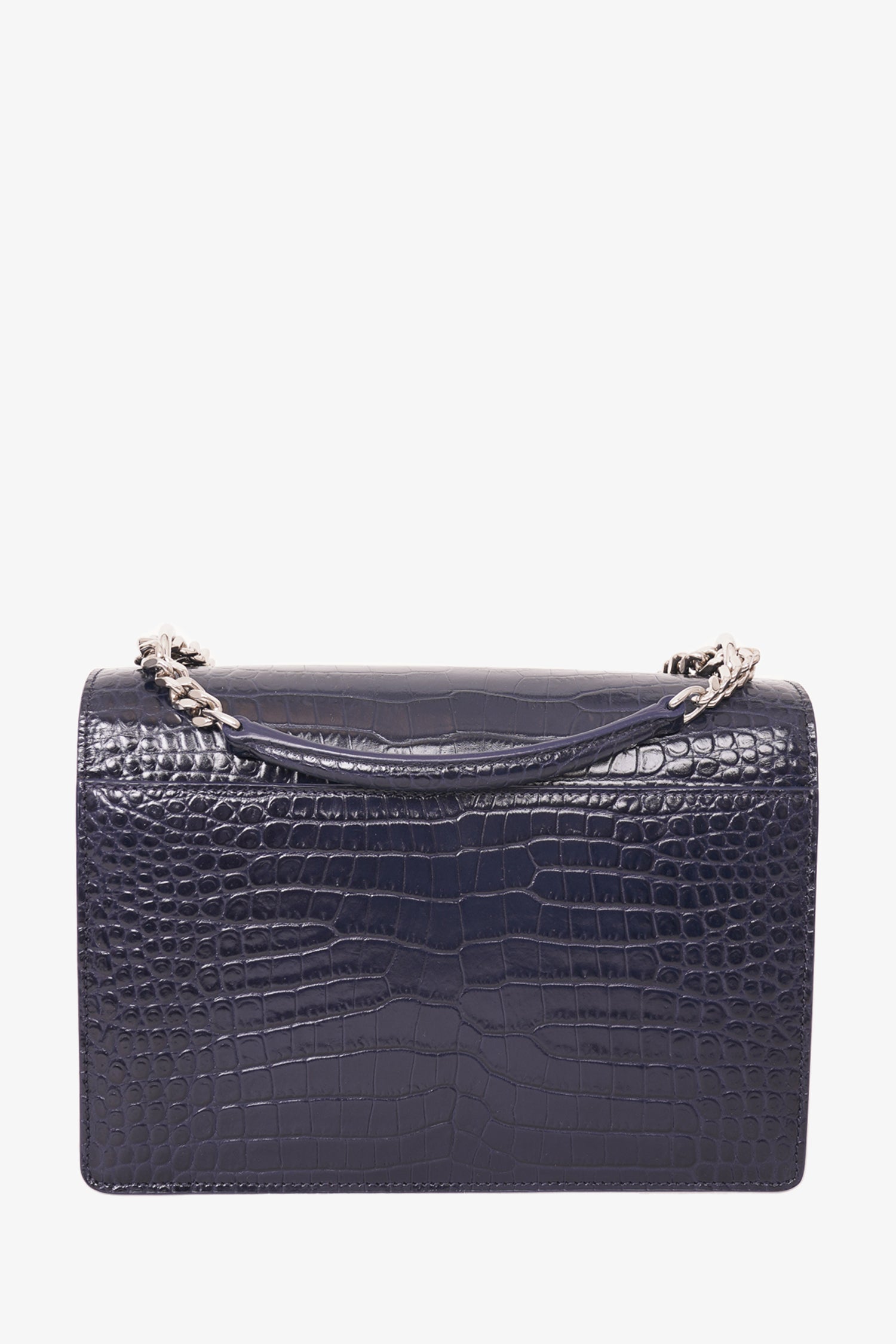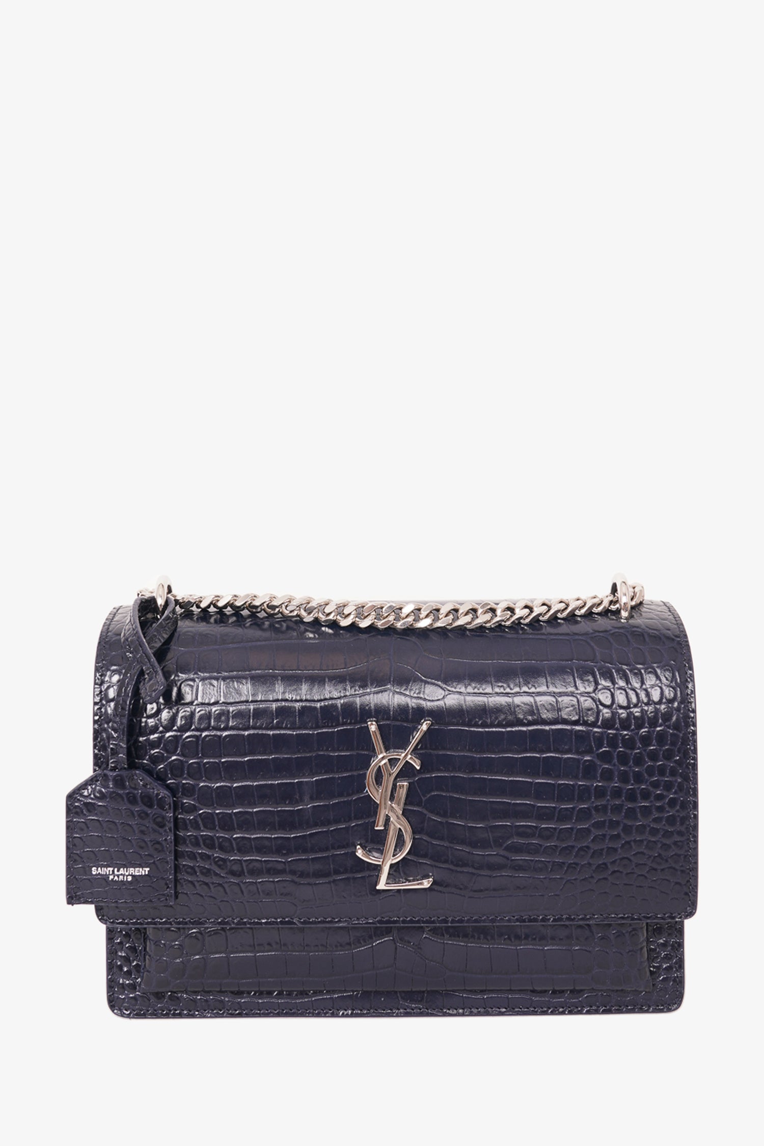 Saint Laurent Navy Croc Embossed Leather 'Sunset' Medium Crossbody Bag. Front flap with magnetic closure. Detachable leather charm. YSL logo at front. Slide-around chain handles. 2 interior compartments. Interior wall pocket. Exterior slip pocket. Silver-toned hardware. Tonal stitching.