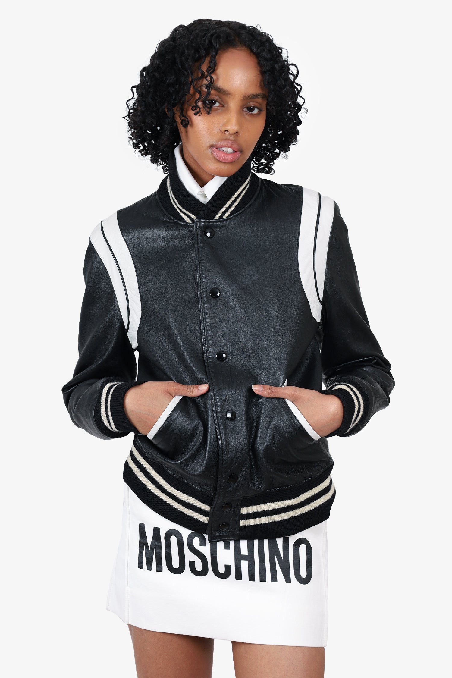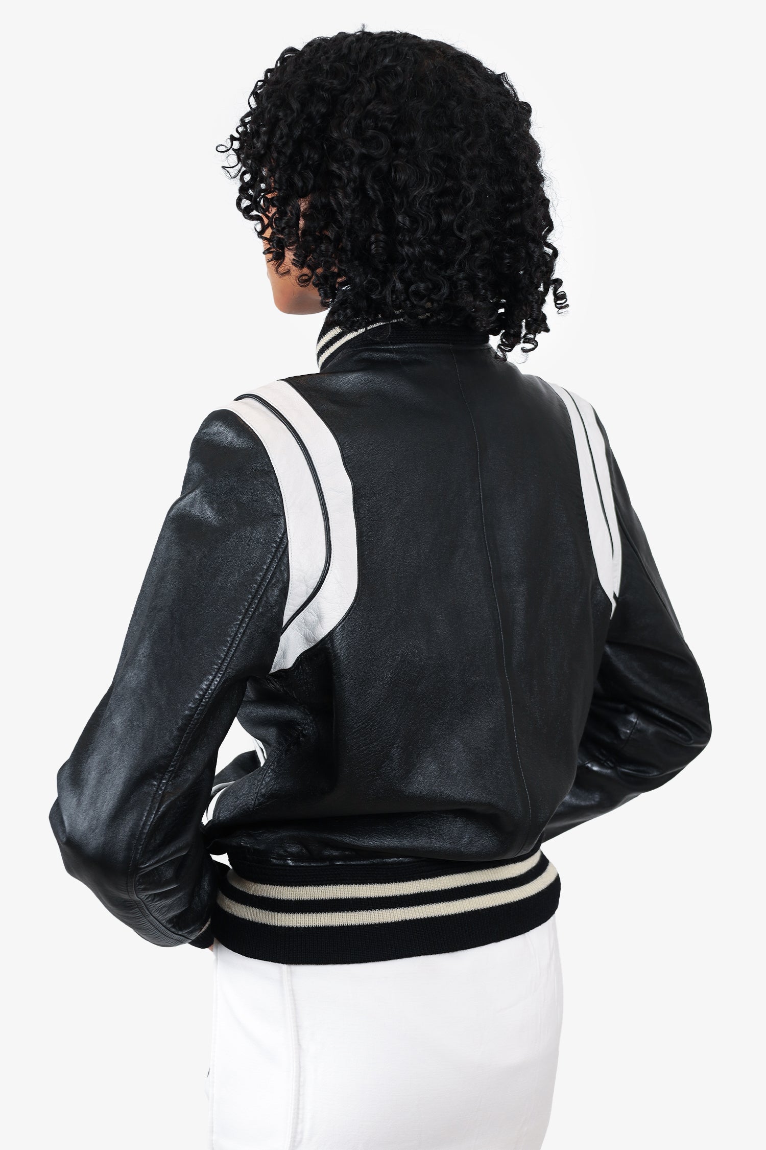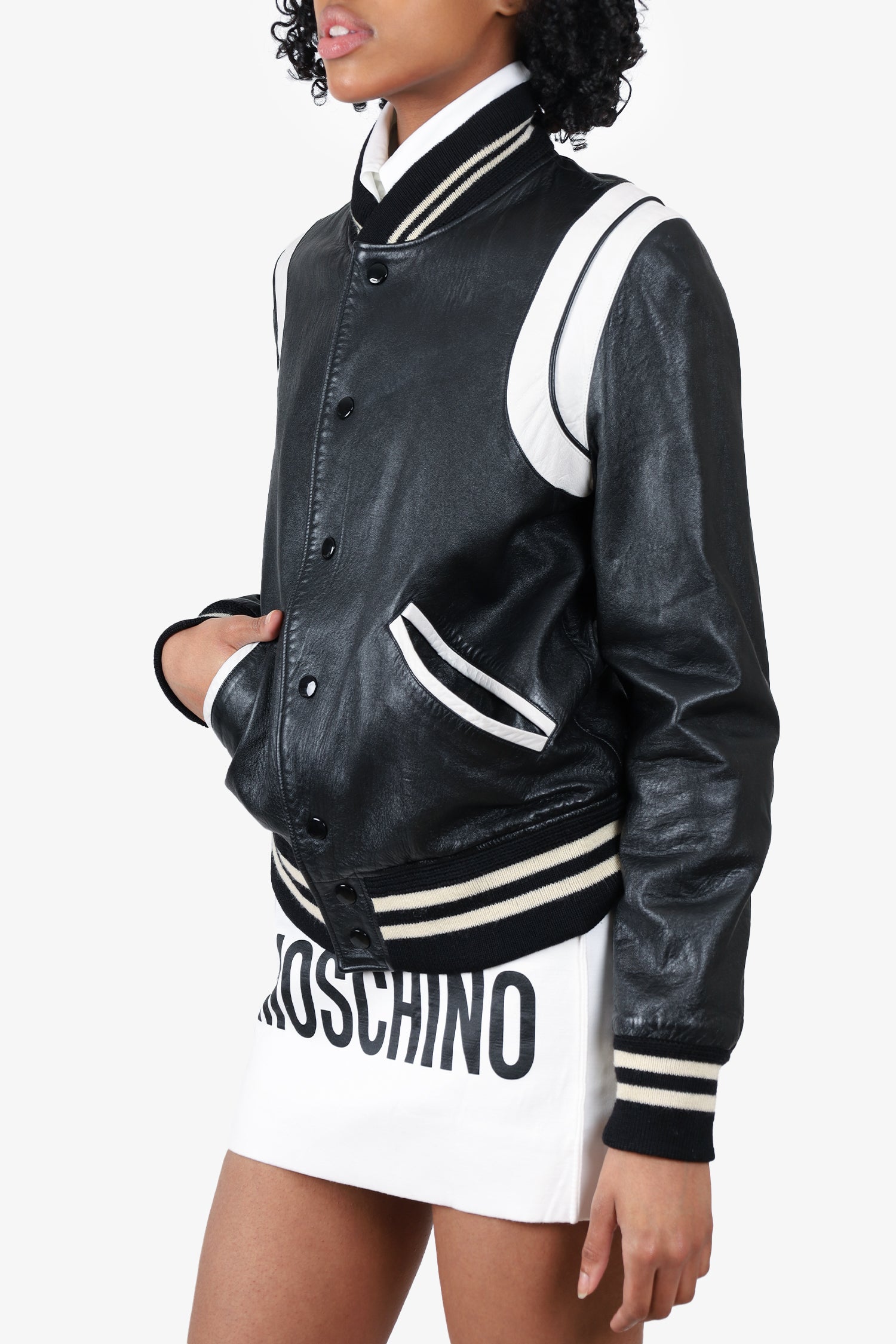 Refresh availabilitySaint Laurent Black/White Lambskin Leather Varsity Jacket. Front snap button-up closure. Front pockets. Lined. Ribbed neck, cuffs and hem. Tonal stitching.