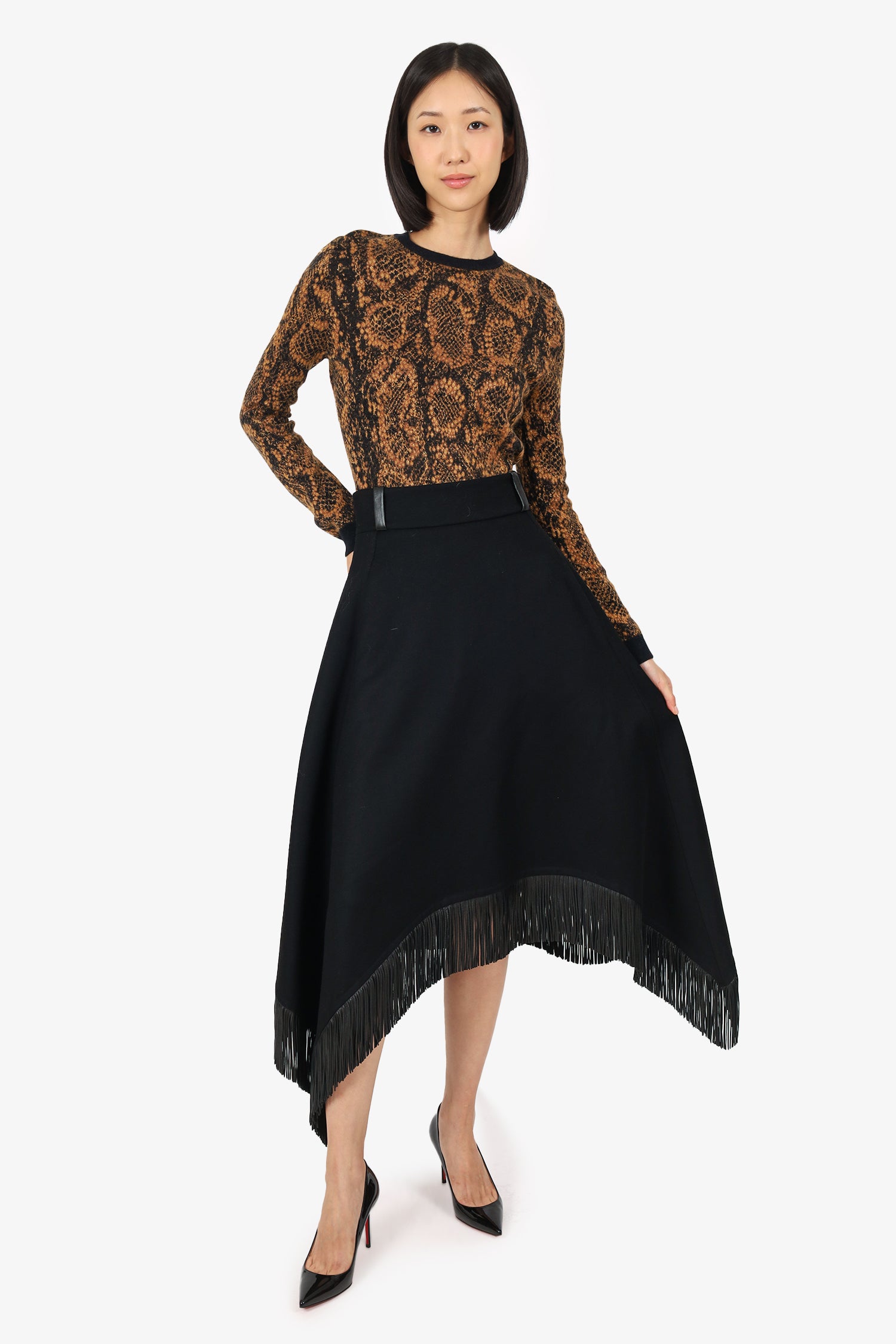 Saint Laurent Black Wool/Cashmere Asymmetric Leather-trimmed Fringe Midi Skirt Size 38