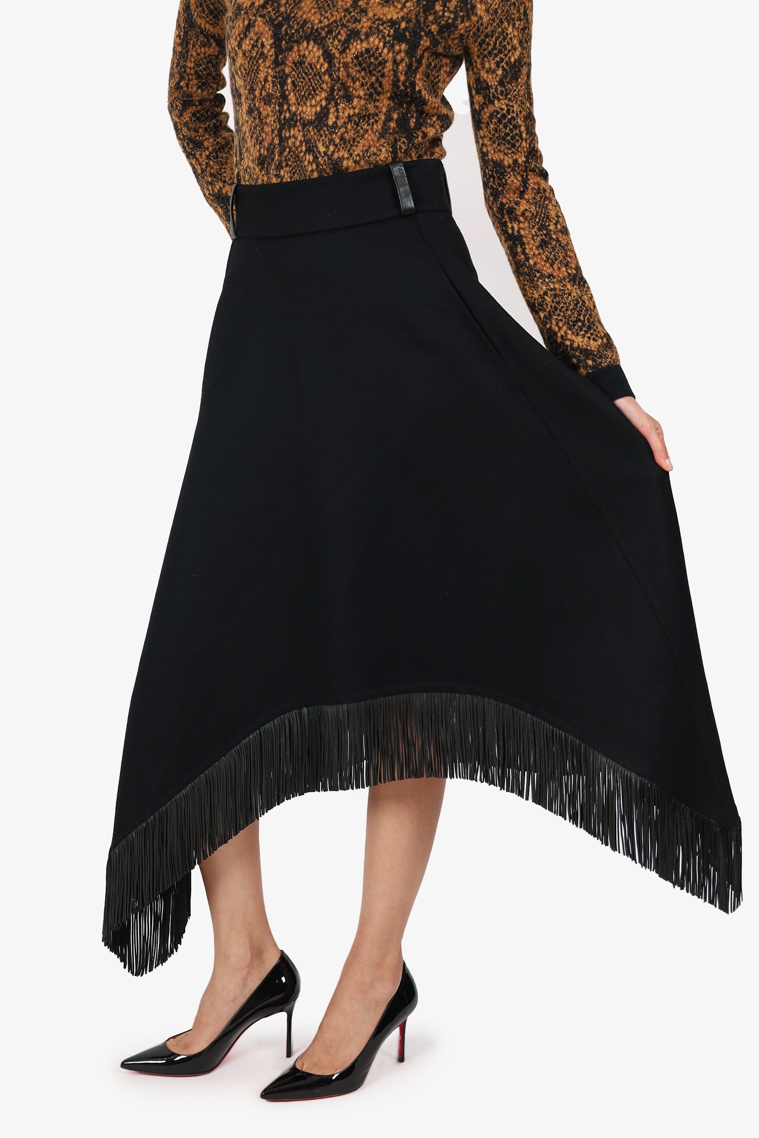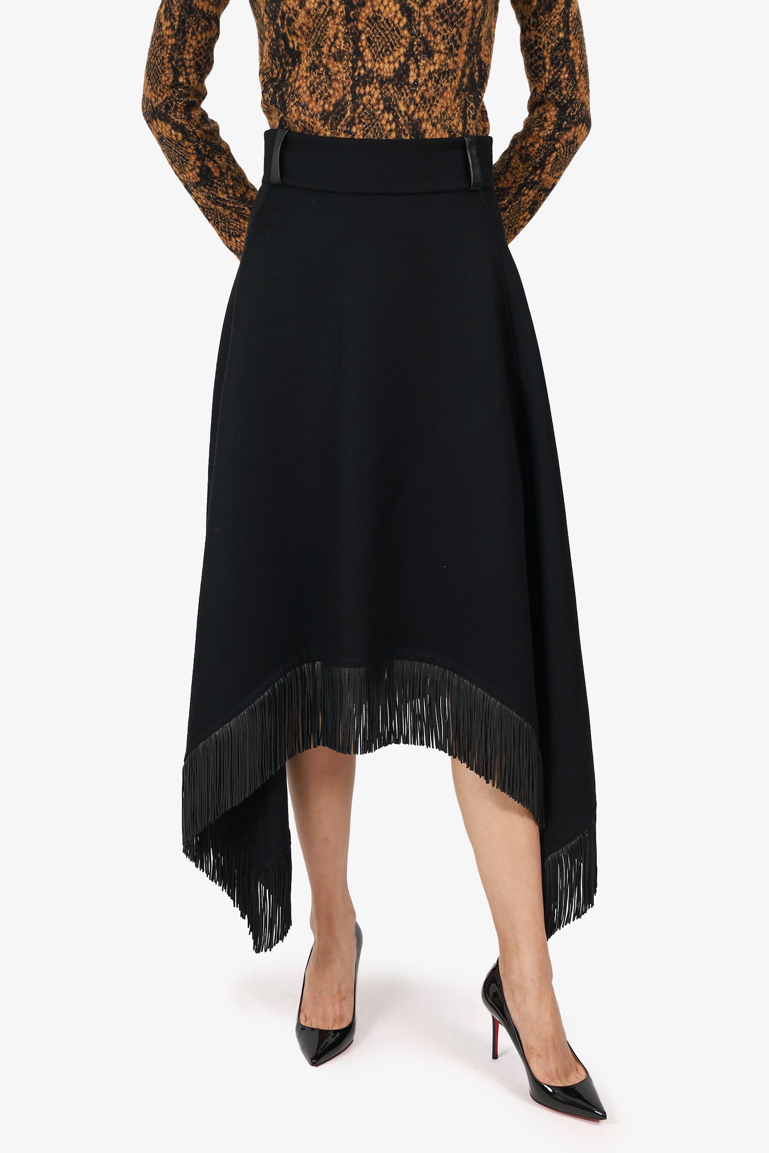 Refresh availabilitySaint Laurent Black Wool/Cashmere Asymmetric Leather-trimmed Fringe Midi Skirt. Slip-on. Rear zIp closure. 2 exterior slip pockets. Tonal stitching.