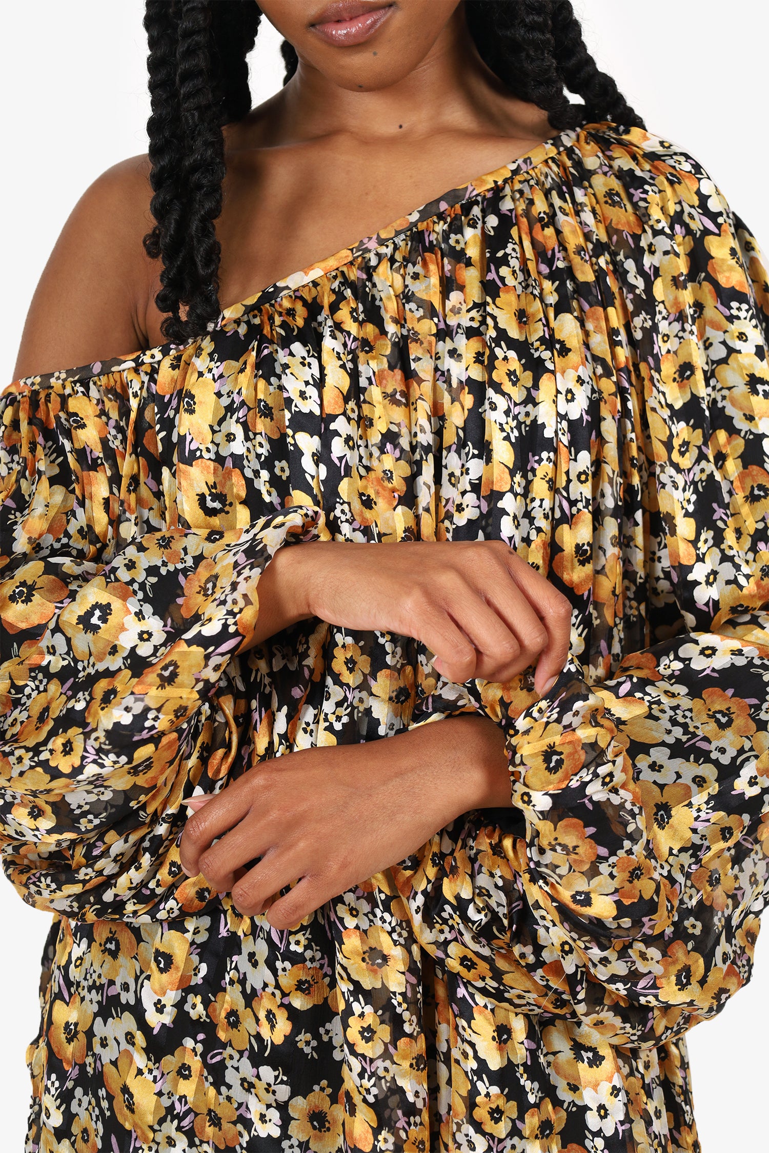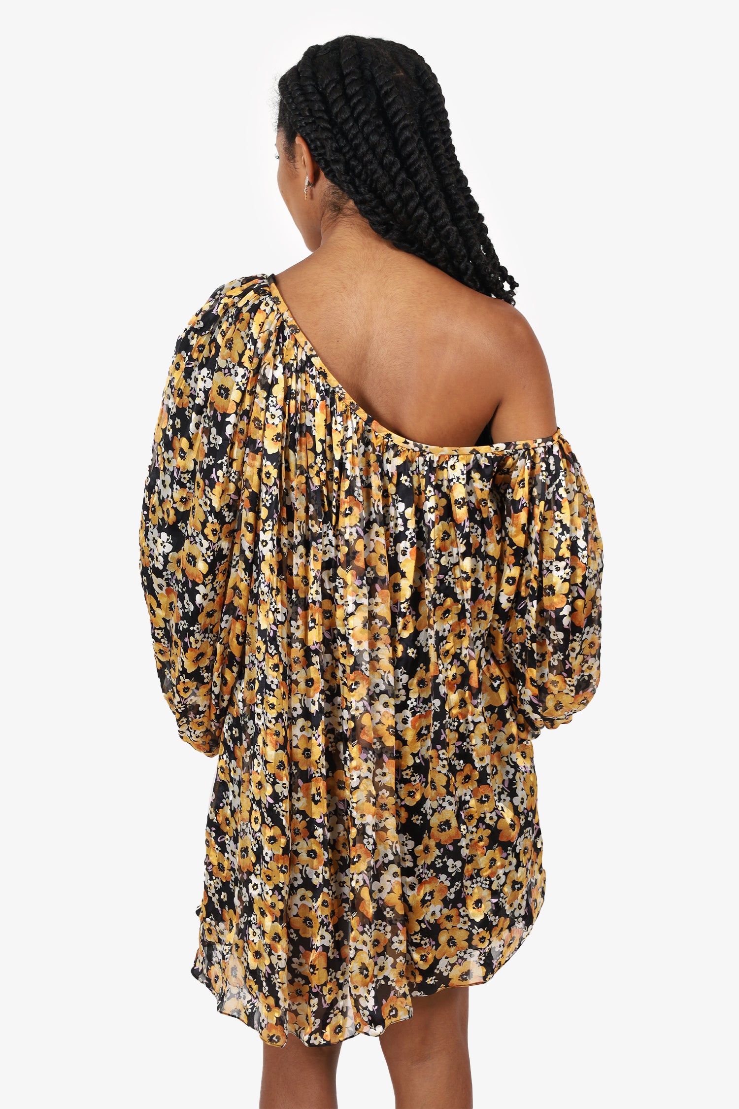 Refresh availabilitySaint Laurent Black/Yellow Silk Floral Print Puff Sleeve Mini Dress. Pull-on. Off-the-shoulder neckline. 2 side slip pockets. Lined interior. Tonal stitching.