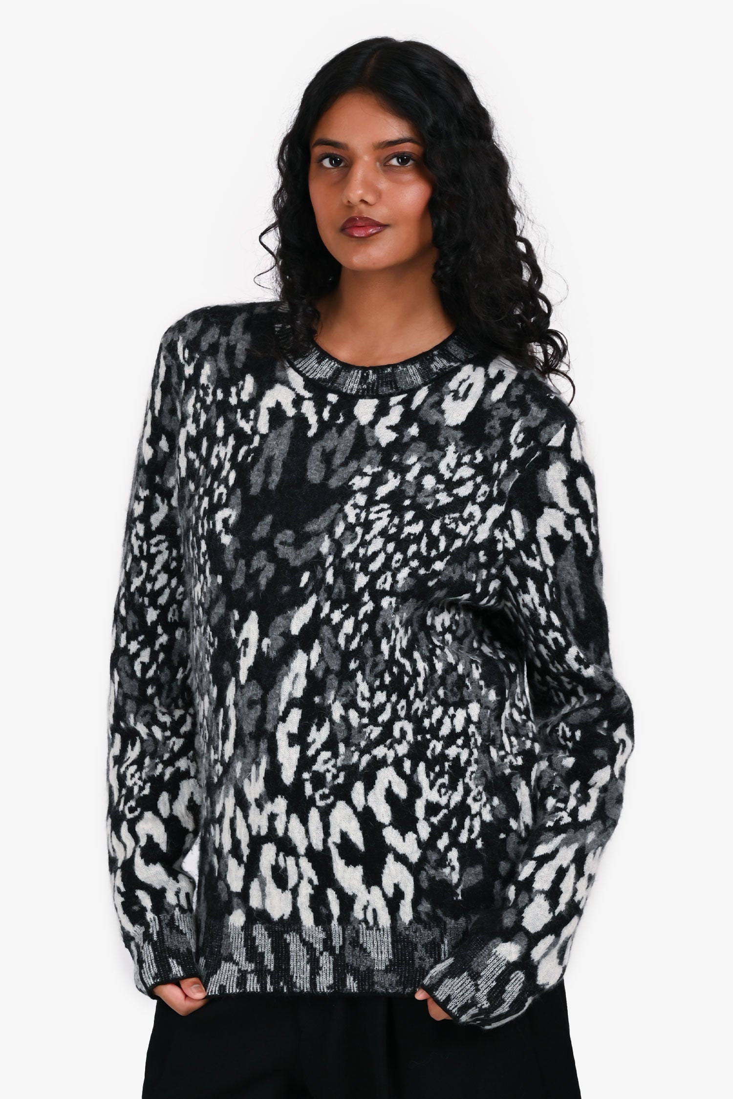 Refresh availabilitySaint Laurent Black/Grey Wool Blend Animal Print Crew Neck Sweater. Pull-on. Round neckline. Ribbed neckline, cuffs, and hem. Tonal stitching.